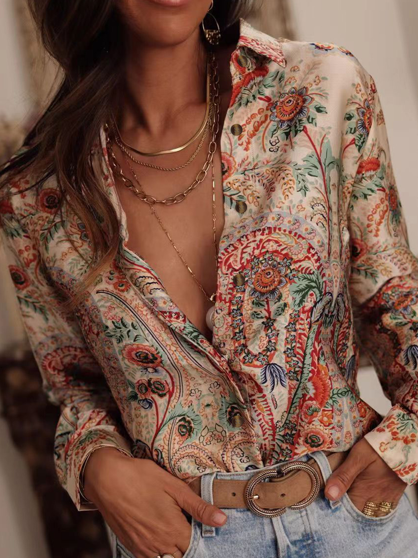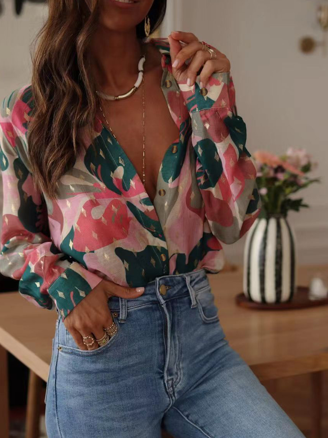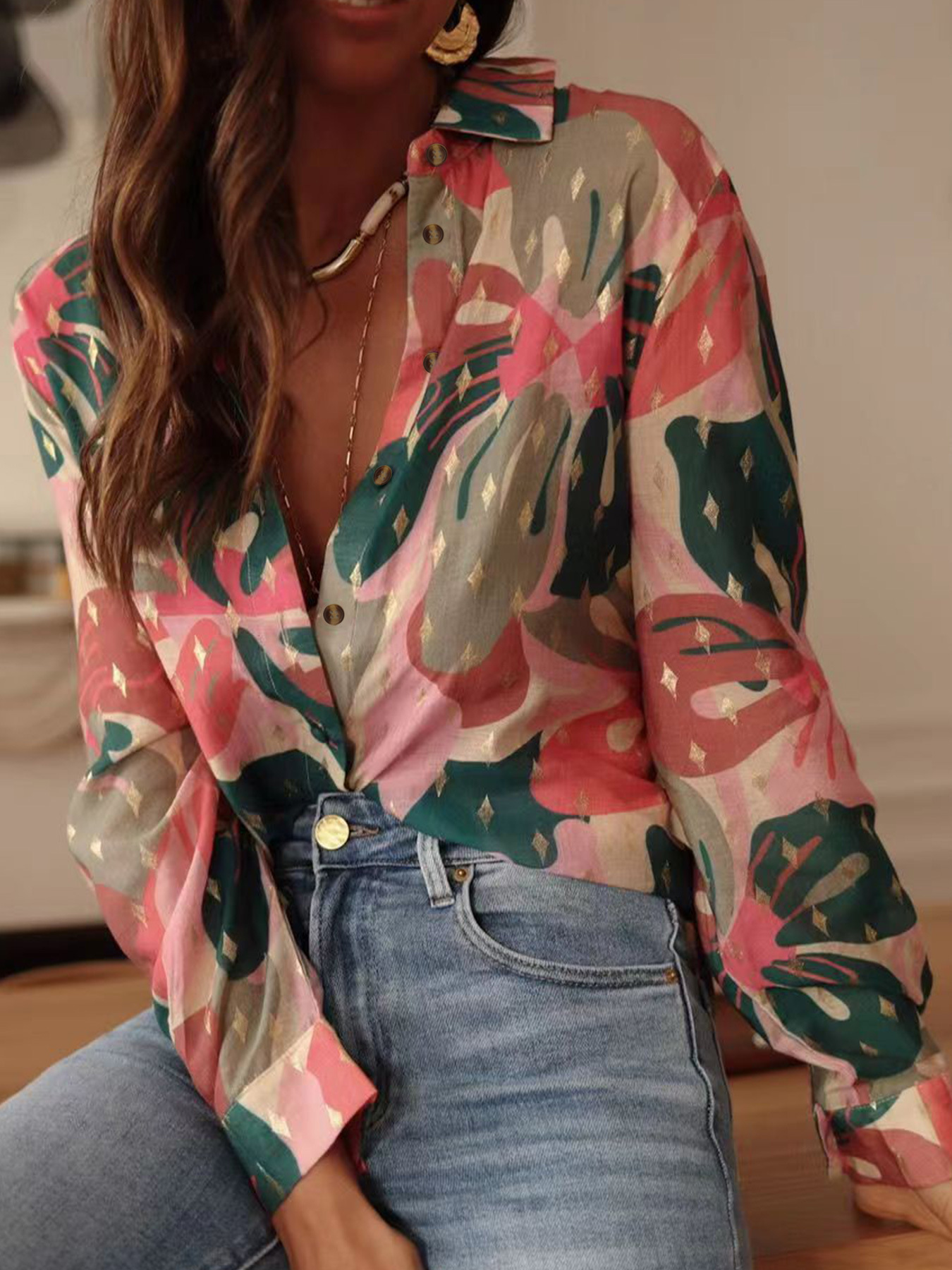 국경 유럽과 미국의 우아한 캐주얼 여름 새로운 긴 소매 인쇄 옷깃 셔츠 캐주얼 휴가 여성 셔츠스토어 가기