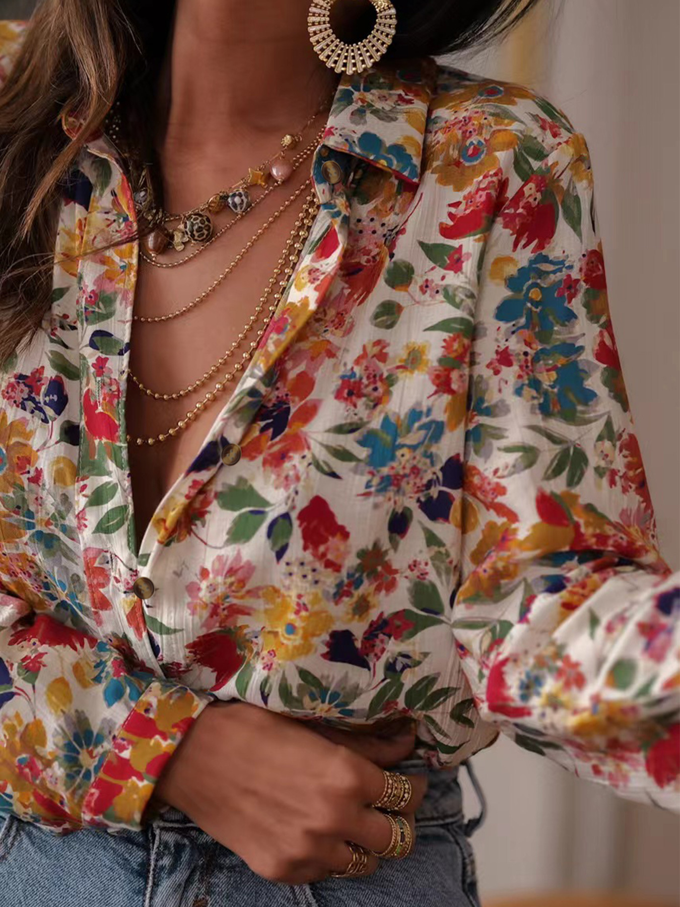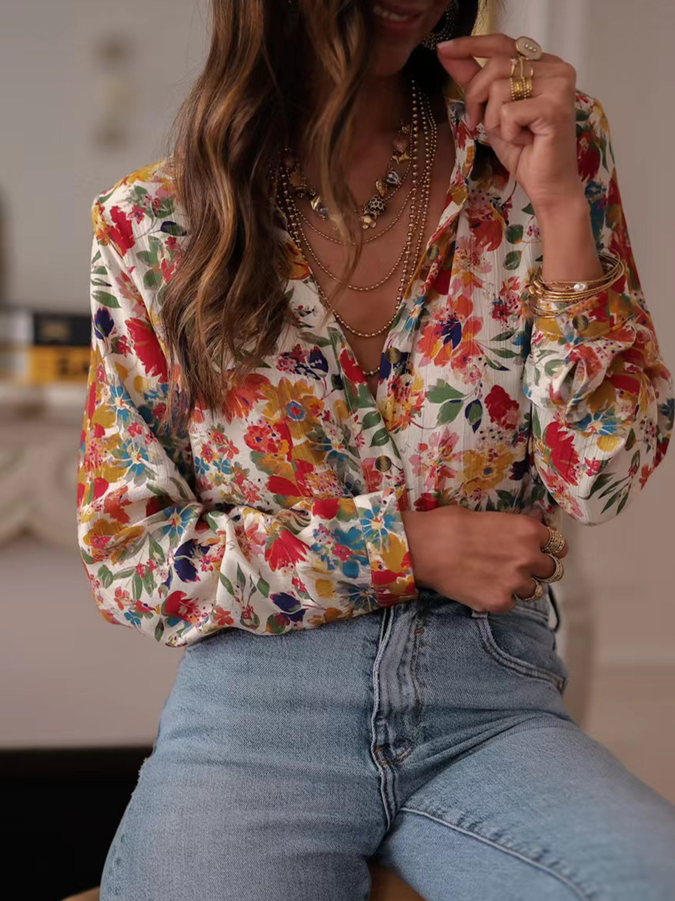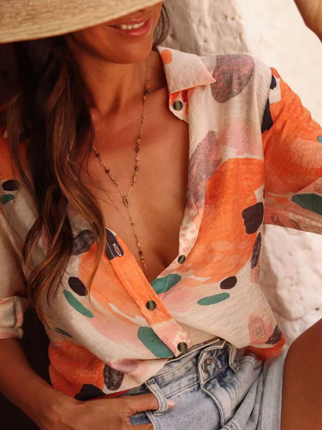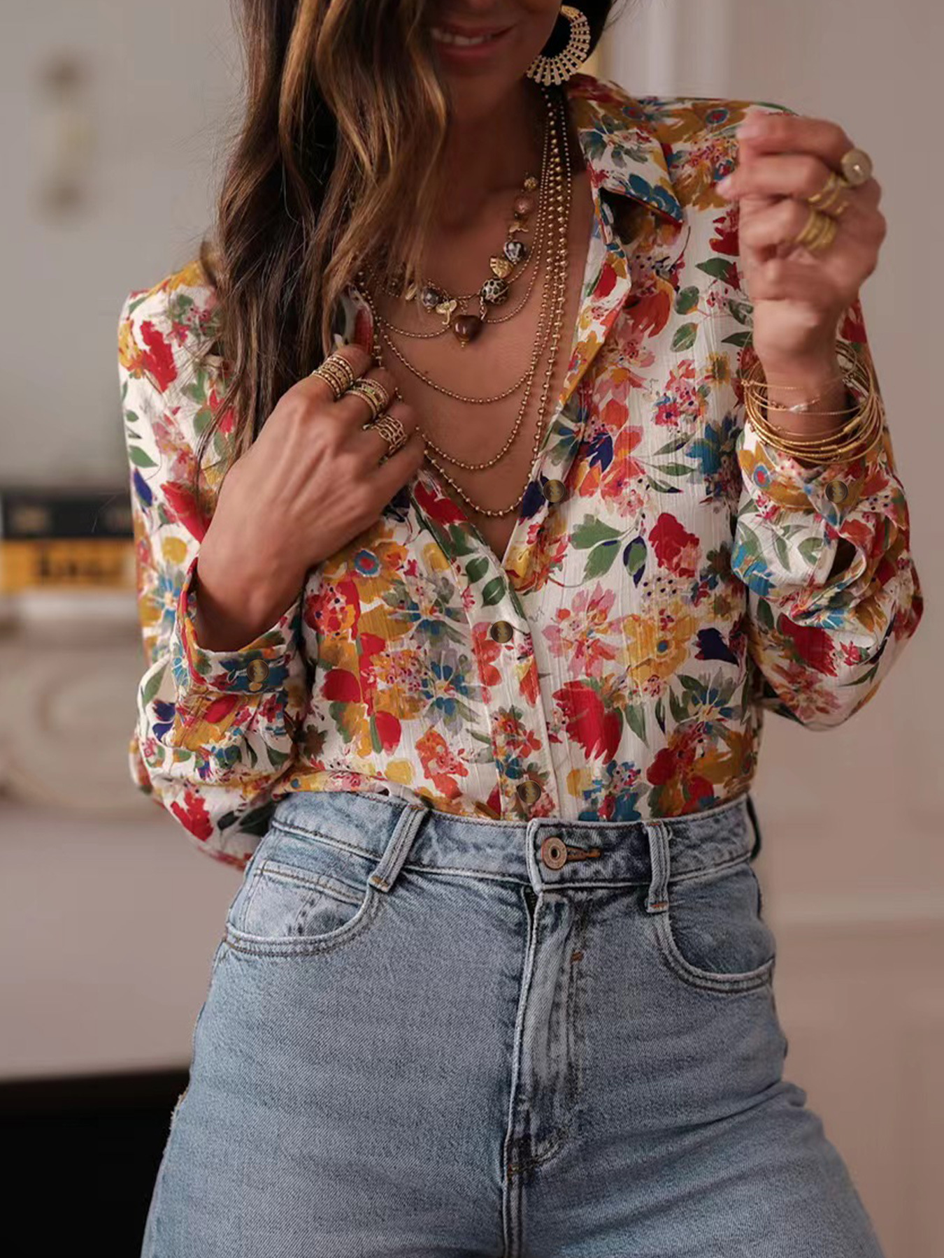 국경 유럽과 미국의 우아한 캐주얼 여름 새로운 긴 소매 인쇄 옷깃 셔츠 캐주얼 휴가 여성 셔츠스토어 가기