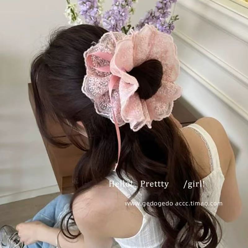• 핑크 거즈 레이스 드로스트링 머리끈