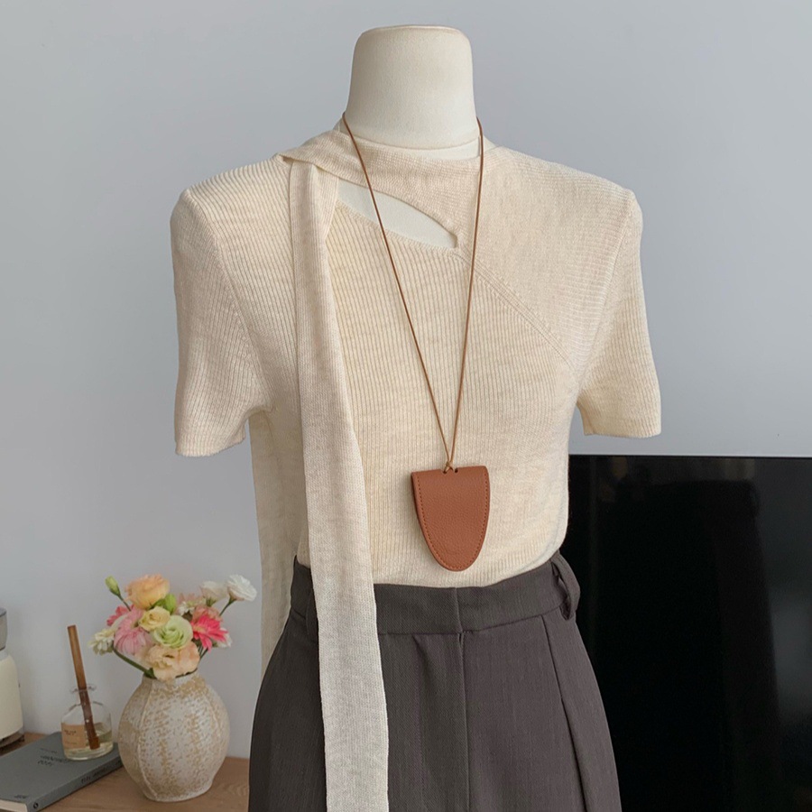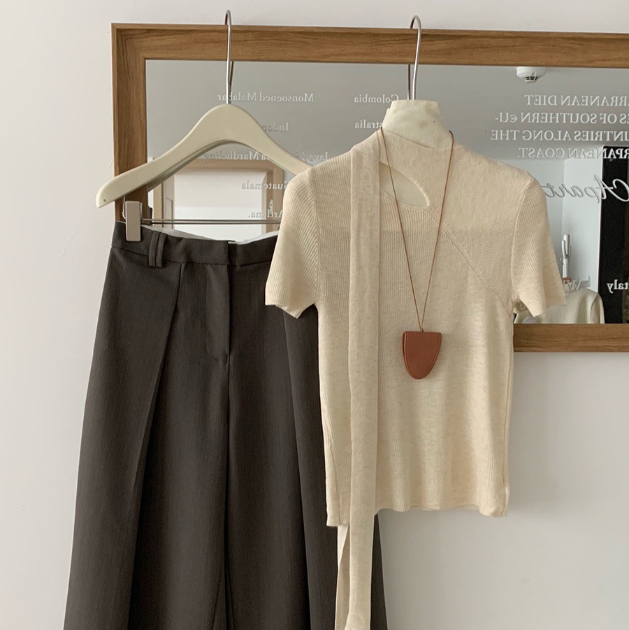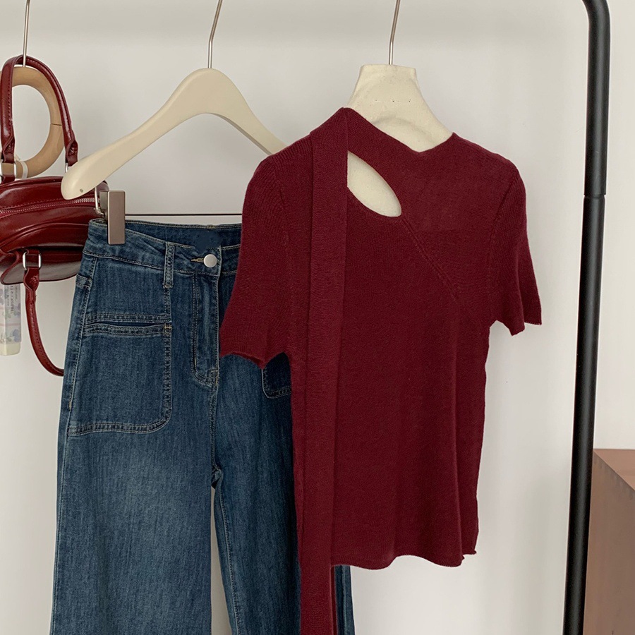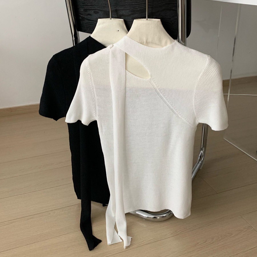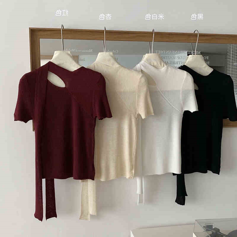 2025 봄 홀터넥 중공 스웨터 여성 반팔 디자인 틈새 슬림 피팅 셔츠 프렌치 시크 탑스토어 가기