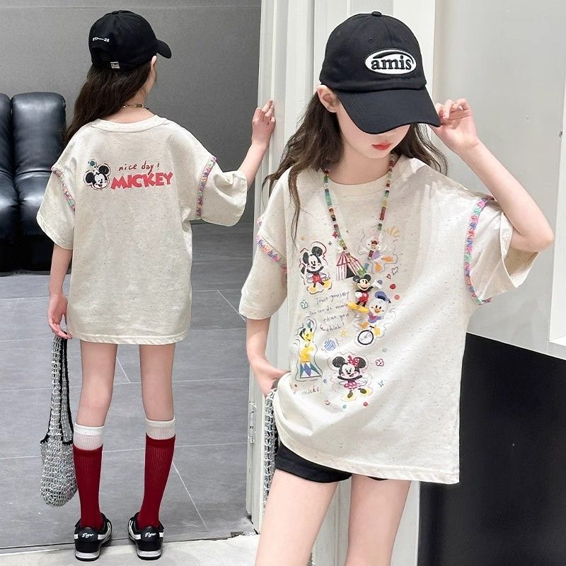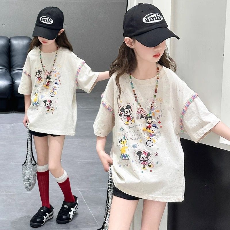 롱 코튼 걸스 여름 반팔 2025 새로운 한국식 빅 키즈 만화 인쇄 귀여운 루즈 탑스토어 가기