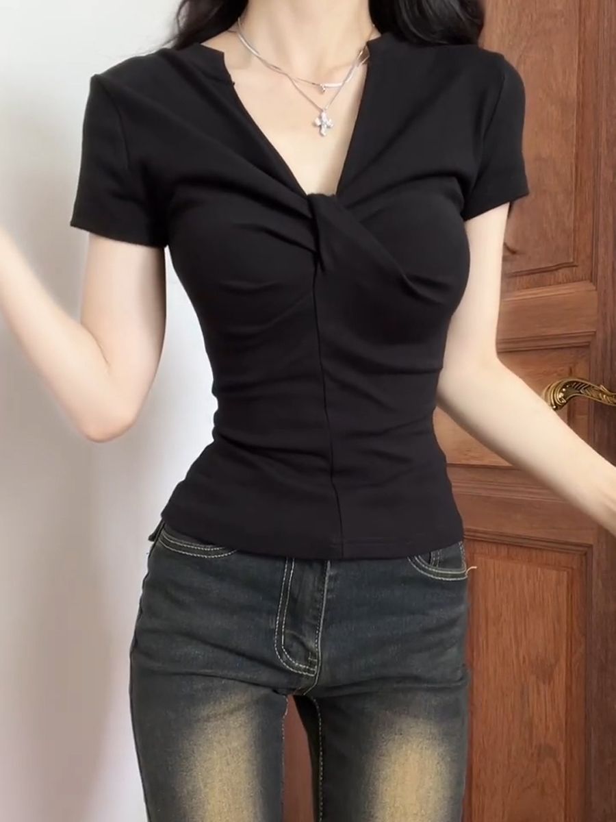 모달 순수한 욕망 V-Neck Kink 디자인 어깨 반팔 티셔츠 여성용 2025 여름 슬림핏 어깨 스파이스 걸 탑스토어 가기