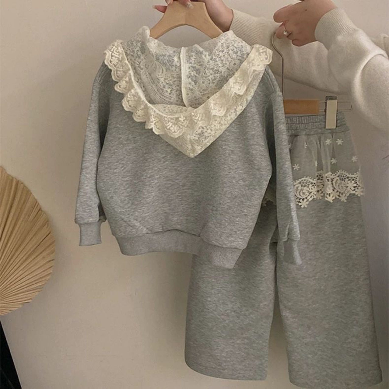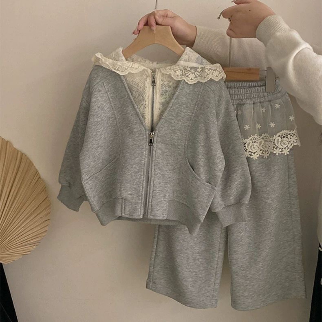 소녀 봄과 가을 세트 새로운 후드 스웨터 캐주얼 레이스 카디건 재킷 바느질 바지 투피스 세트
