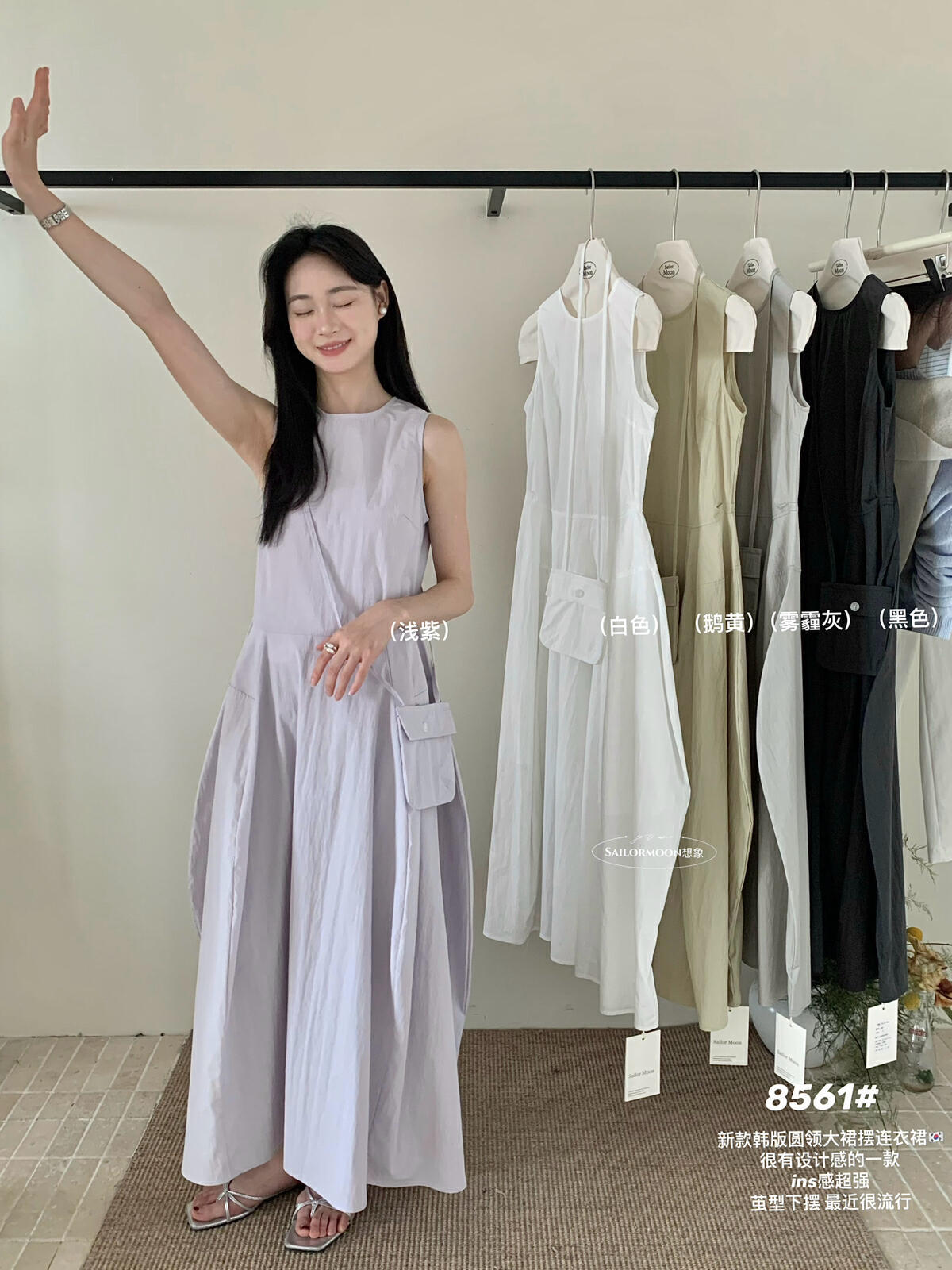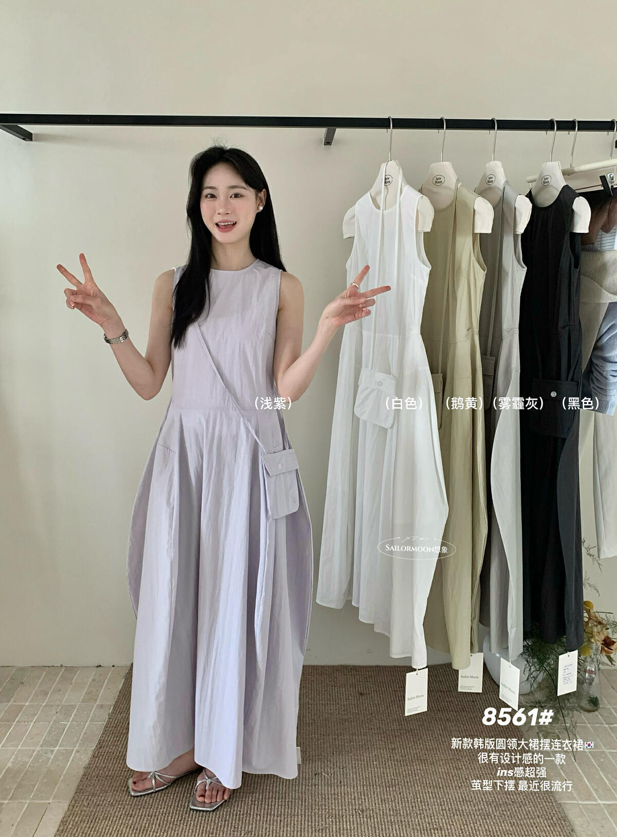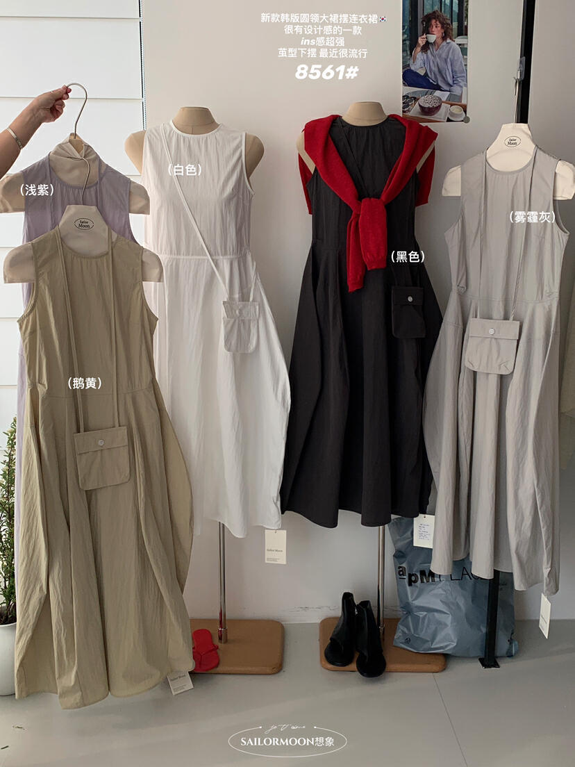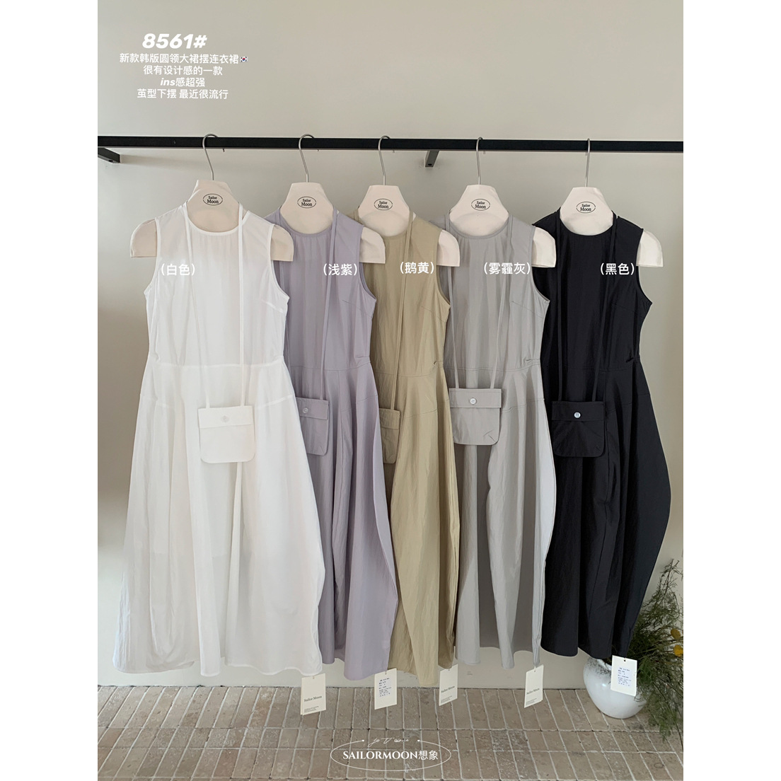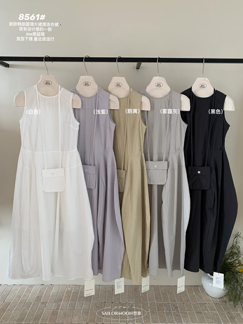 재고정리 무반품 상상의 여름 라운드넥 루즈핏 솔리드 컬러 롱 민소매 캐주얼 원피스 여성용 부드러운 8561