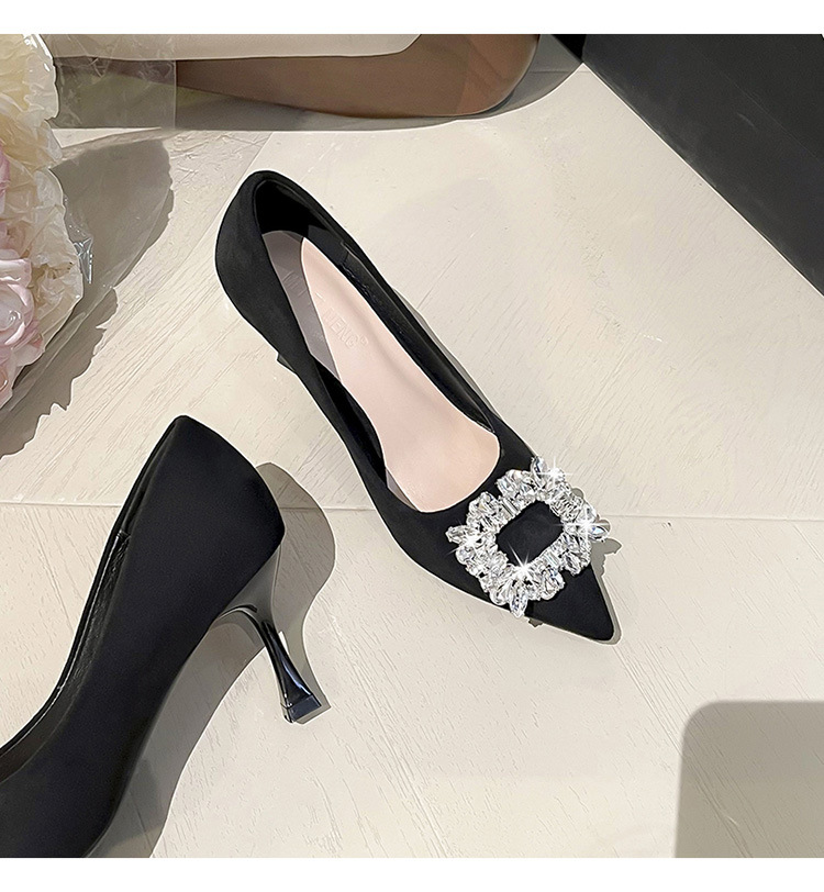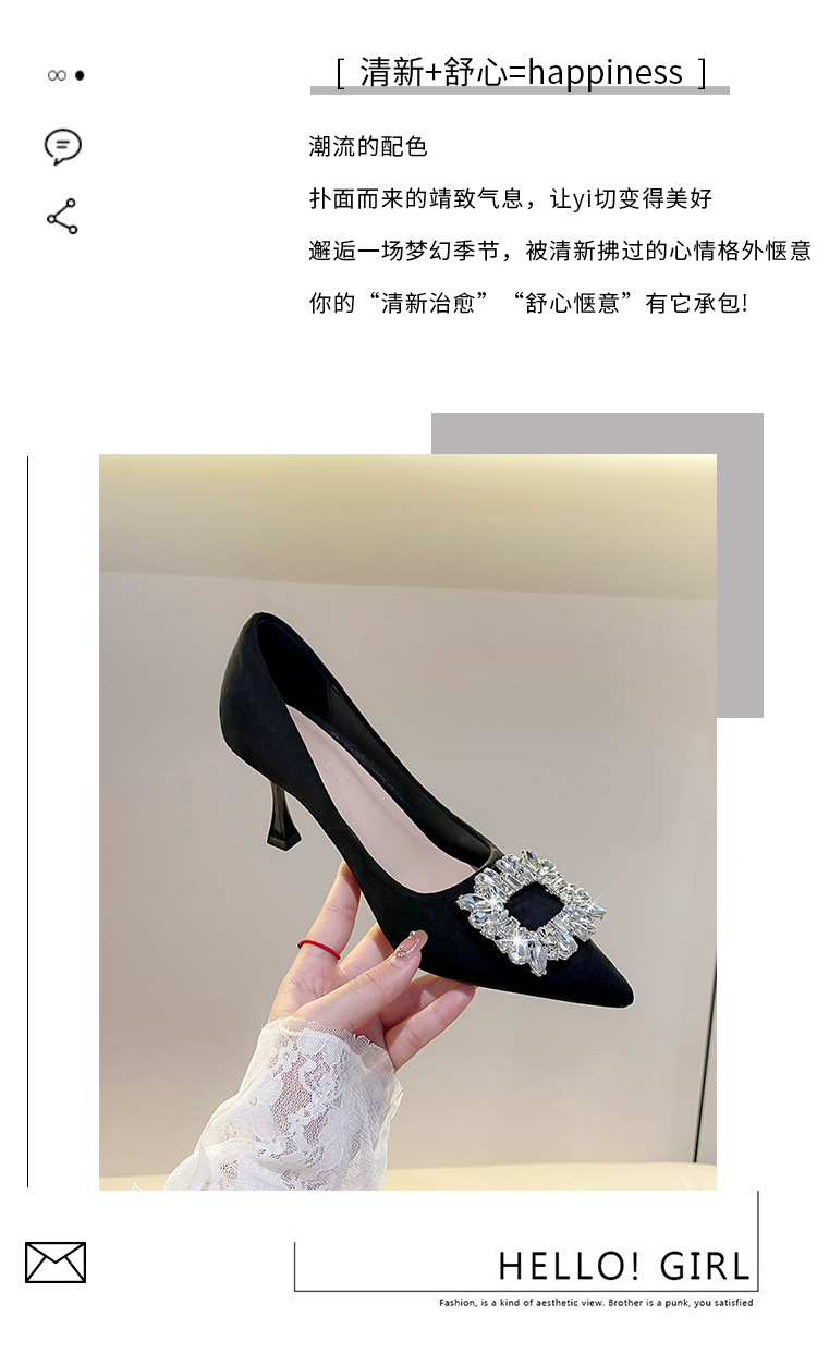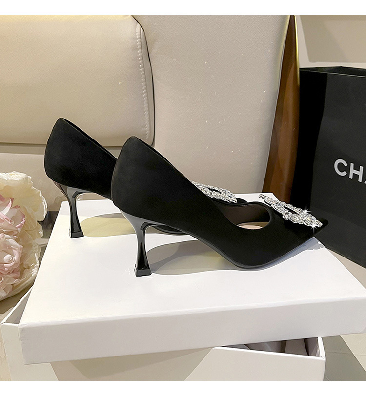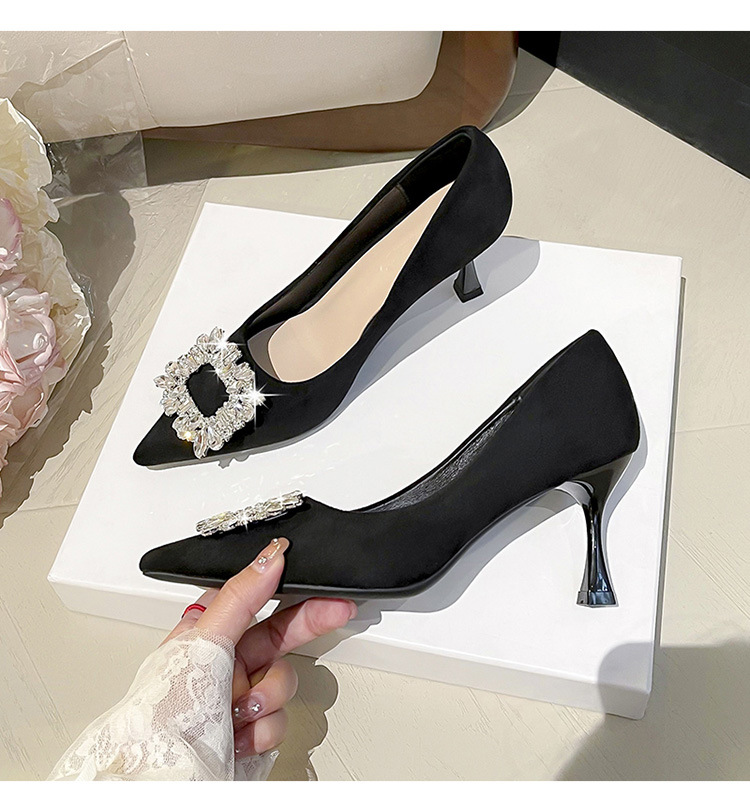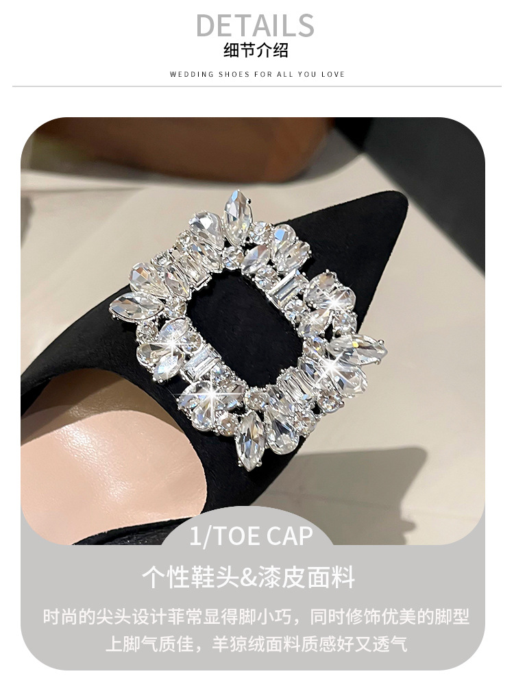 뾰족한 하이힐 스웨이드 2025 봄 새로운 도착 라인스톤 스퀘어 버클 올 매치 얇은 힐 라이트 럭셔리 우아한 싱글 레이어 신발 여성용 틈새스토어 가기