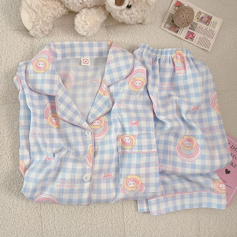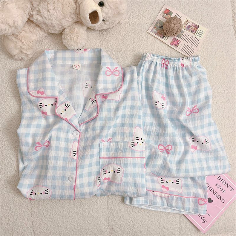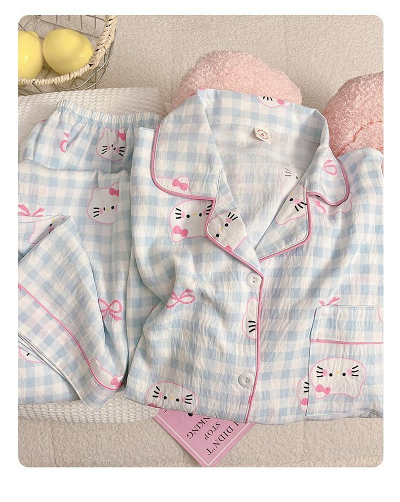 구름면 만화 키티 잠옷 여성의 봄과 가을 긴 소매 Ins 스타일 일본 스타일 귀여운 격자 무늬 여름 홈 옷