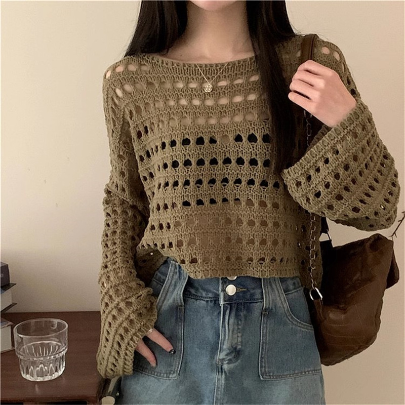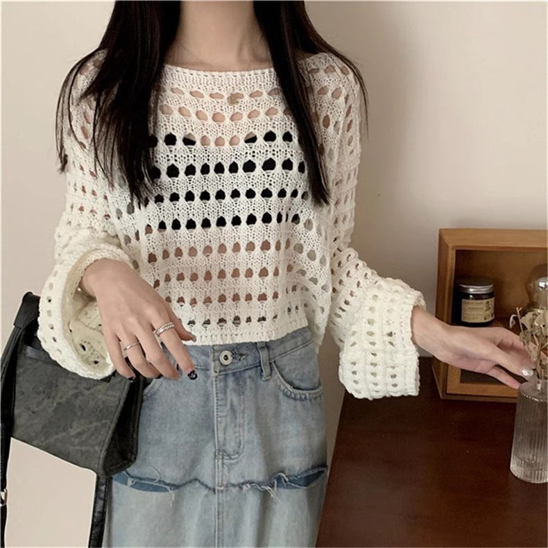 여름 느슨한 게으른 스타일 트럼펫 소매 에어컨 셔츠 빈 얇은 통기성 블라우스 메쉬 여성용 짧은 니트 탑스토어 가기