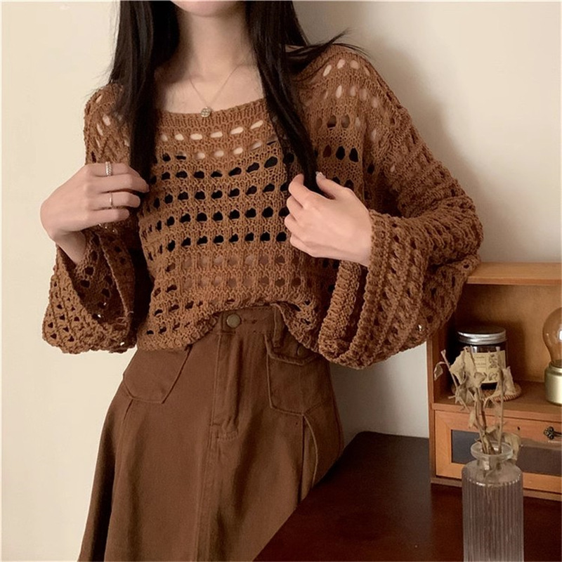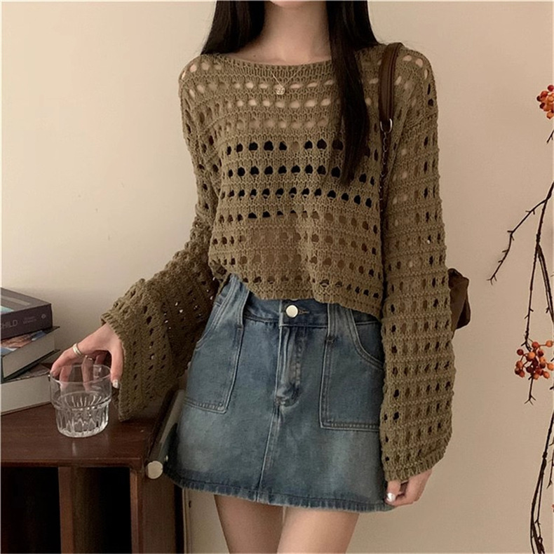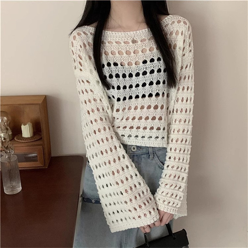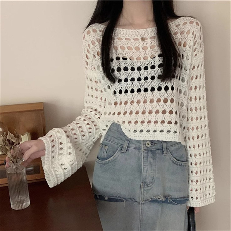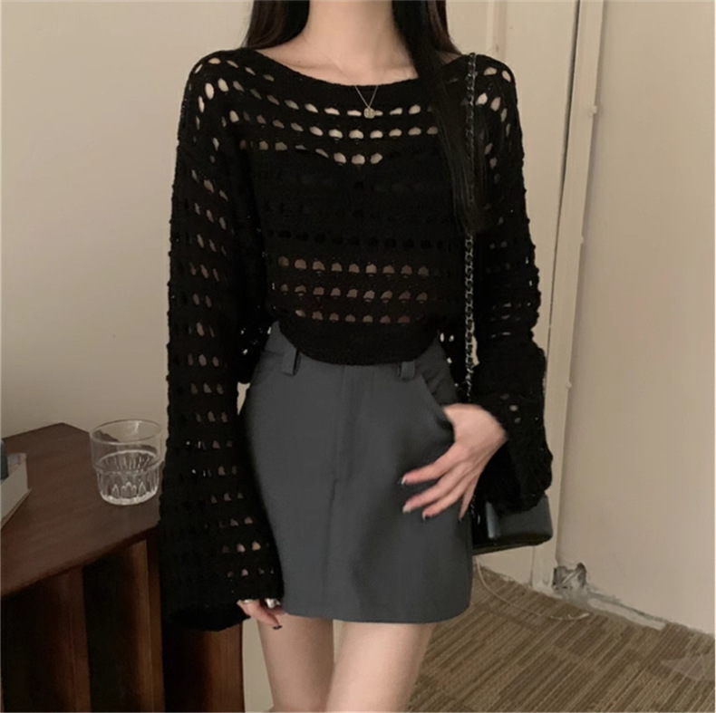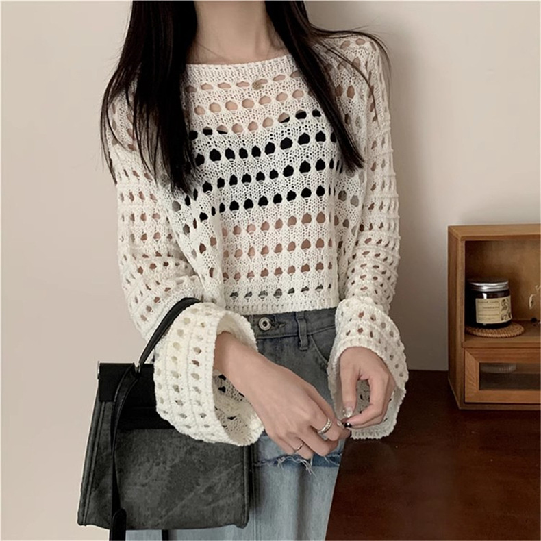 여름 느슨한 게으른 스타일 트럼펫 소매 에어컨 셔츠 빈 얇은 통기성 블라우스 메쉬 여성용 짧은 니트 탑