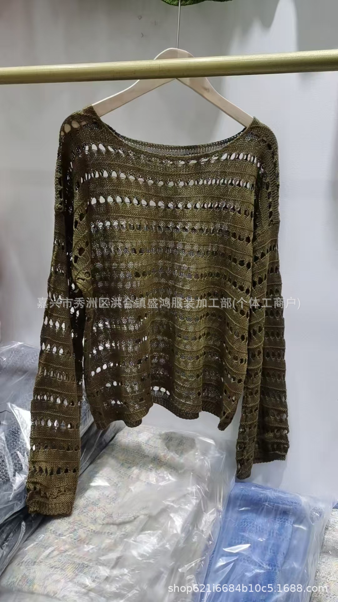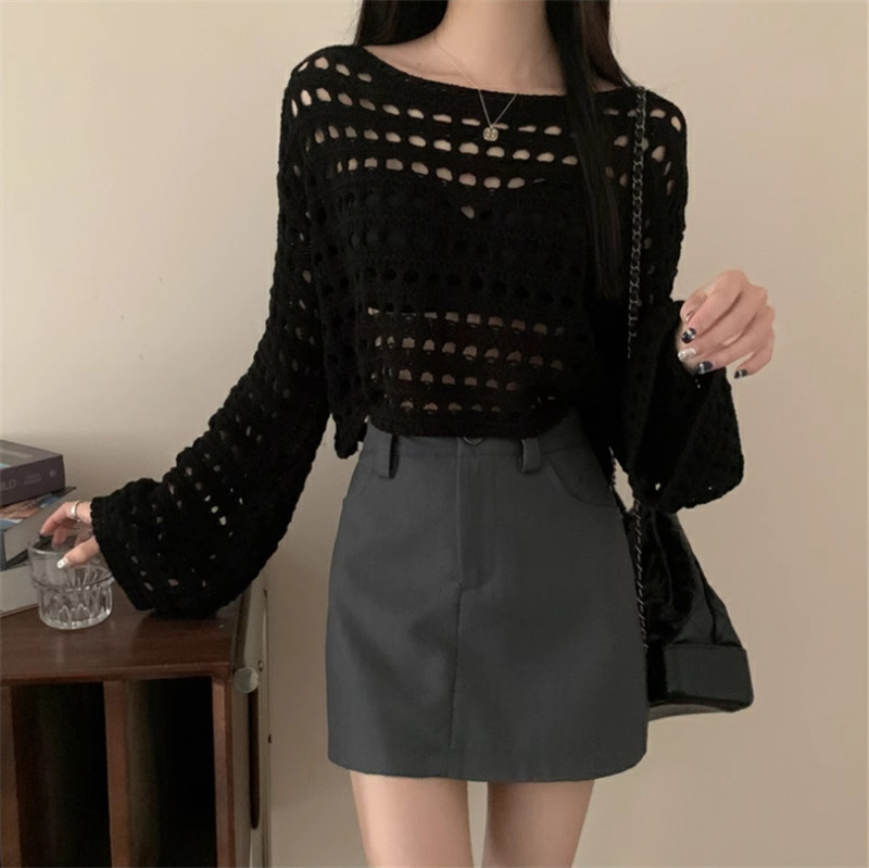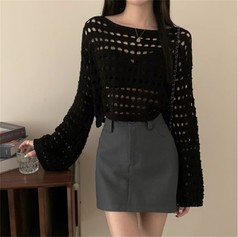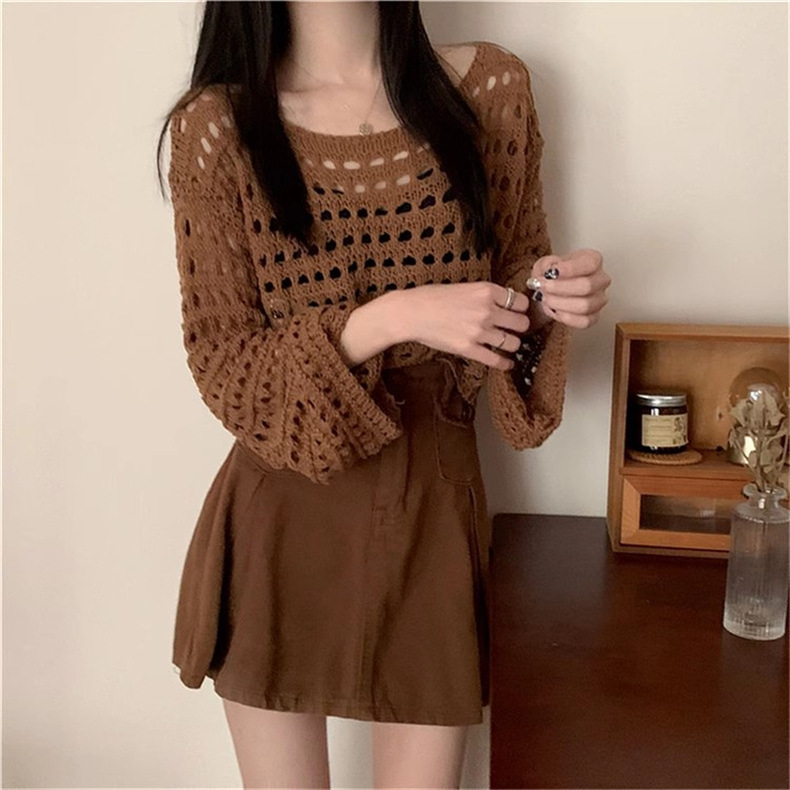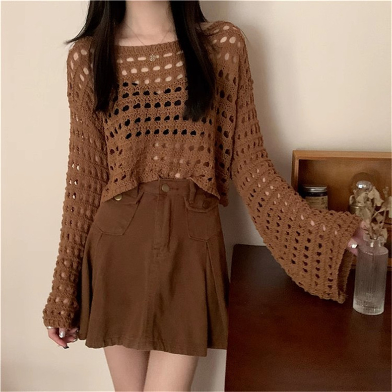 여름 느슨한 게으른 스타일 트럼펫 소매 에어컨 셔츠 빈 얇은 통기성 블라우스 메쉬 여성용 짧은 니트 탑