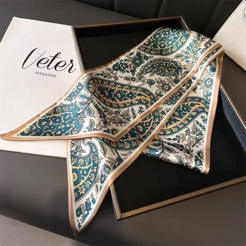 • 베벨 실크 스카프 # 체인 가지와 잎 블루