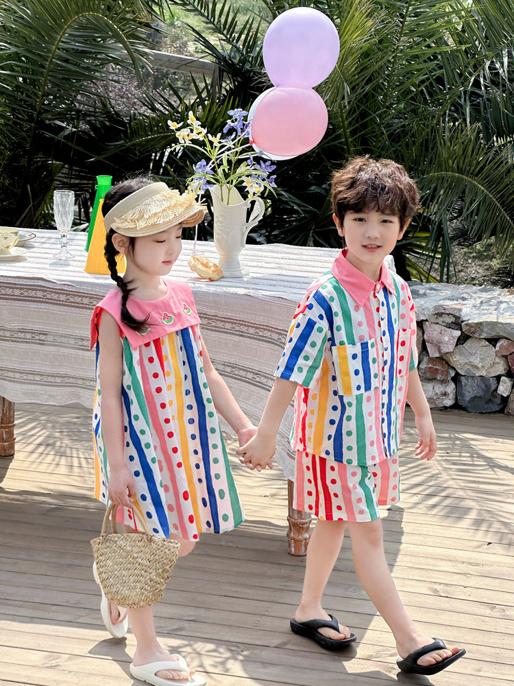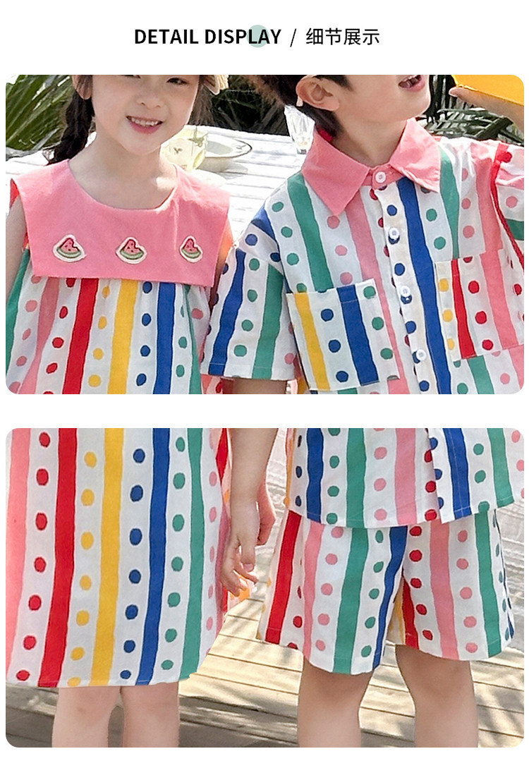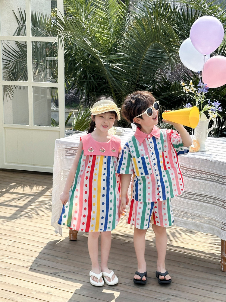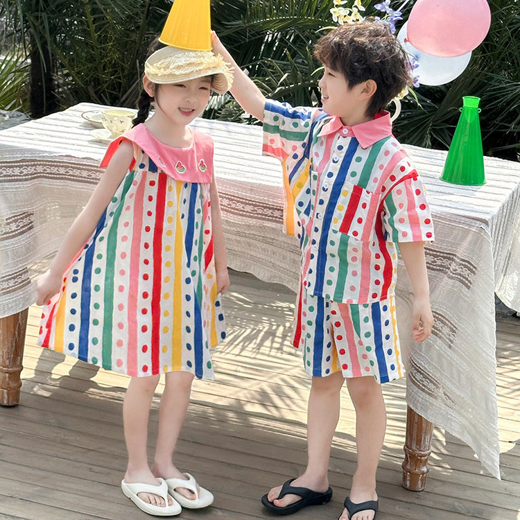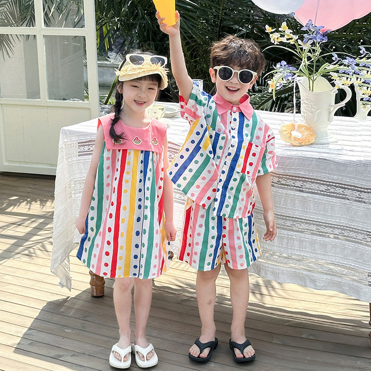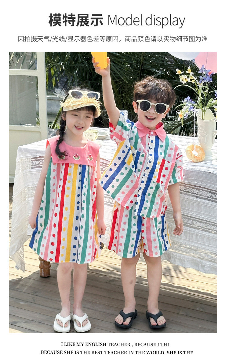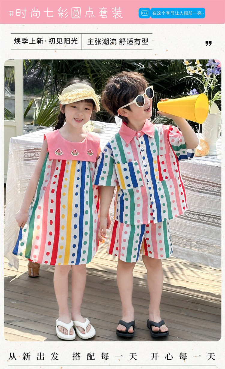 여름 새 소년과 소녀 무지개 웨이브 도트 인쇄 양복 25 년 셔츠 드레스 형제와 자매 여름 새 양복스토어 가기