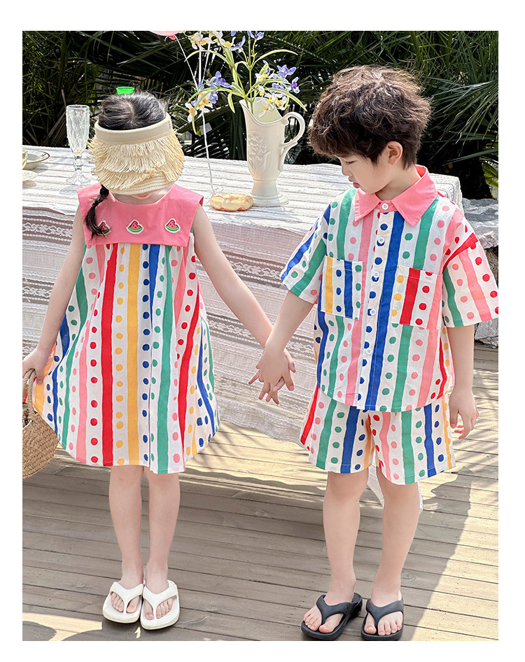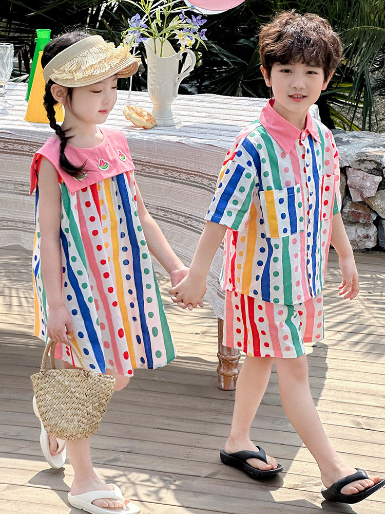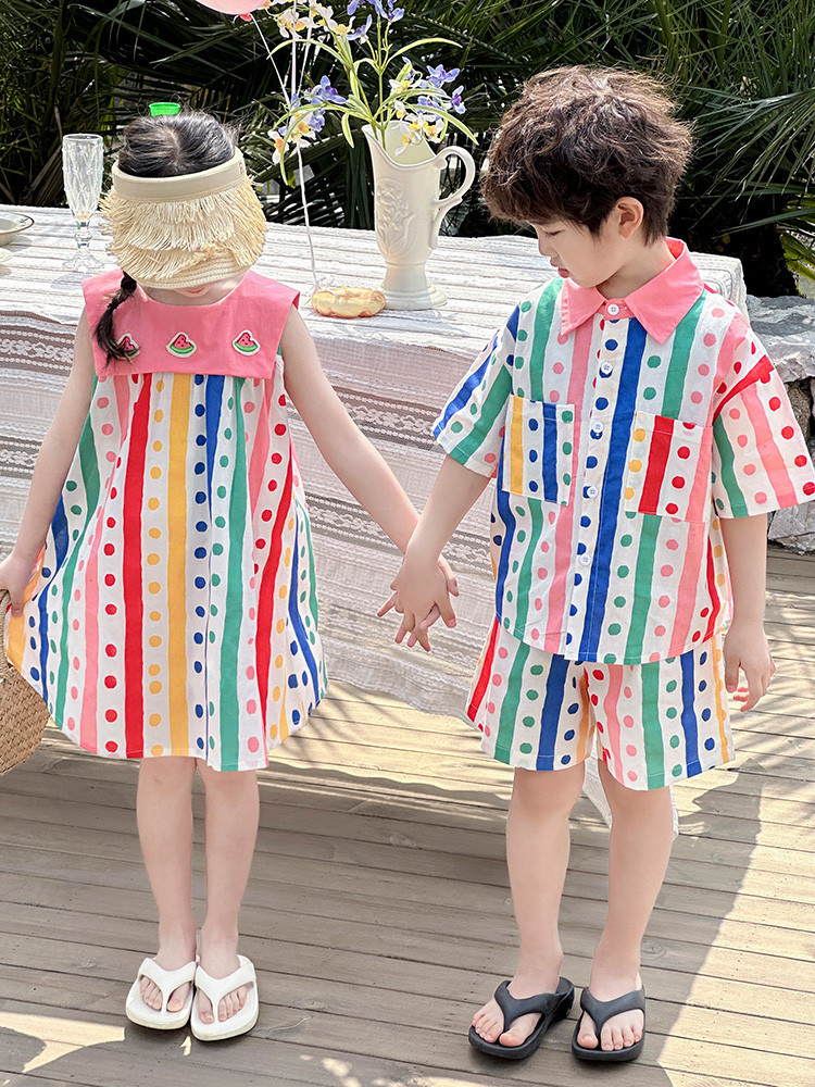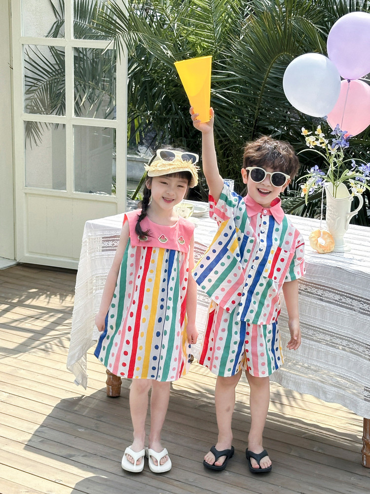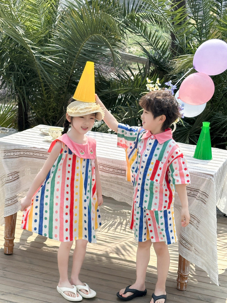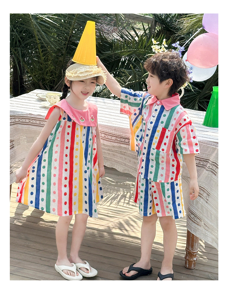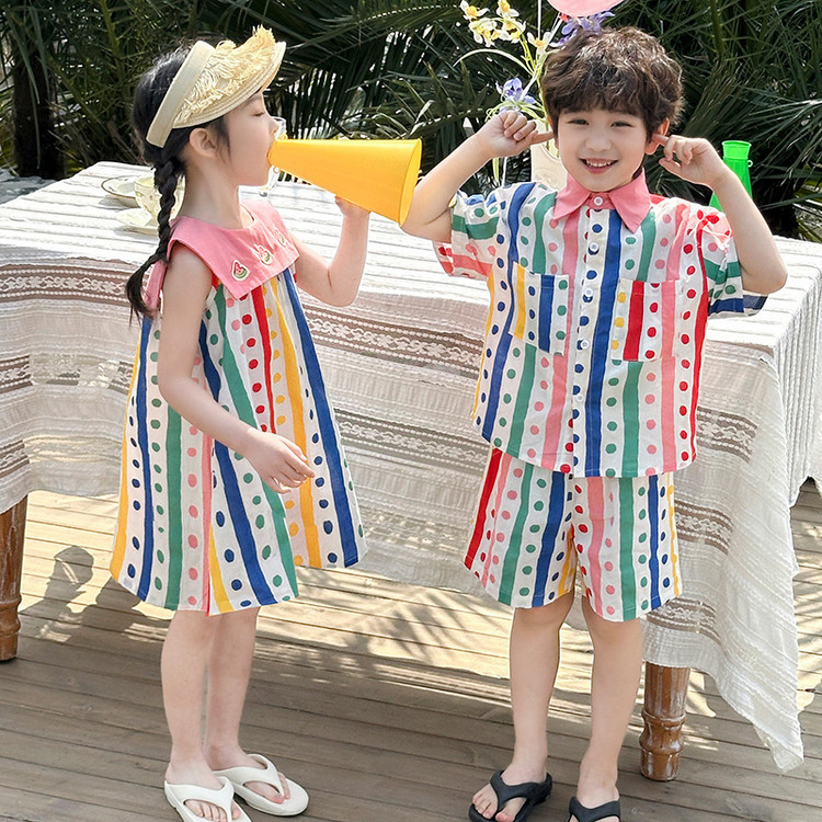 여름 새 소년과 소녀 무지개 웨이브 도트 인쇄 양복 25 년 셔츠 드레스 형제와 자매 여름 새 양복스토어 가기