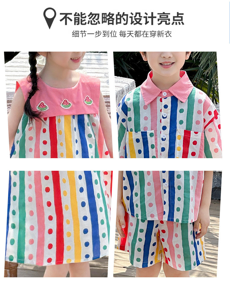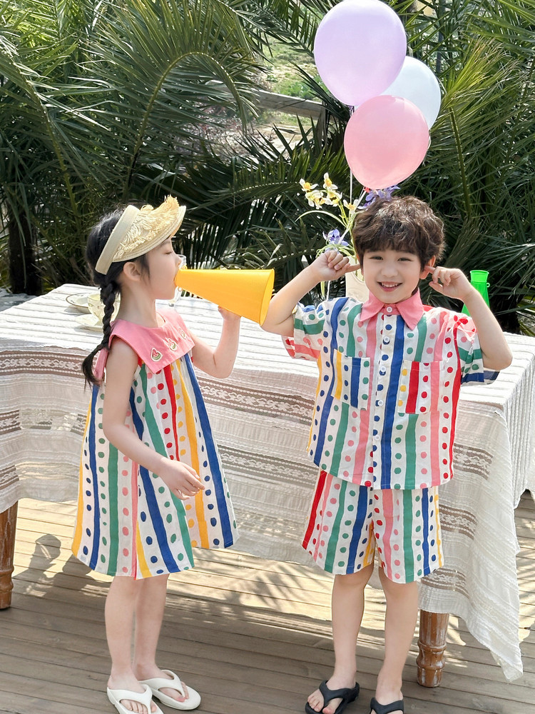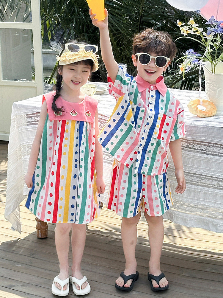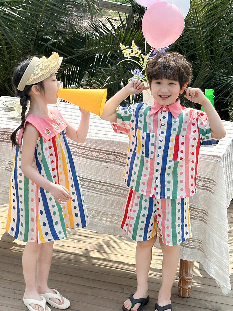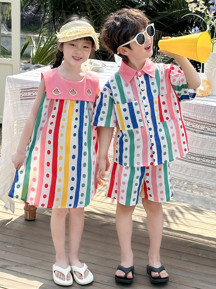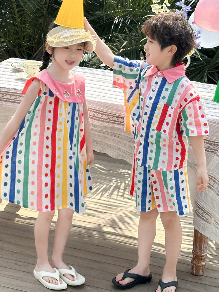 여름 새 소년과 소녀 무지개 웨이브 도트 인쇄 양복 25 년 셔츠 드레스 형제와 자매 여름 새 양복스토어 가기