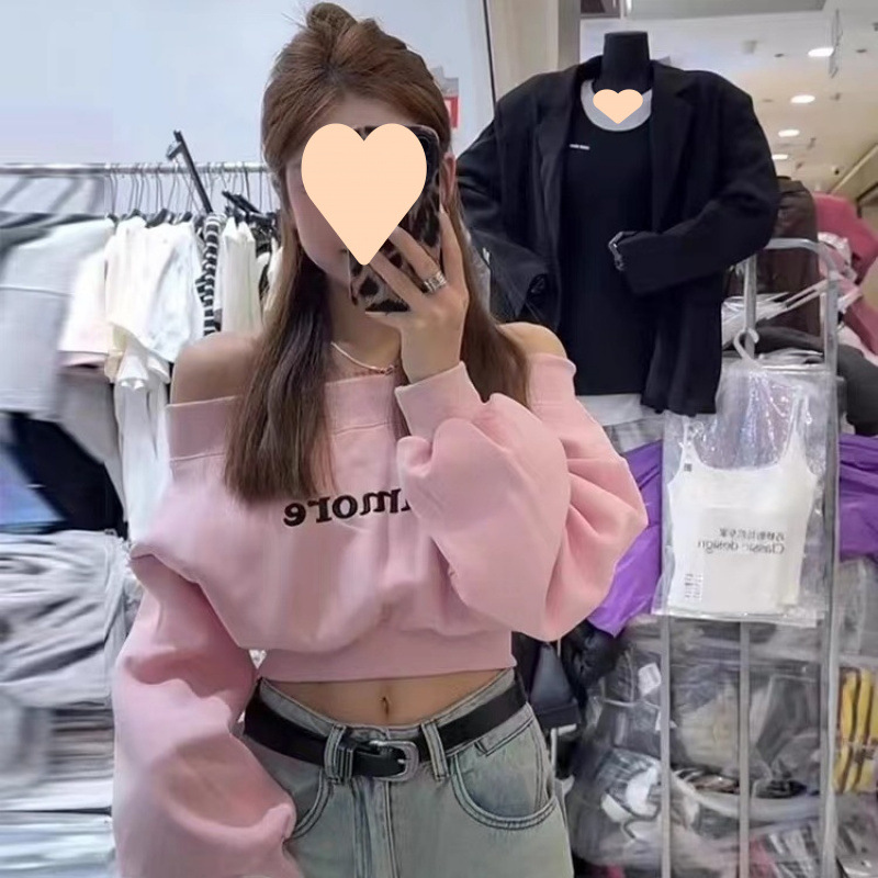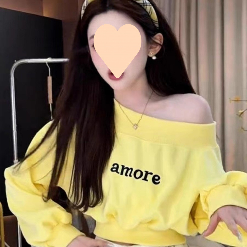 스파이스 걸스 게으른 노란색 자수 편지 짧은 한 캐릭터 칼라 여성 가을 겨울 한국 스타일 느슨한 슬리밍 어깨 긴 소매스토어 가기