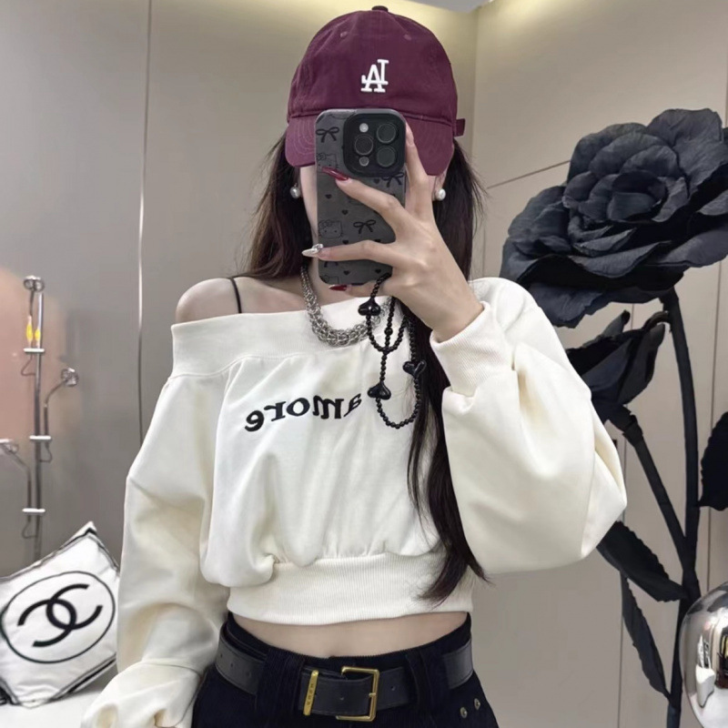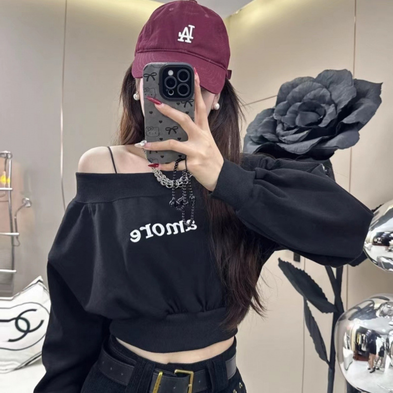 스파이스 걸스 게으른 노란색 자수 편지 짧은 한 캐릭터 칼라 여성 가을 겨울 한국 스타일 느슨한 슬리밍 어깨 긴 소매