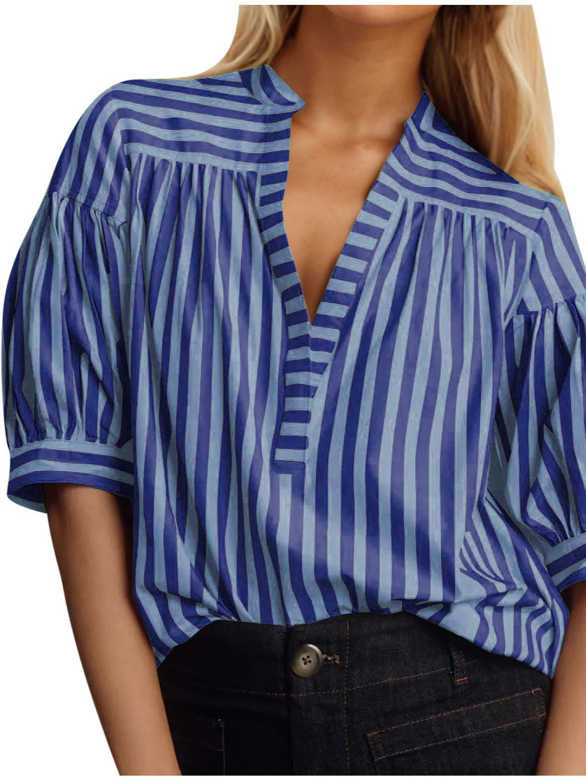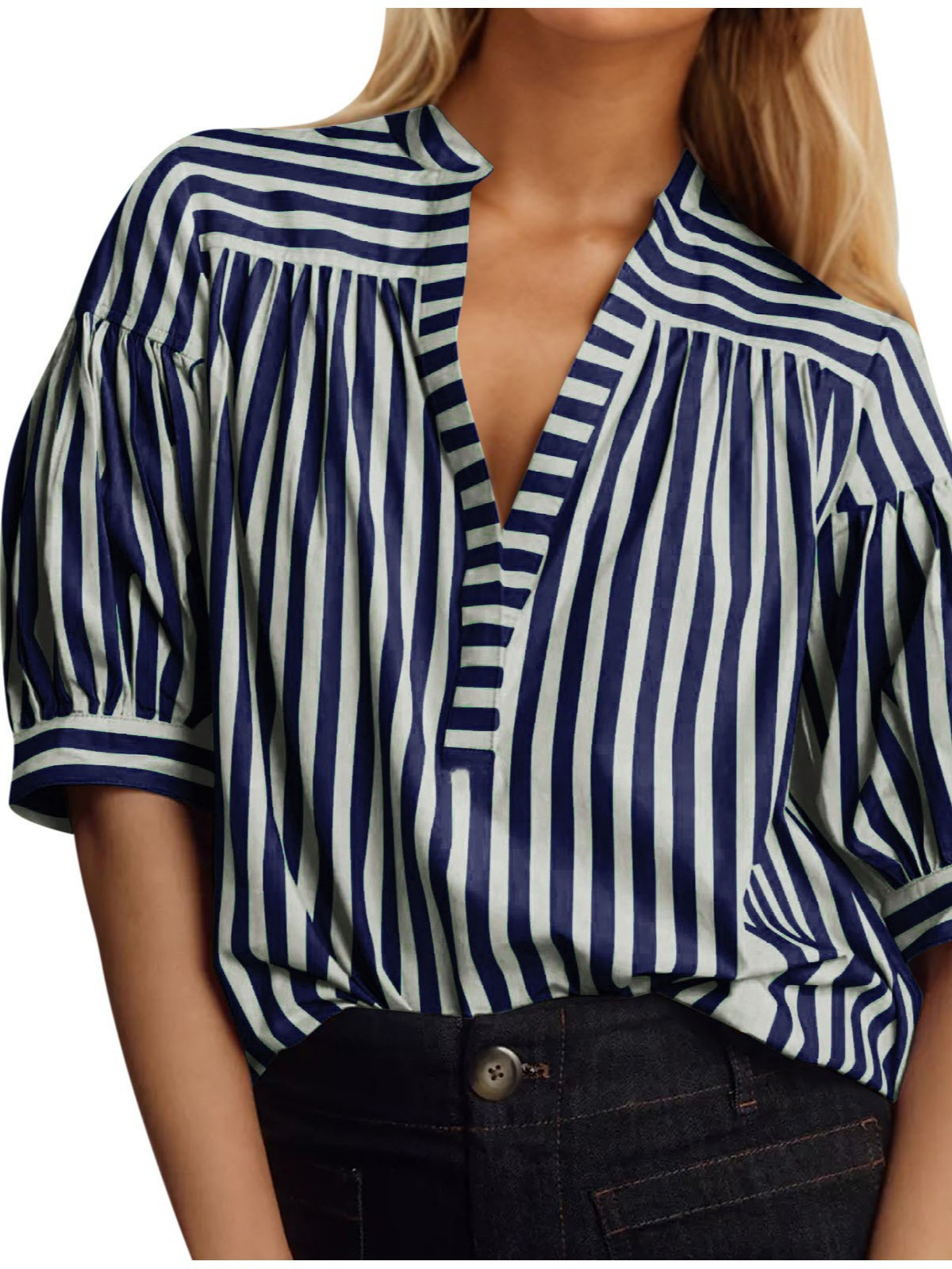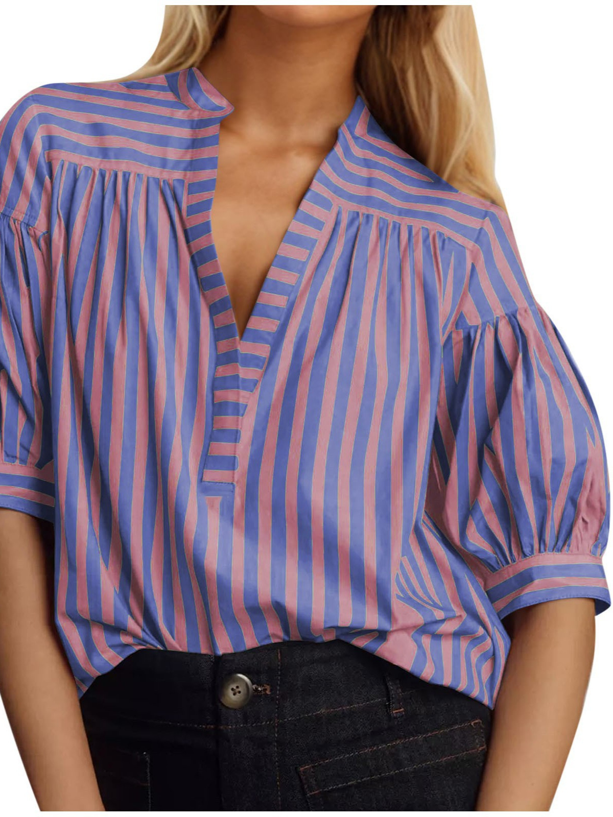 국경 간 유럽과 미국 여성 셔츠 새로운 캐주얼 스트라이프 스티칭 오픈 배럴 V-넥 여성 최고의 대외 무역 신제품스토어 가기