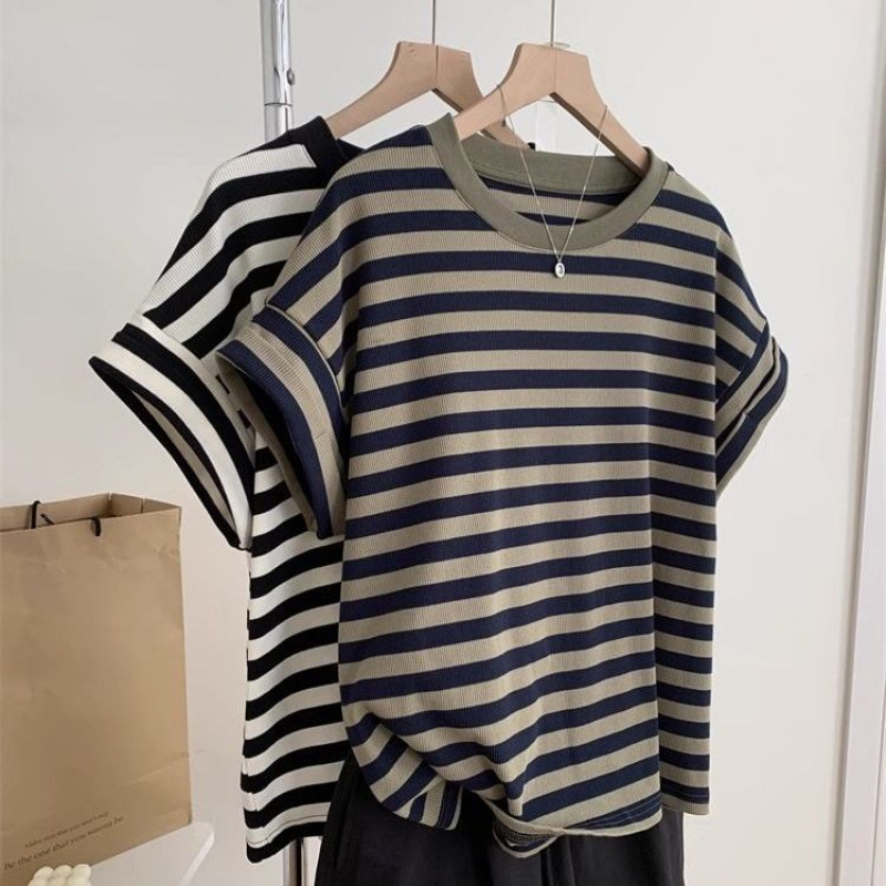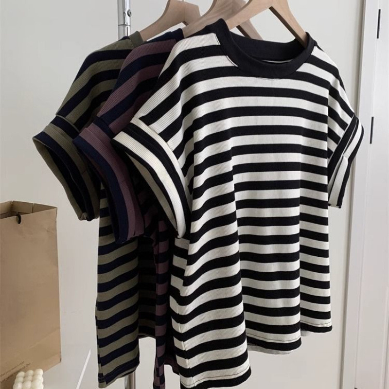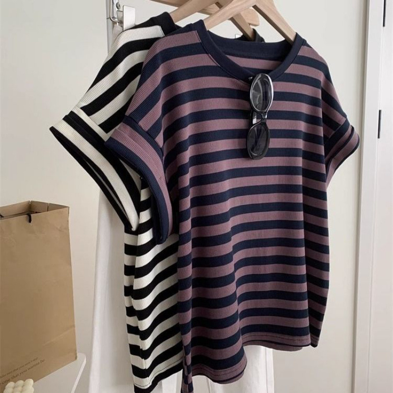 홍콩 스타일 세련된 육체 커버 슬리밍 플라잉 슬리브 스트라이프 티셔츠 여성용 루즈 캐주얼 게으른 스타일 배꼽 커버 쇼트 슬리브 탑 트렌디