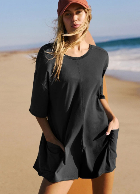 유럽과 미국 여성의 2024 년 여름 새로운 아마존 여성 반팔 백리스 V 넥 루즈 캐주얼 포켓 점프 수트