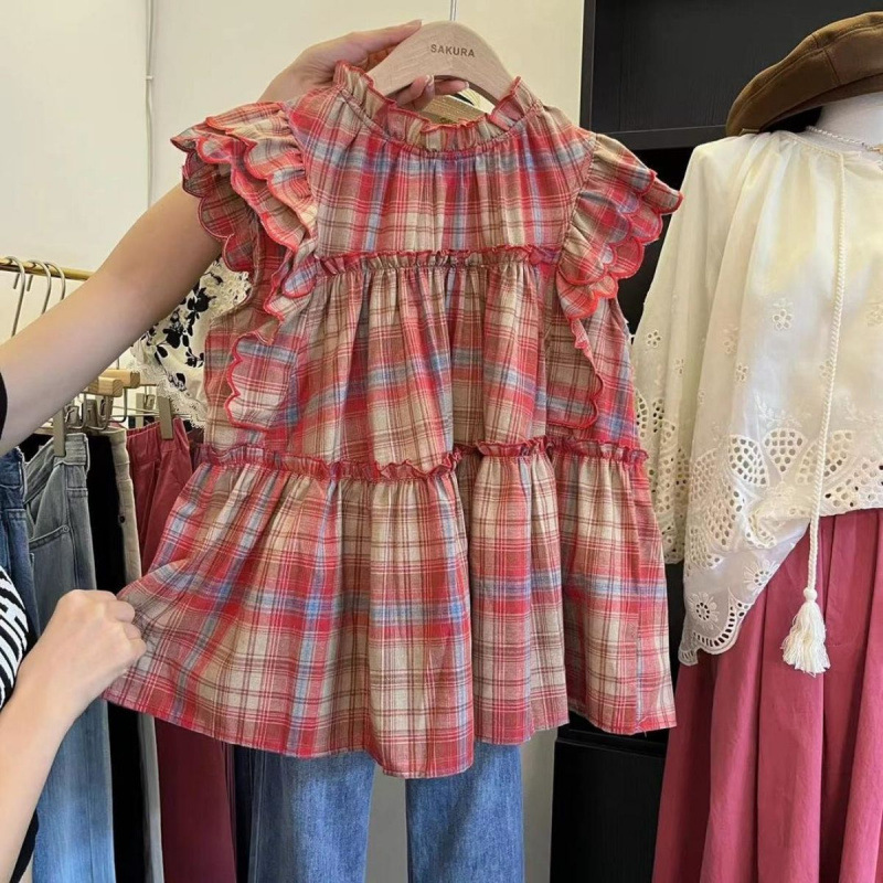 2025 여름 옷 여성의 달콤한 작은 비행 소매 셔츠 물결 가장자리 인형 셔츠 셔츠 순수한 욕망 최고 여성스토어 가기