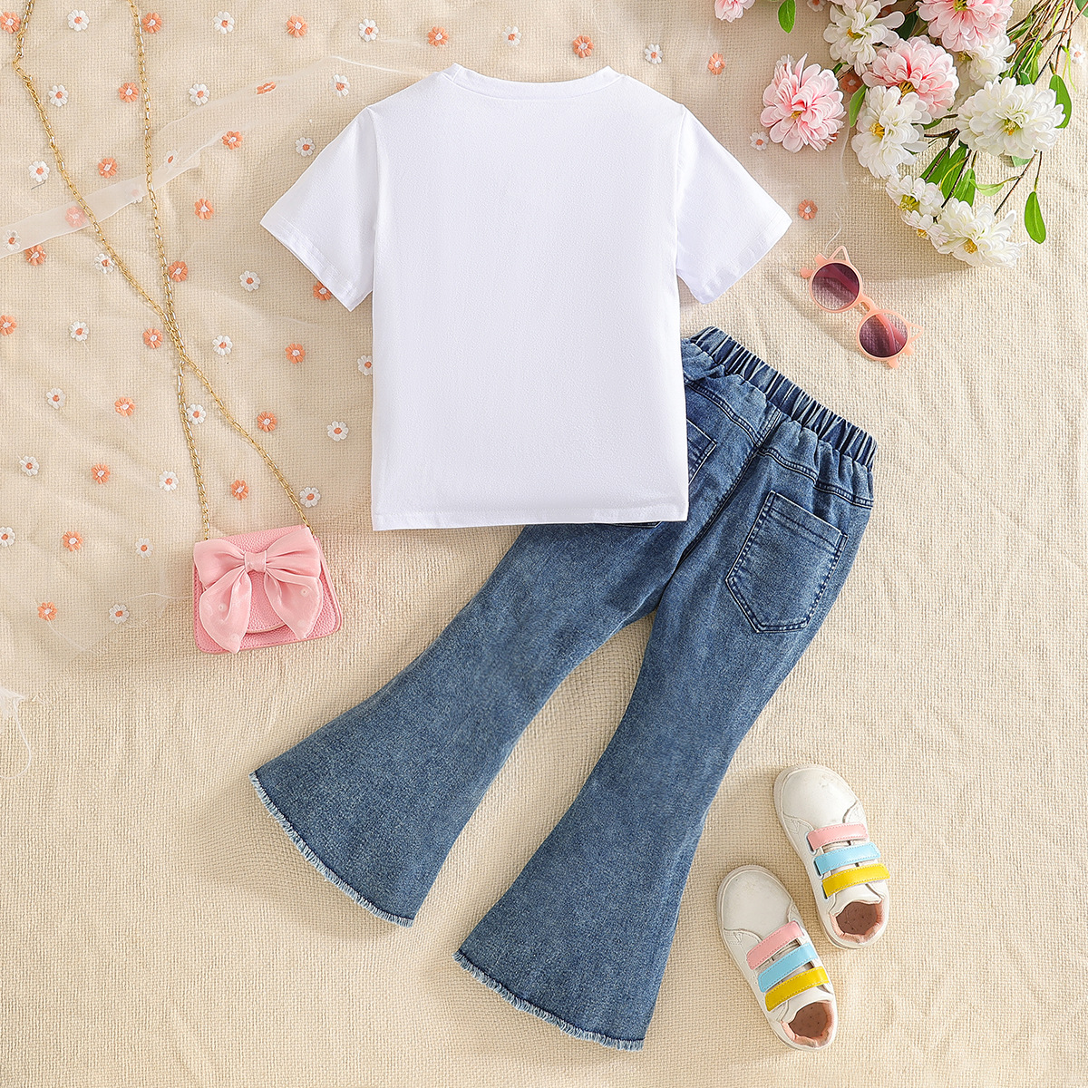 여아 정장 여름 신작 반팔 레터 프린트 티셔츠 슬림 데님 바지 투피스 세트 서양식 아동복스토어 가기