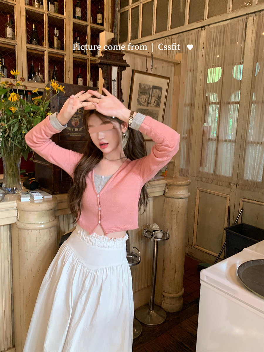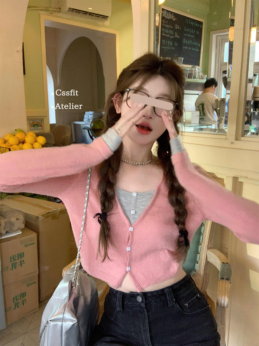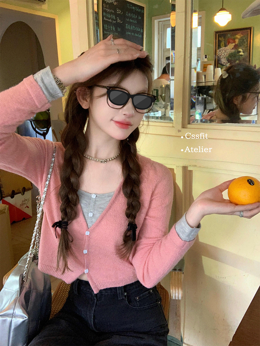 늦은 우산 복숭아 마가렛 파우더 그레이 컬러 대조 가짜 투피스 베이스 니트 스웨터 여성용 스위트 쇼트 탑