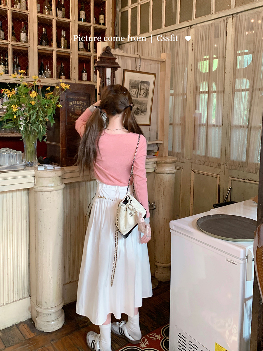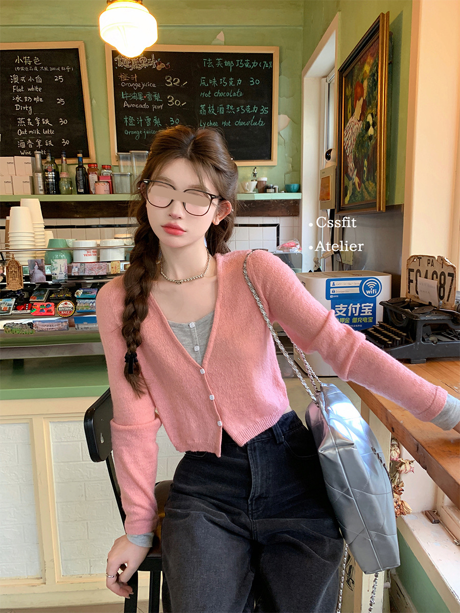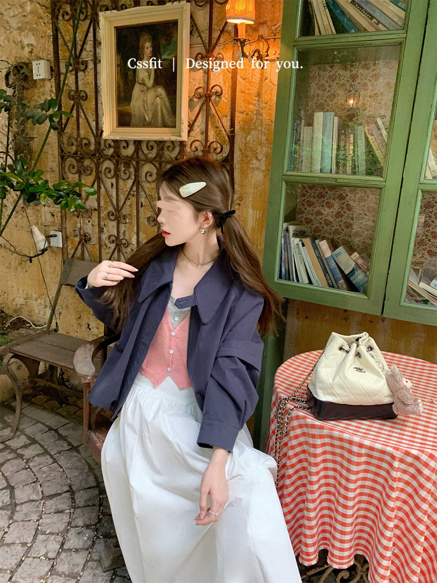 늦은 우산 복숭아 마가렛 파우더 그레이 컬러 대조 가짜 투피스 베이스 니트 스웨터 여성용 스위트 쇼트 탑