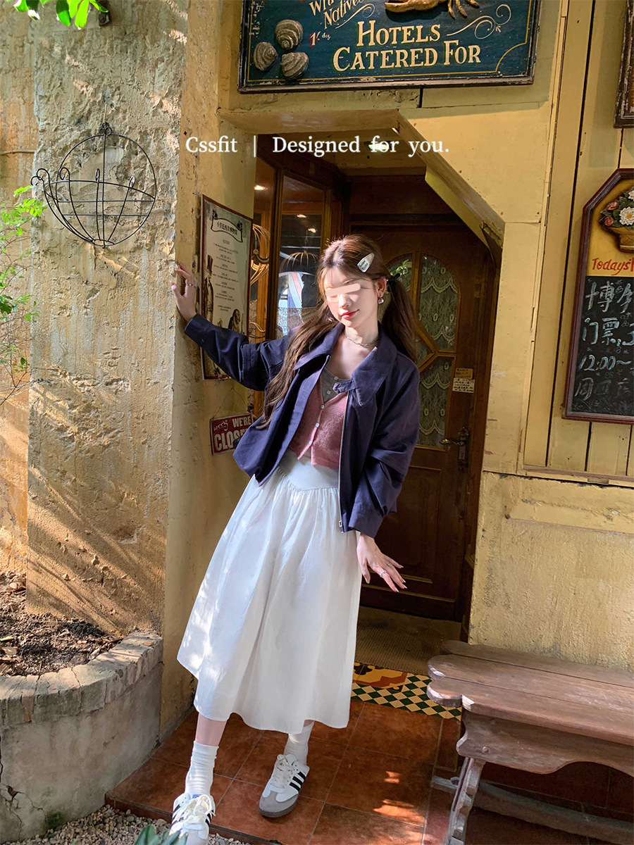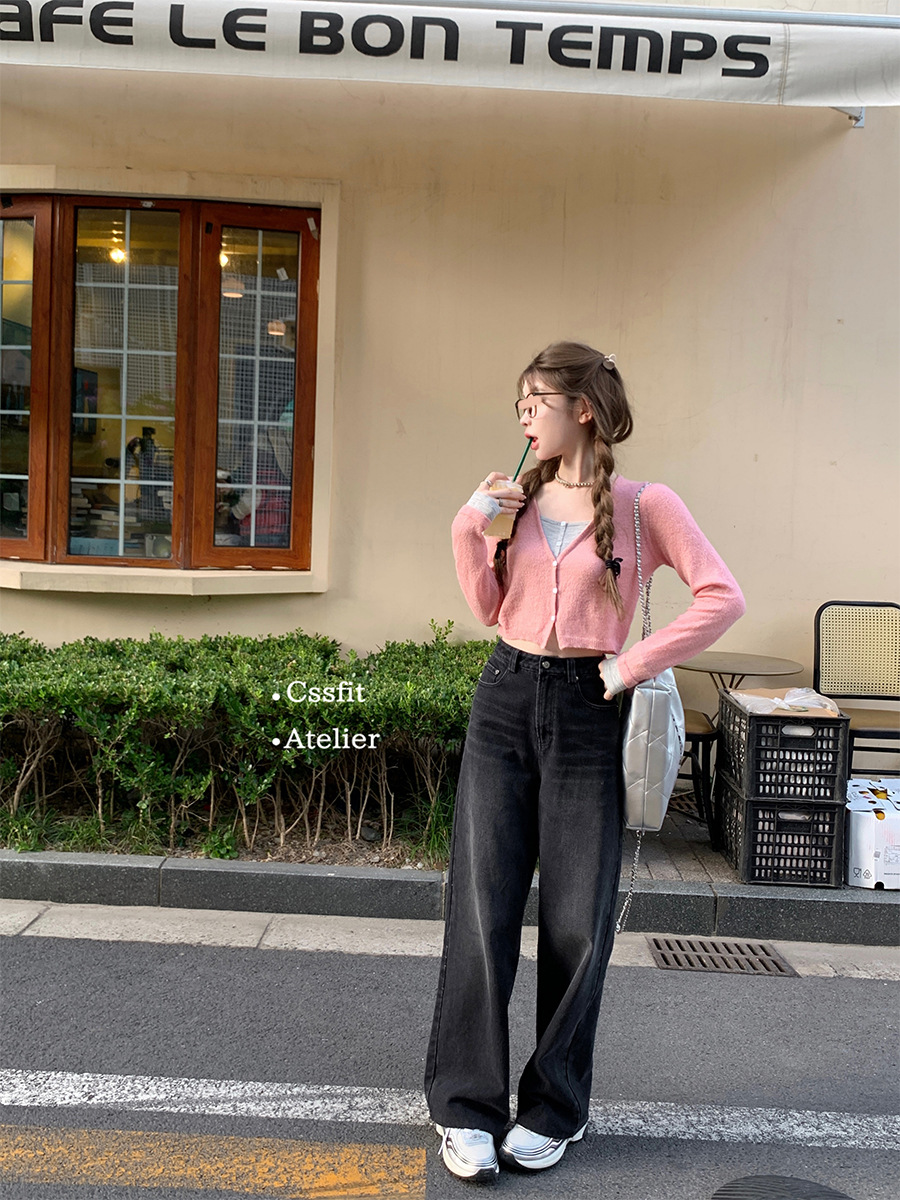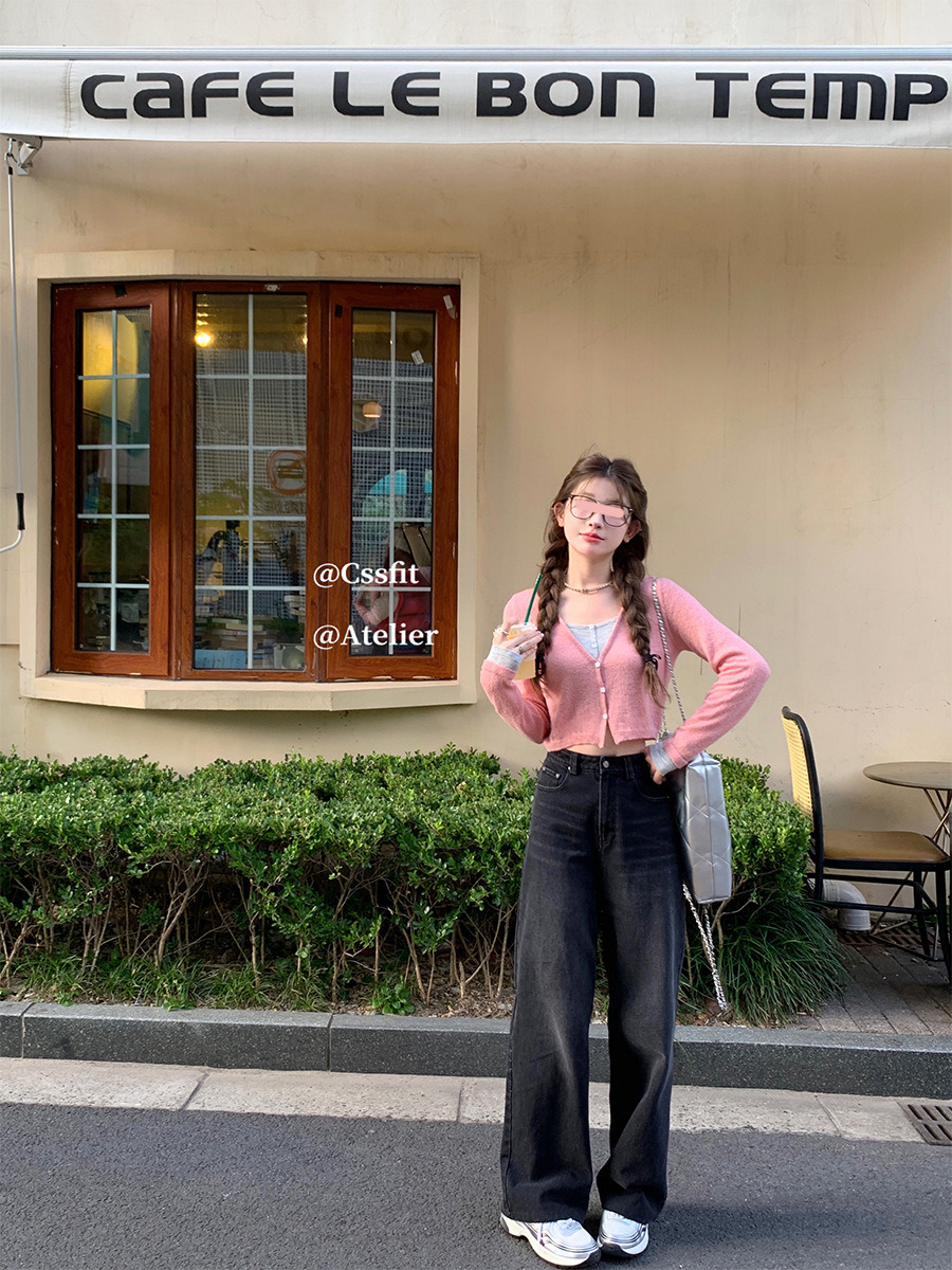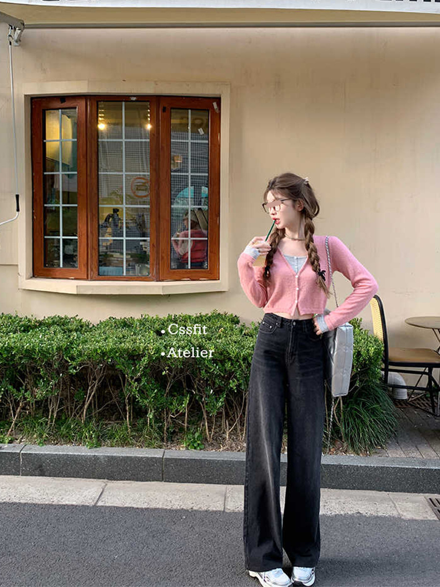 늦은 우산 복숭아 마가렛 파우더 그레이 컬러 대조 가짜 투피스 베이스 니트 스웨터 여성용 스위트 쇼트 탑스토어 가기