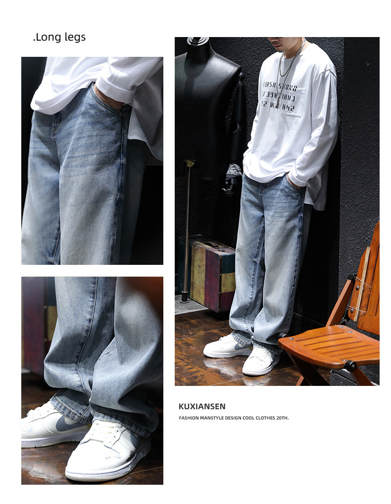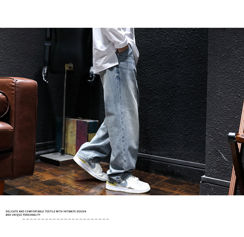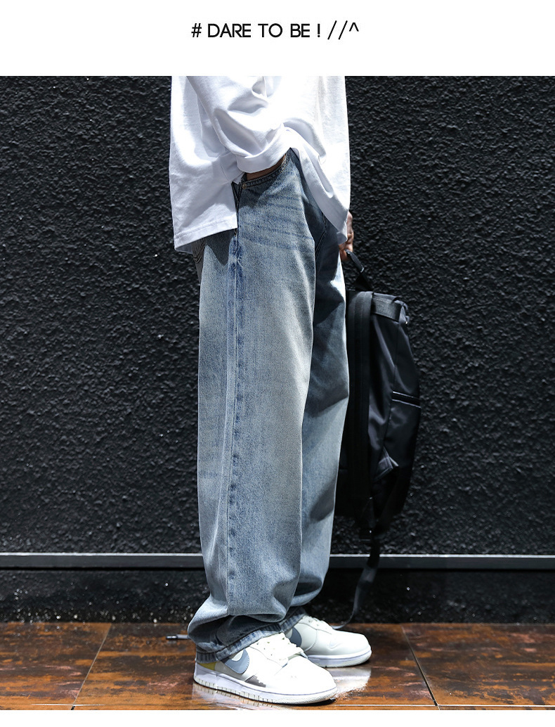 봄과 여름 밝은 색상 간단한 스트레이트 청바지 남자의 봄과 가을 느슨한 유행 브랜드 바지 소년 넓은 다리 유행 바지스토어 가기