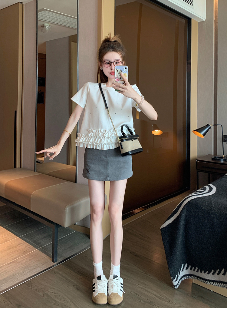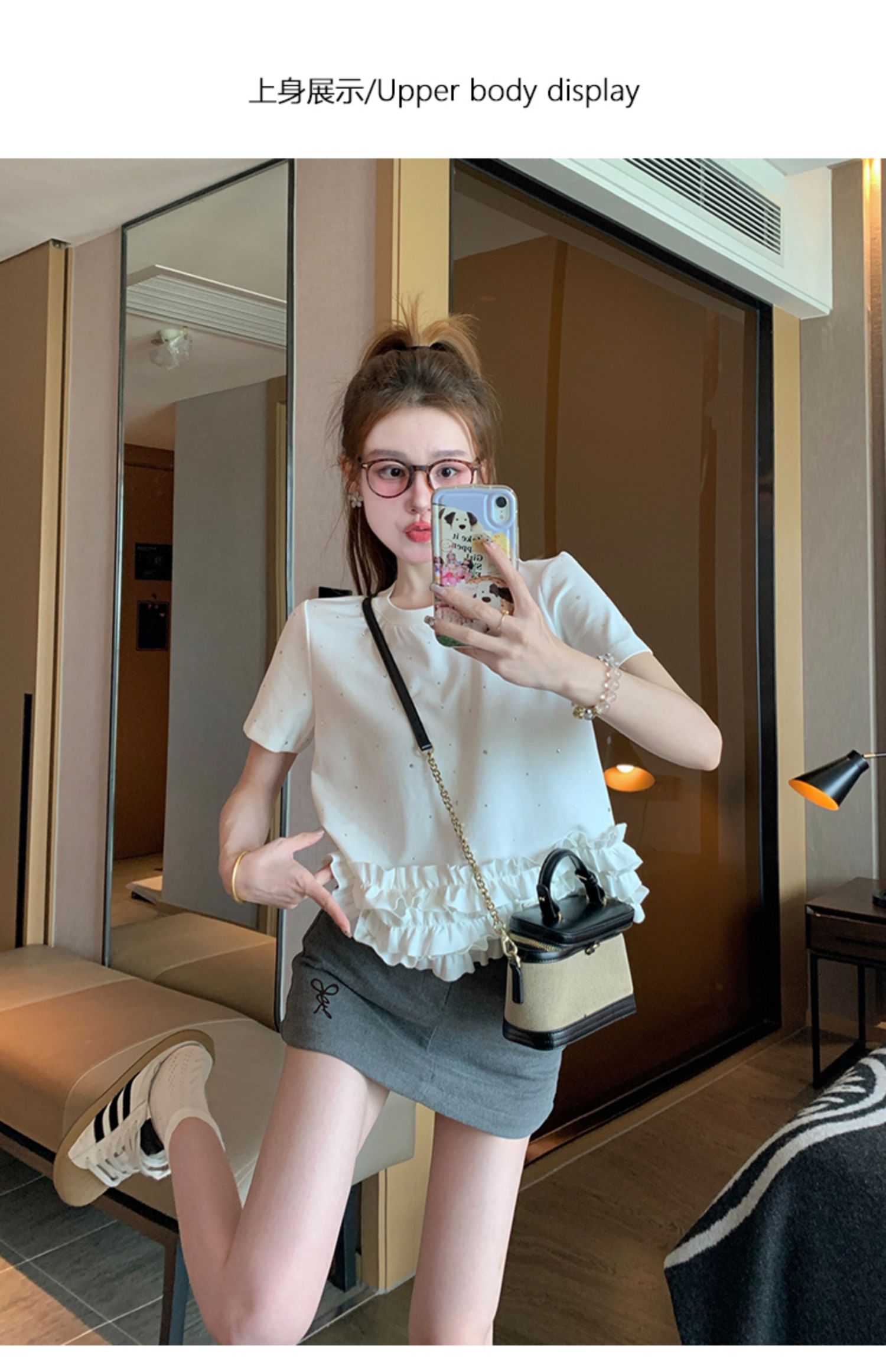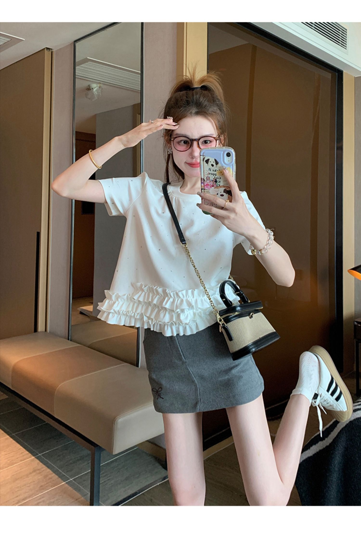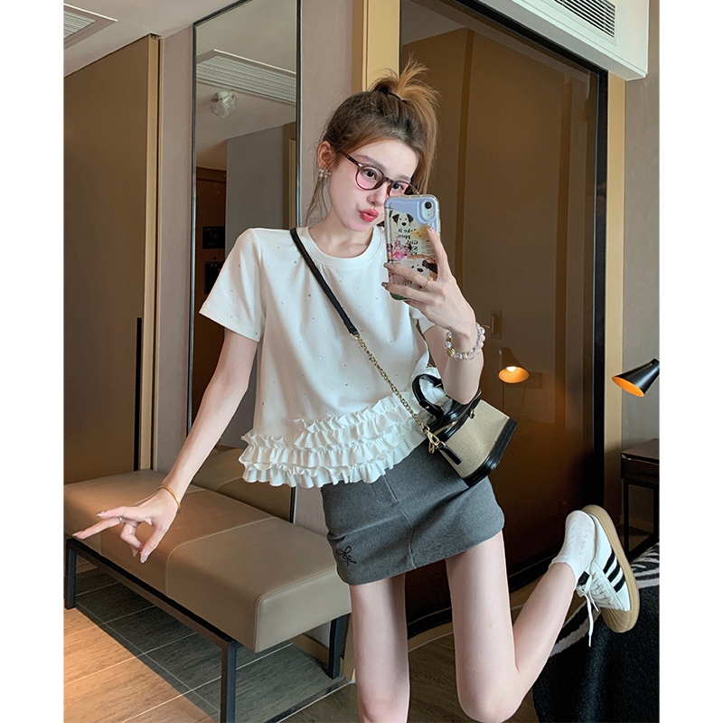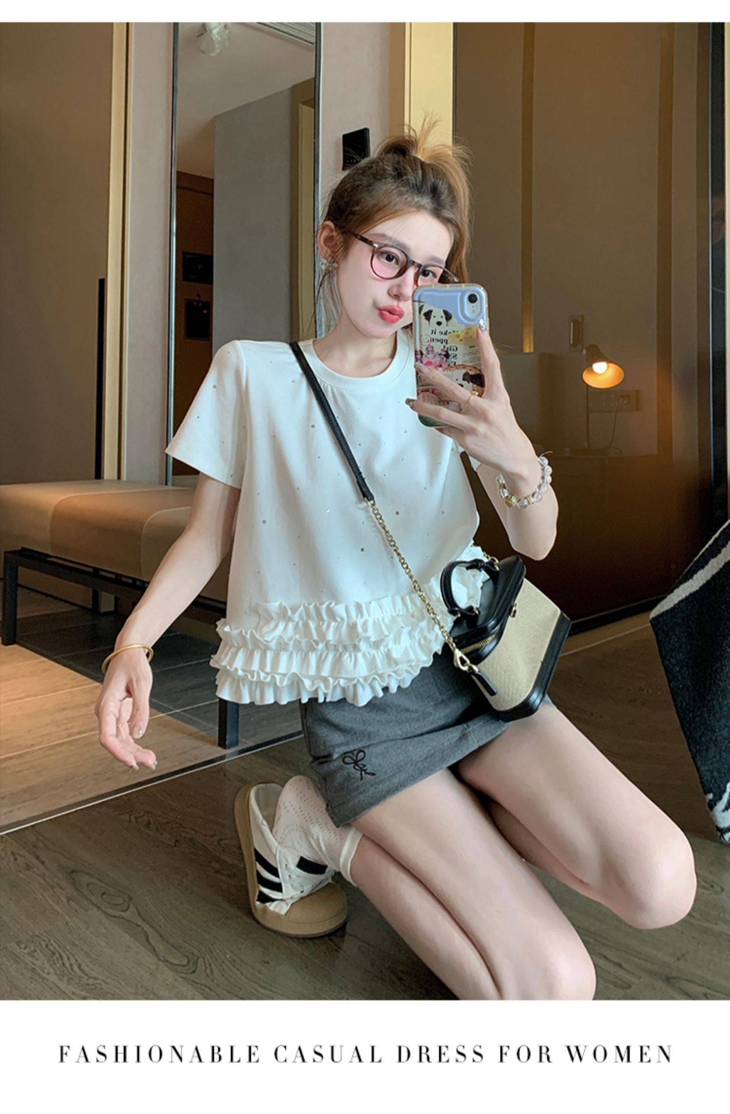 화이트 스티칭 러플 반팔 티셔츠 여성용 2025 년 새로운 여름 유럽 중공업 스퀸 숄더 라운드 넥 탑