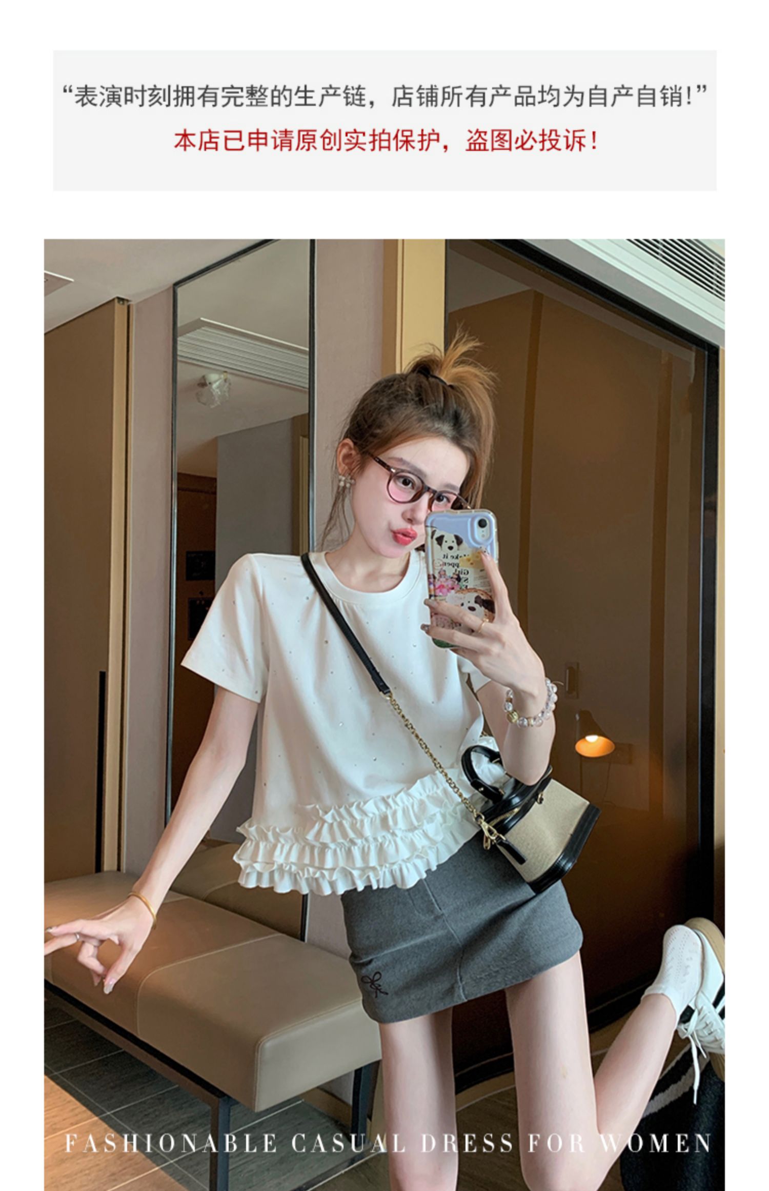 화이트 스티칭 러플 반팔 티셔츠 여성용 2025 년 새로운 여름 유럽 중공업 스퀸 숄더 라운드 넥 탑스토어 가기