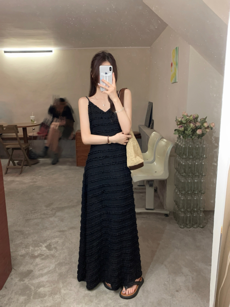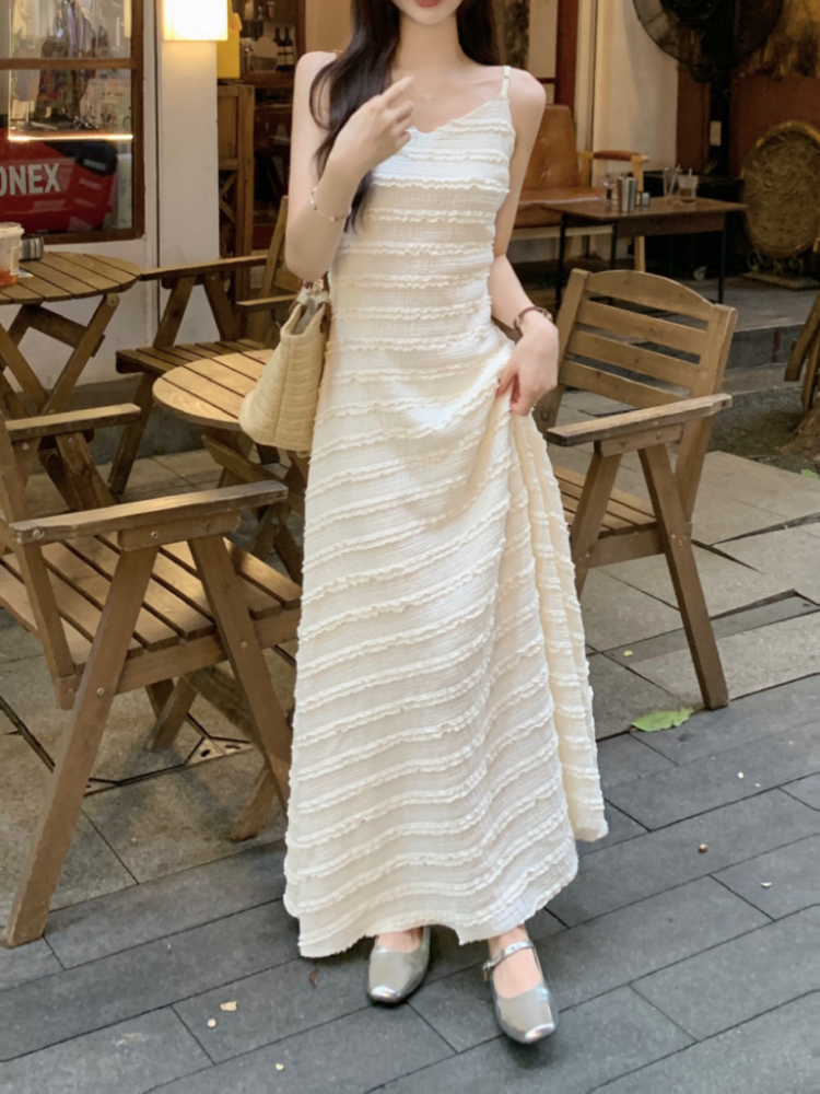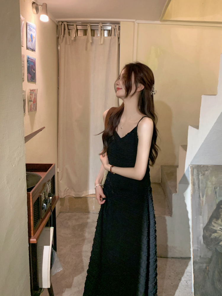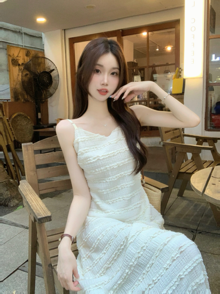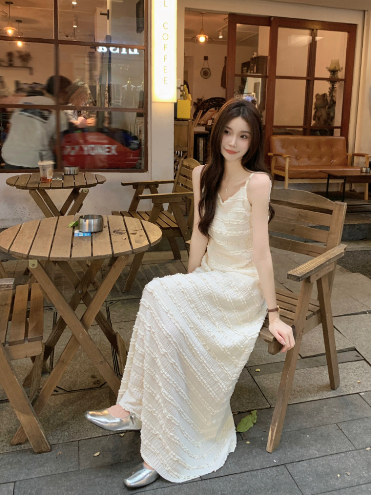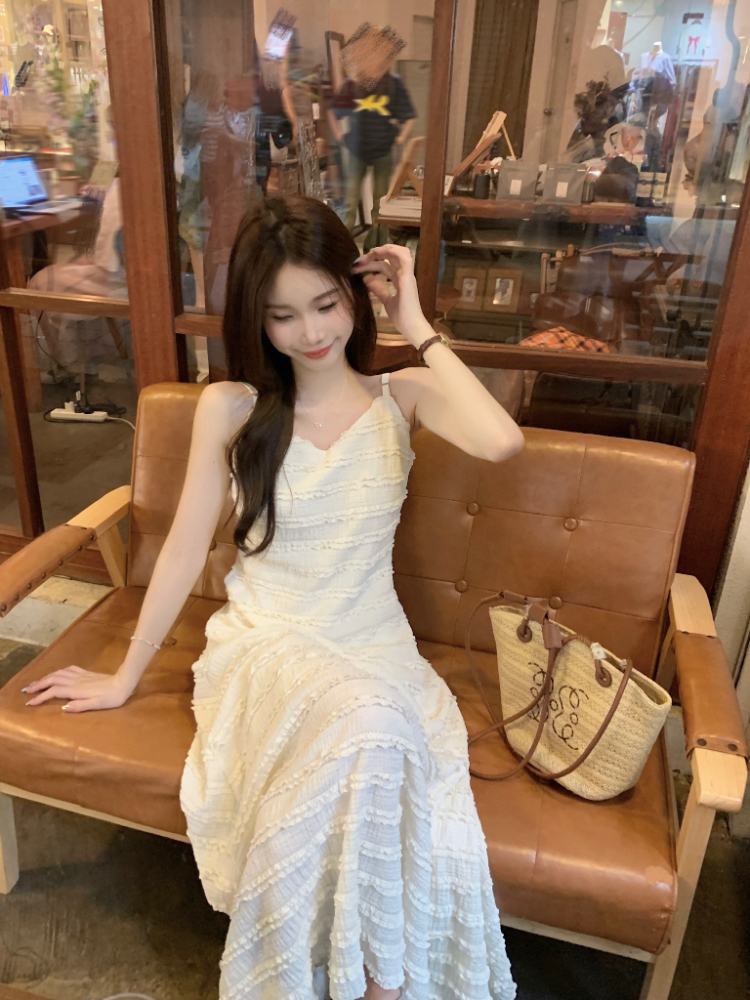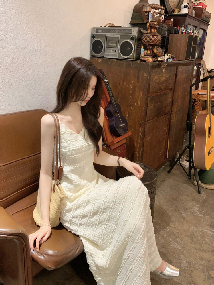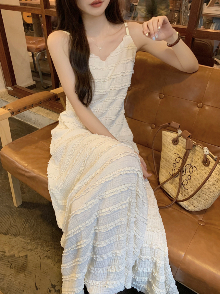 부드러운 프랑스 스타일 우아한 V 넥 레이스 원피스 여성 봄 2025 새로운 간단한 타이트 허리 스트랩 A 라인 롱 원피스