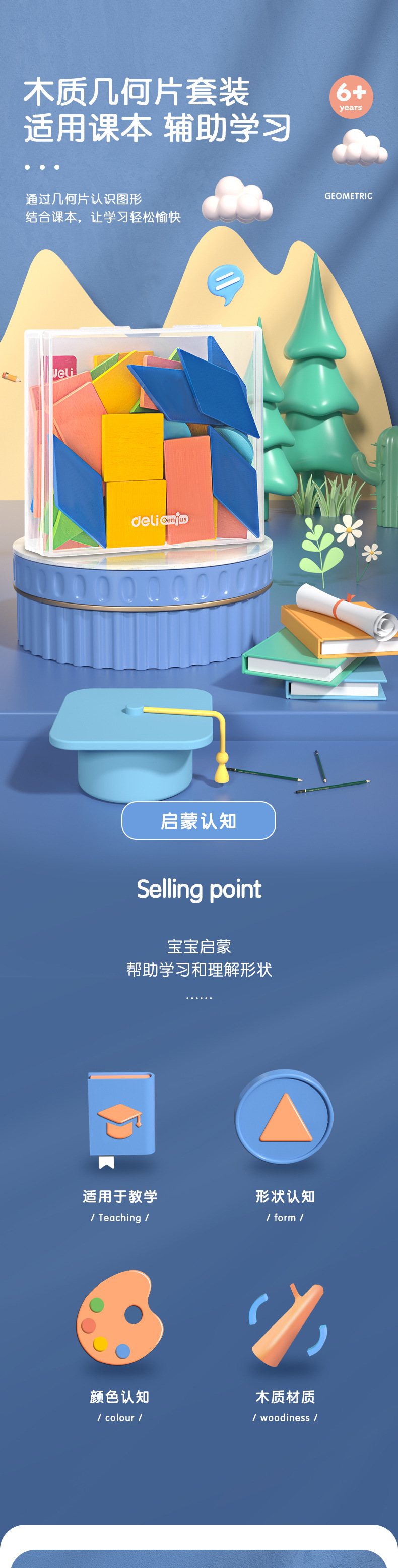 델리 YX441 초등학생을 위한 나무 기하학 조각 수학 교육 보조 1학년 평면 그래픽 직사각형 사각형