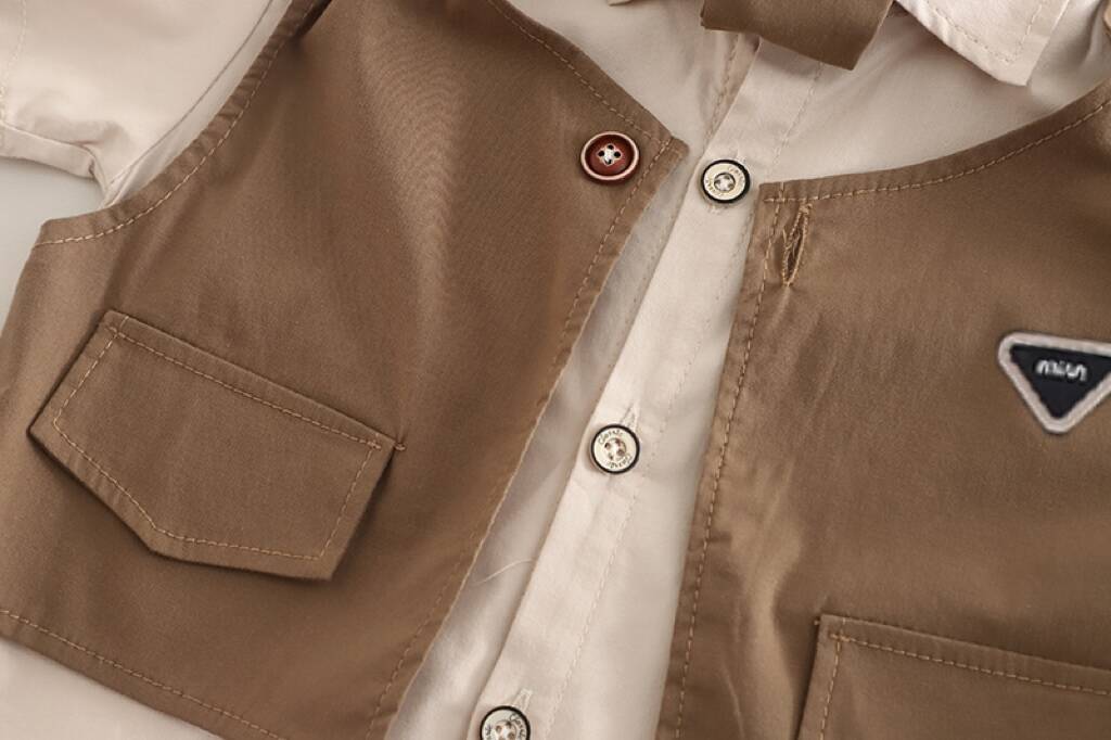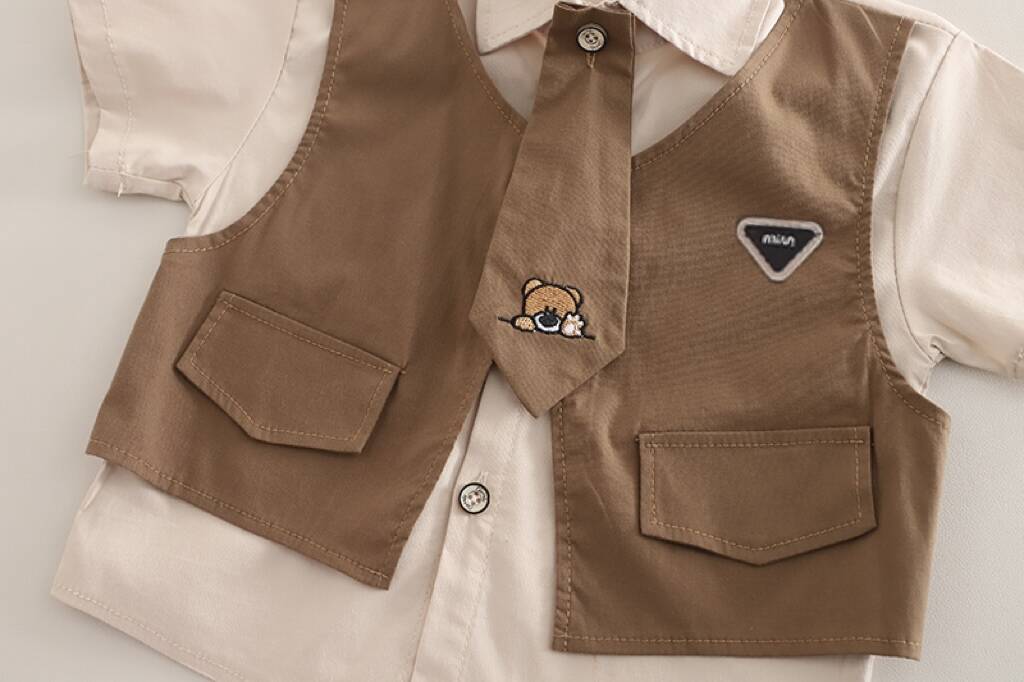 • 브라운 타이 베어 조끼 반팔 투피스 세트