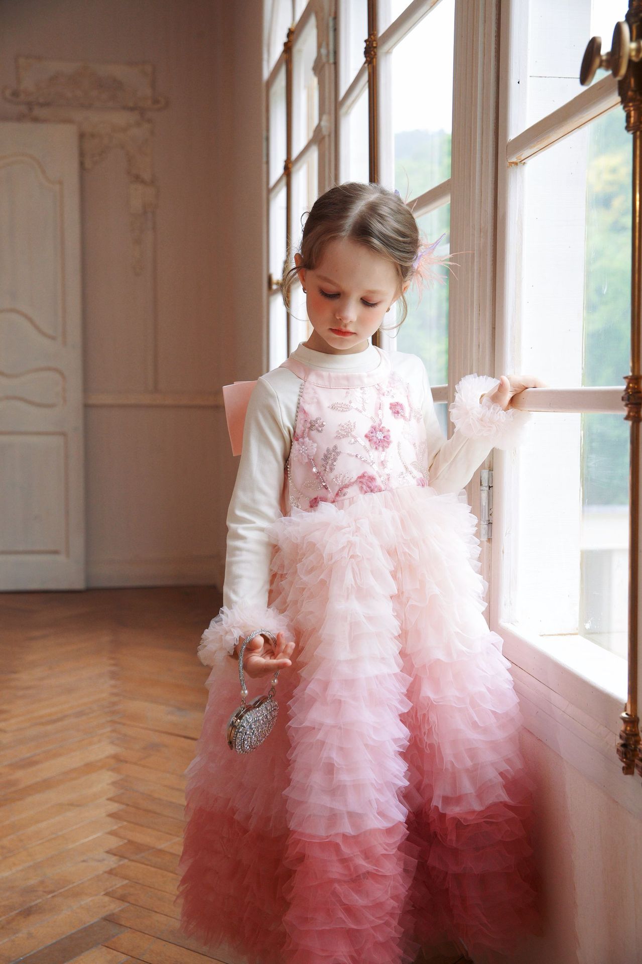 소녀 원피스 공주 원피스 2025 새로운 도착 무거운 구슬 핑크 꽃 그라디언트 생일 슬링 케이크 원피스