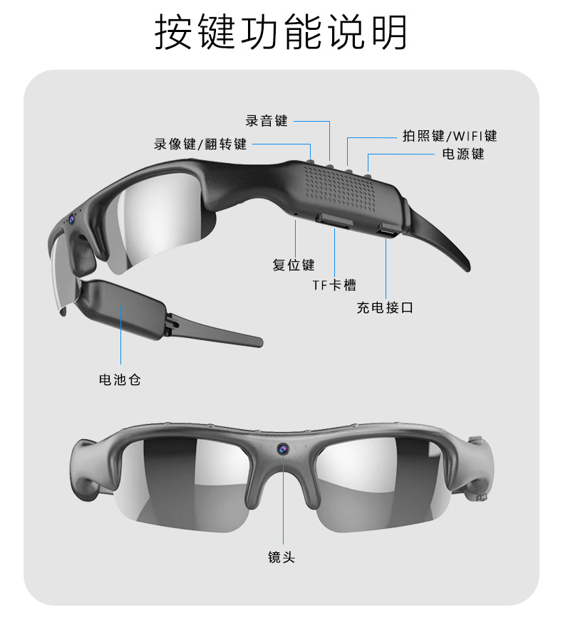 需要tf卡、眼镜本身无内存,需要外置内存卡,无蓝牙功能,可以一边录像一边手机实时查看镜头,也可以查看回放,眼镜可更换近视镜片,眼镜片有膜,使用需撕下。