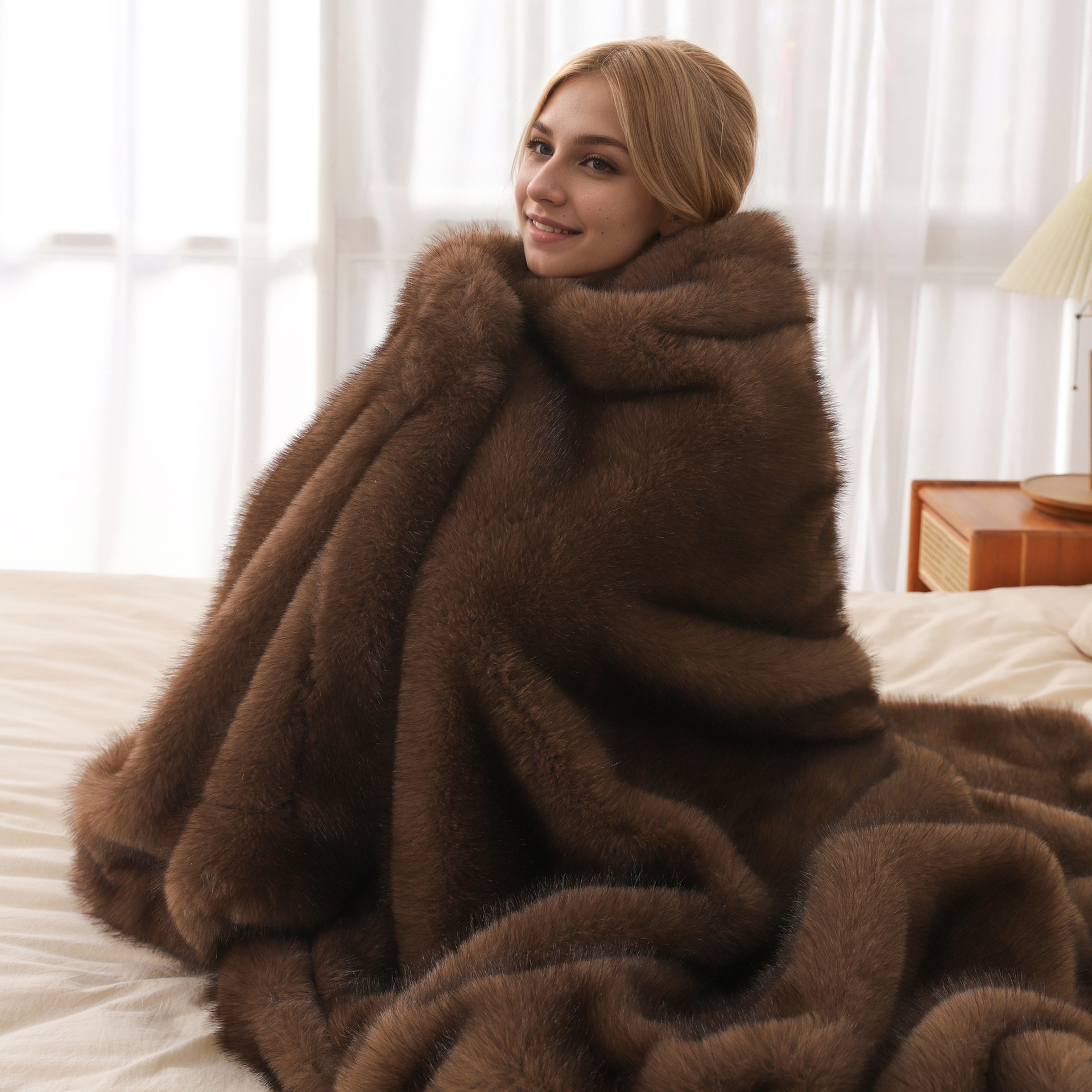 此款毛毯为AB双面毛毯,A面仿狐狸毛绒,B面仿兔毛绒