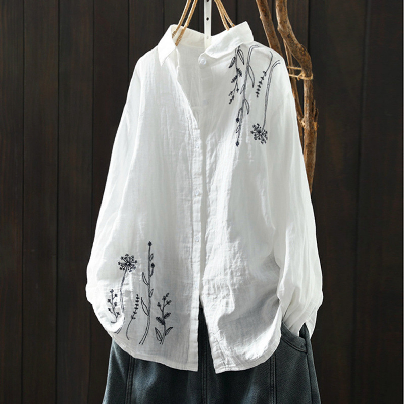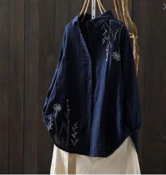 더블 레이어 코튼 원사 셔츠 여성의 새로운 예술적 복고풍 자수 옷깃 단색 긴팔 셔츠 탑