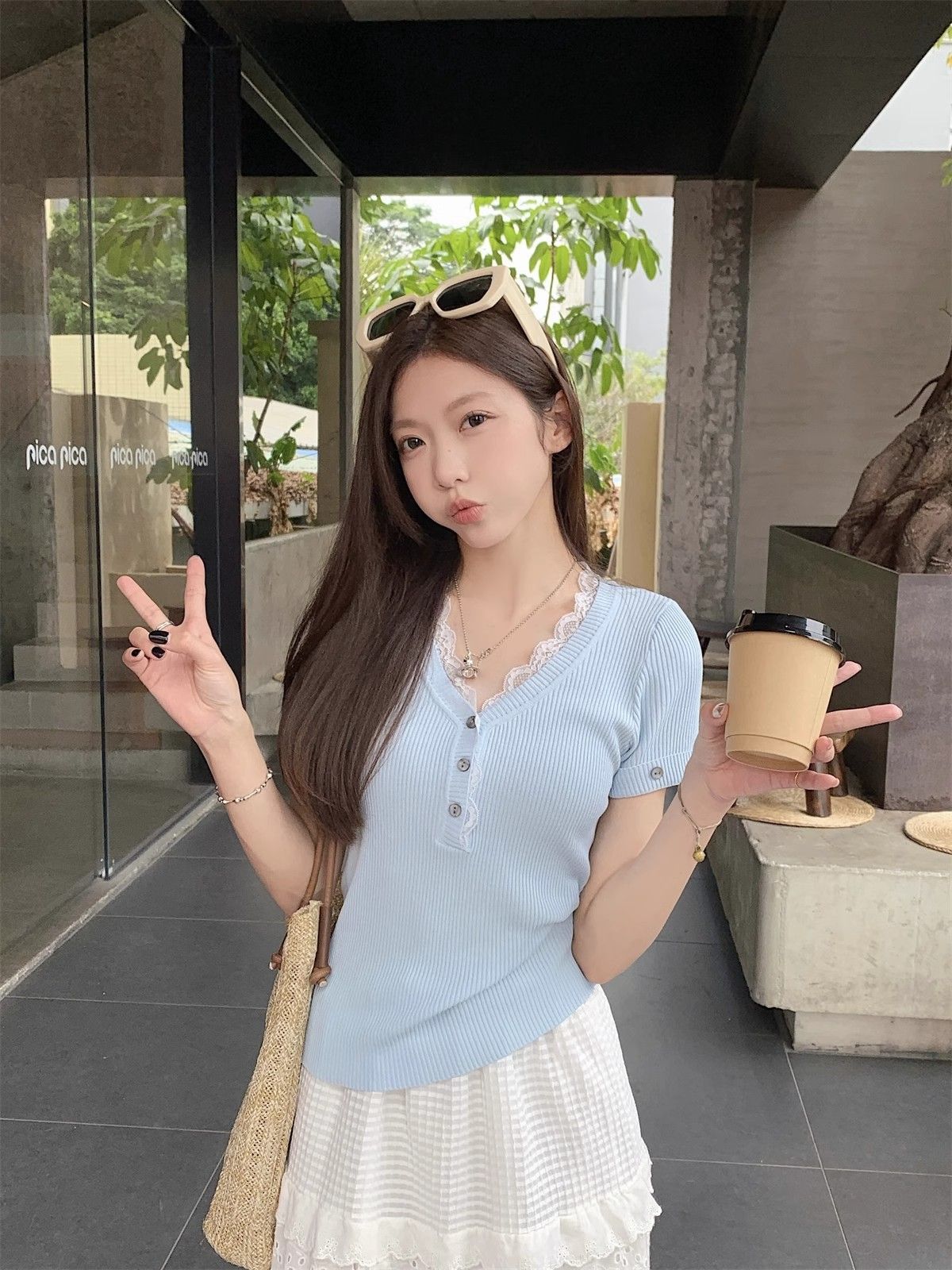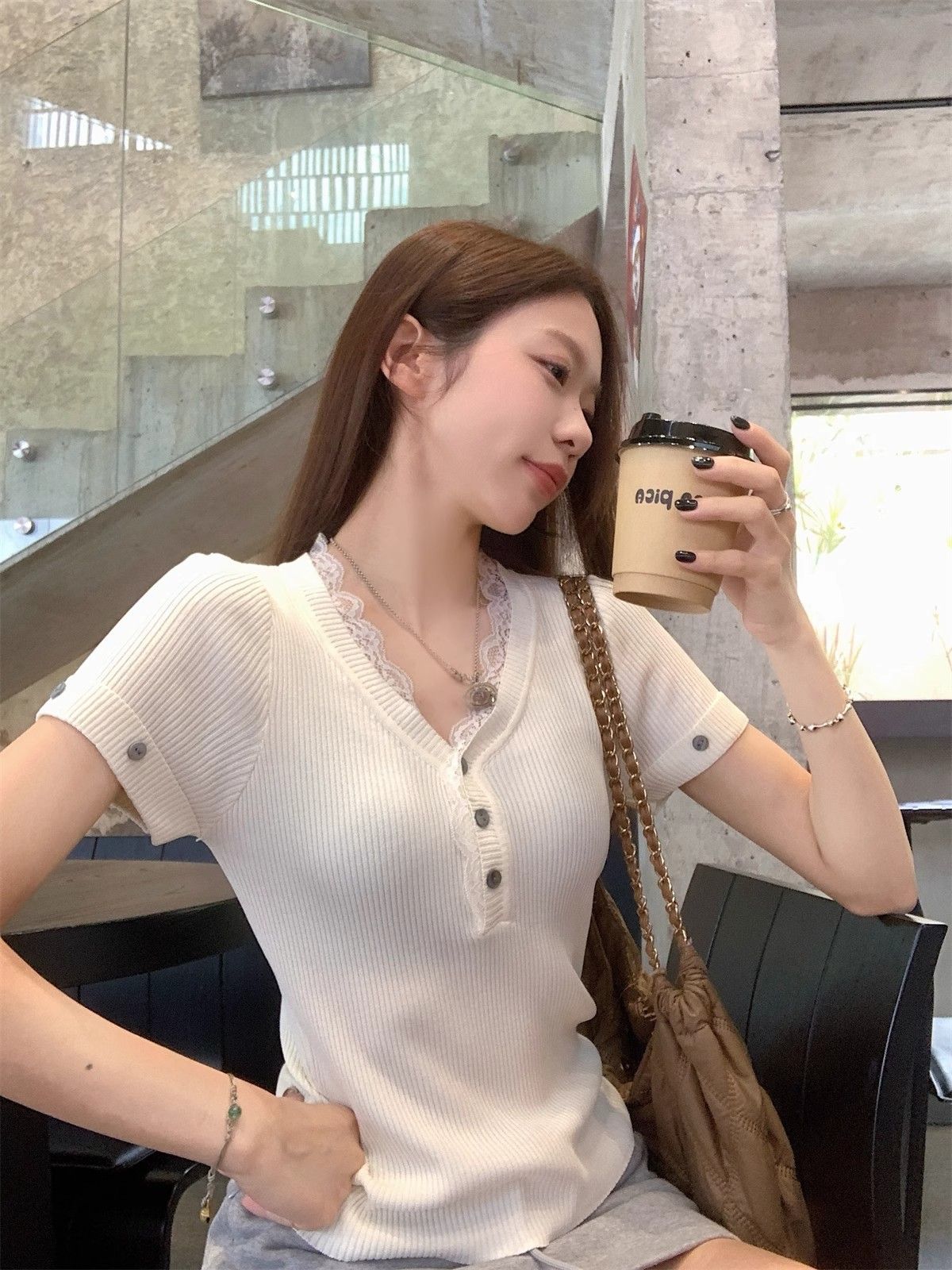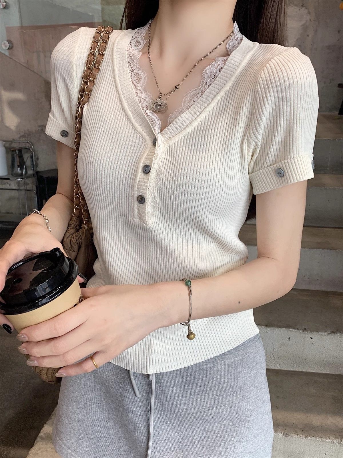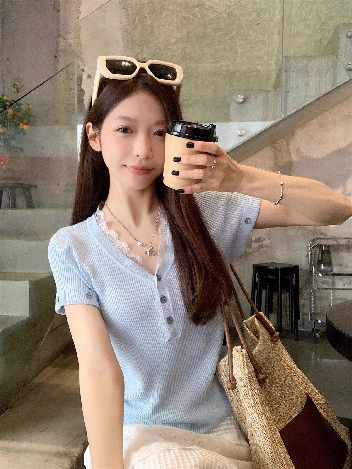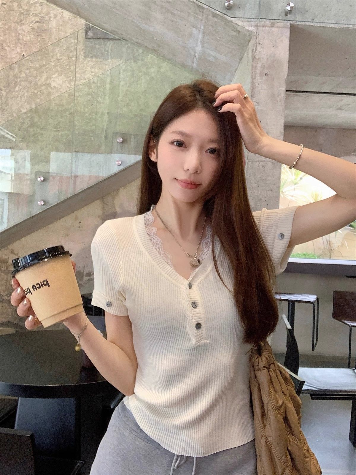 한국 스타일 V-넥 레이스 엣지 반소매 티셔츠 여성 여름 2025 새로운 버튼 디자인 순수 욕망 니트 셔츠 캐주얼 탑스토어 가기