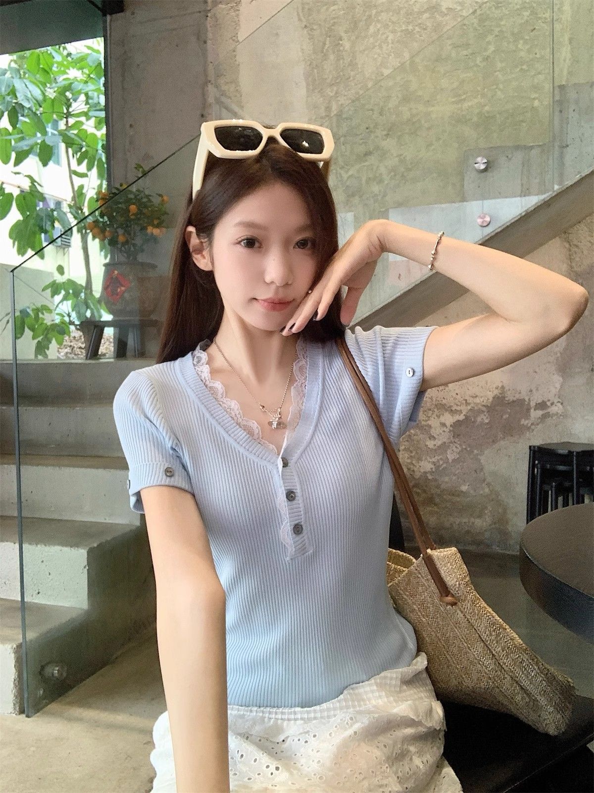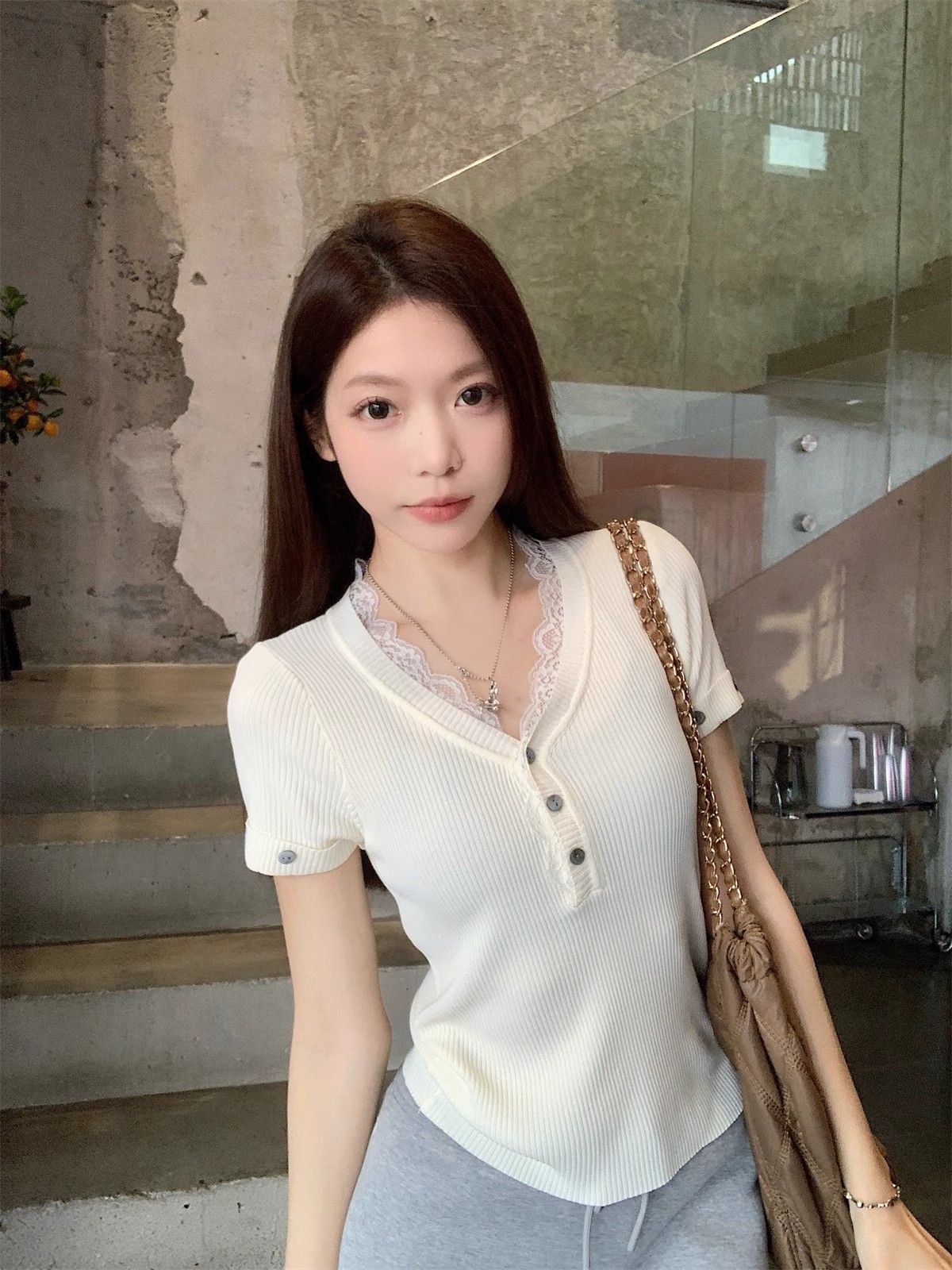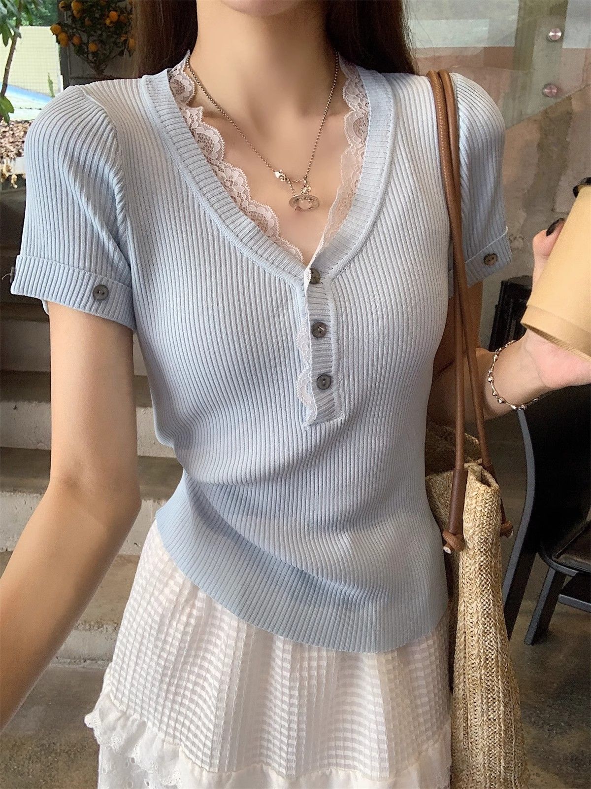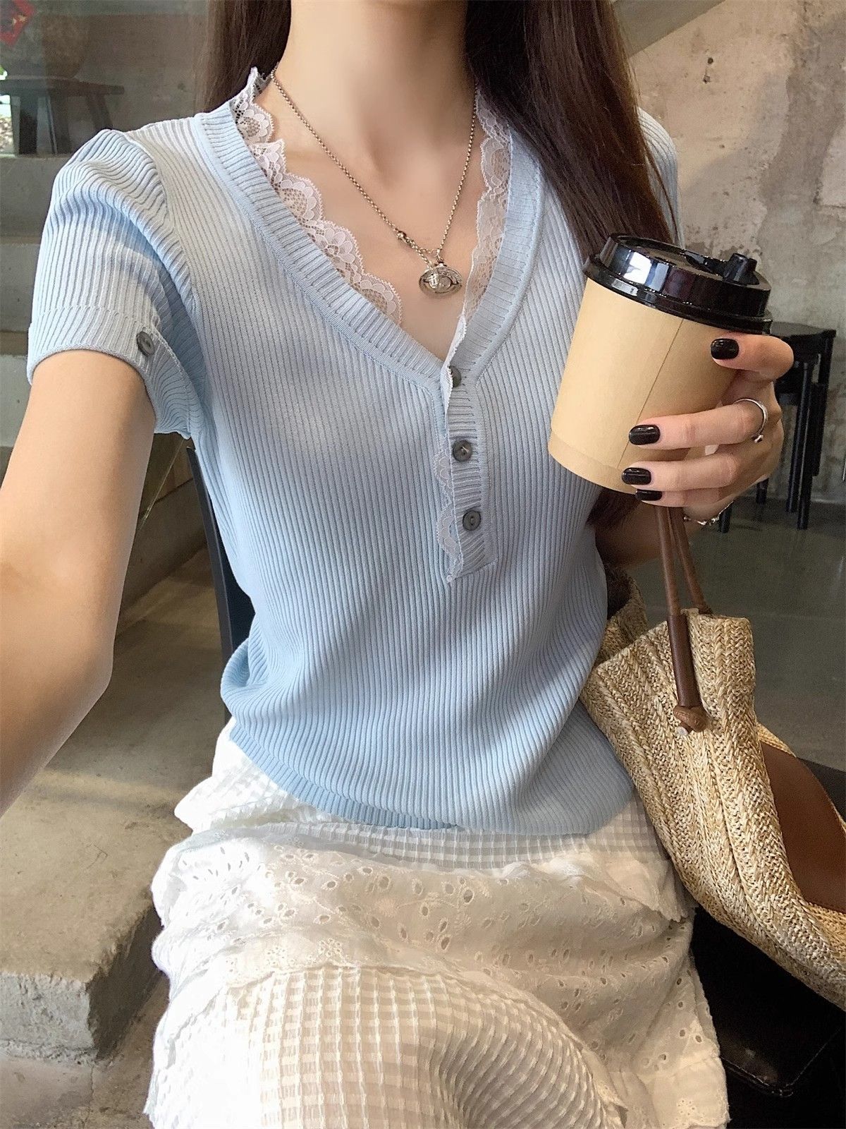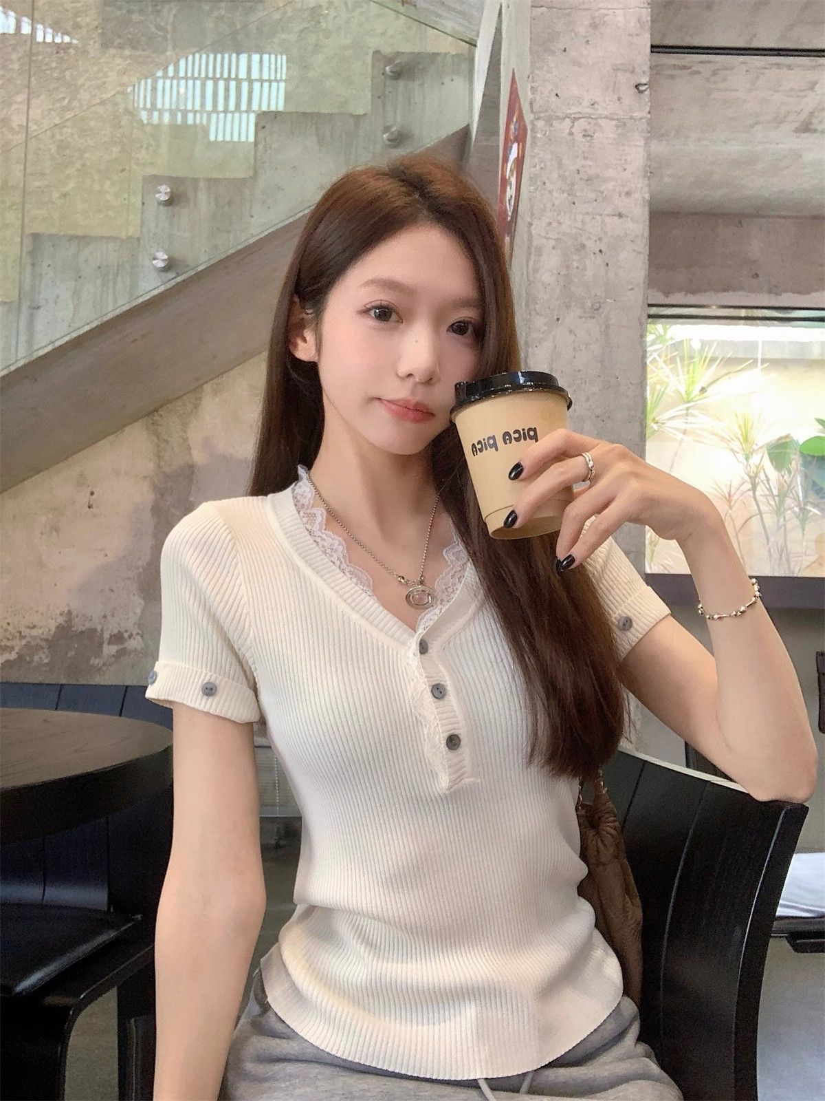 한국 스타일 V-넥 레이스 엣지 반소매 티셔츠 여성 여름 2025 새로운 버튼 디자인 순수 욕망 니트 셔츠 캐주얼 탑스토어 가기