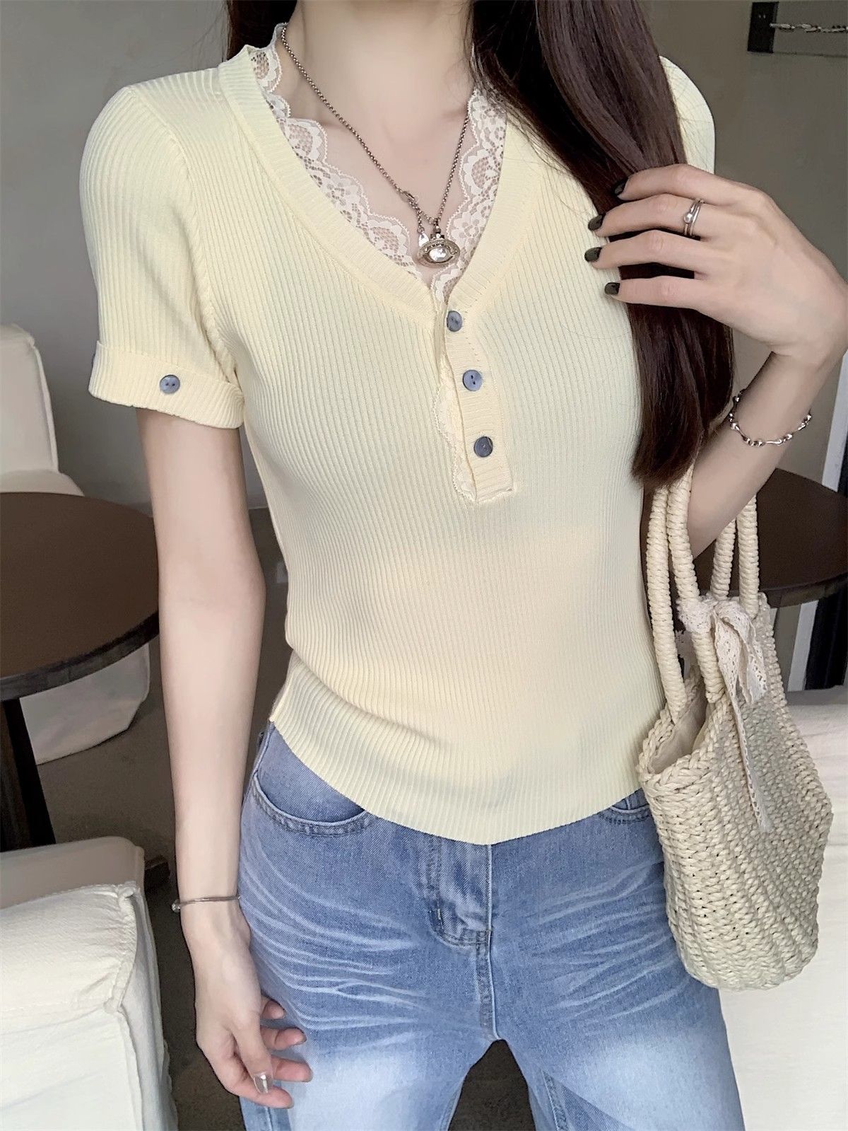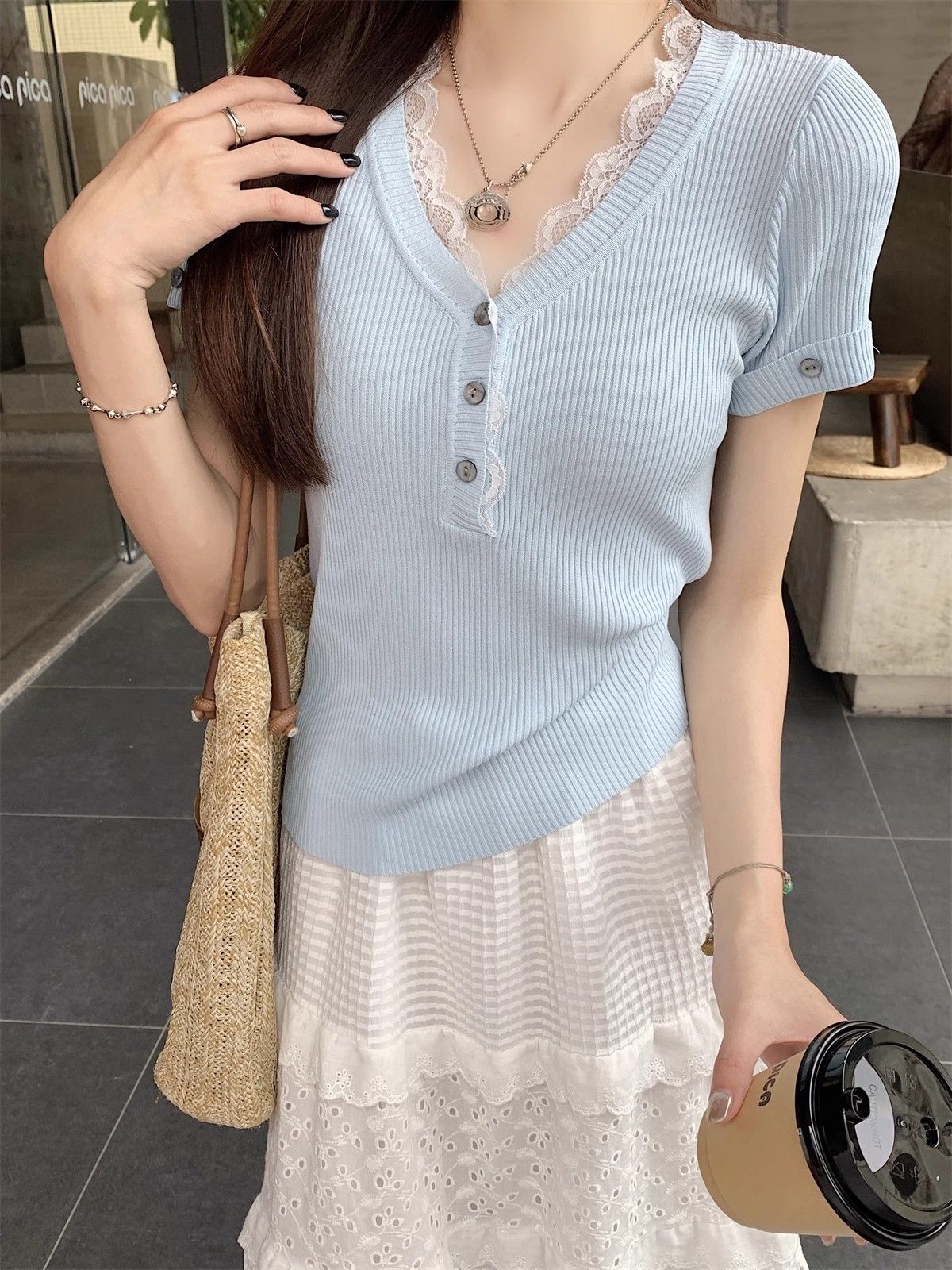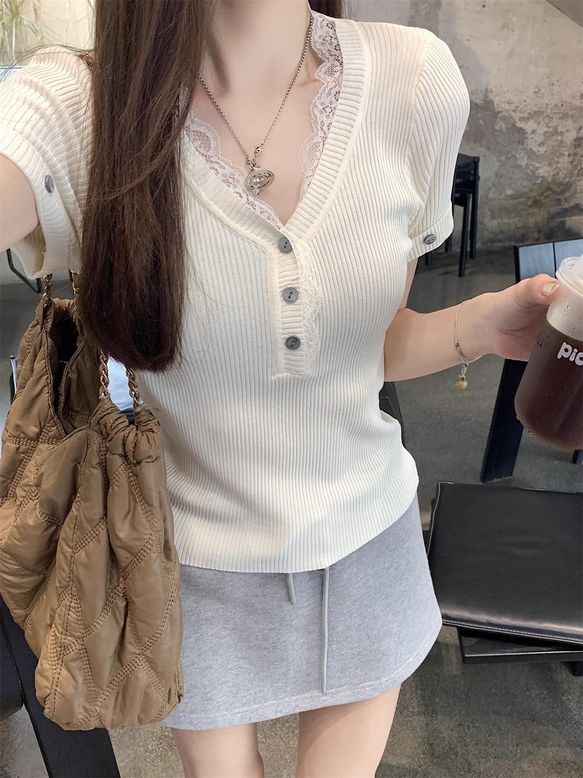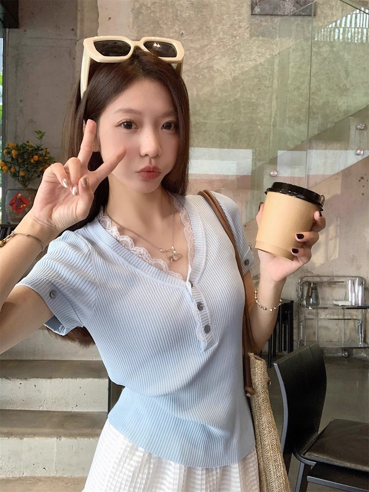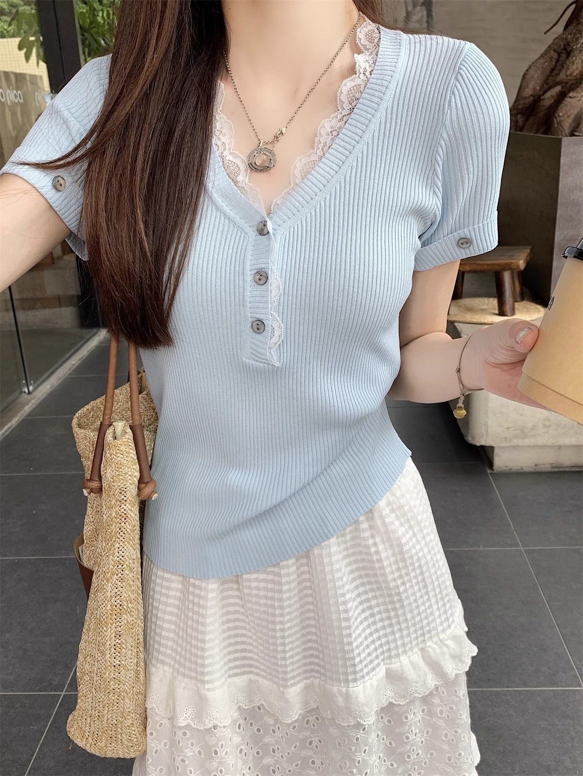한국 스타일 V-넥 레이스 엣지 반소매 티셔츠 여성 여름 2025 새로운 버튼 디자인 순수 욕망 니트 셔츠 캐주얼 탑스토어 가기