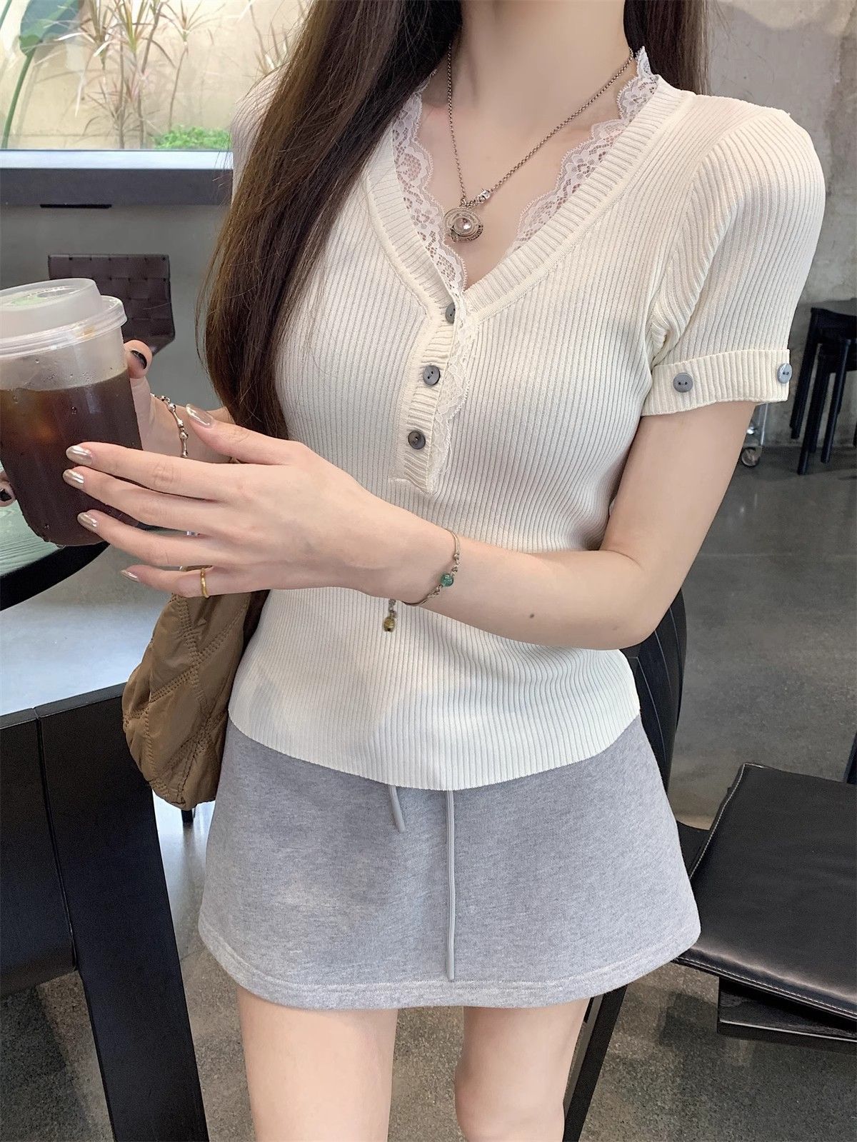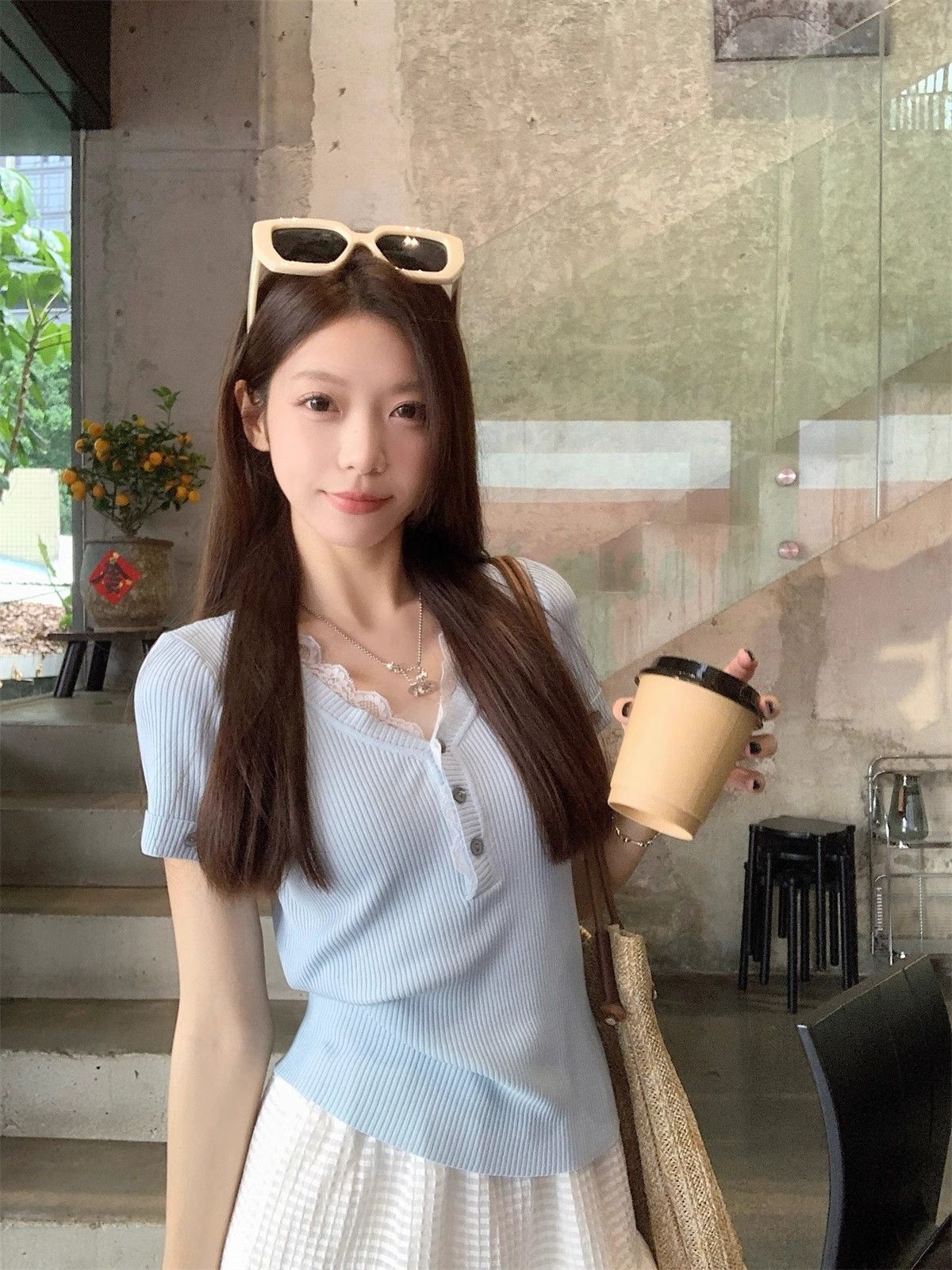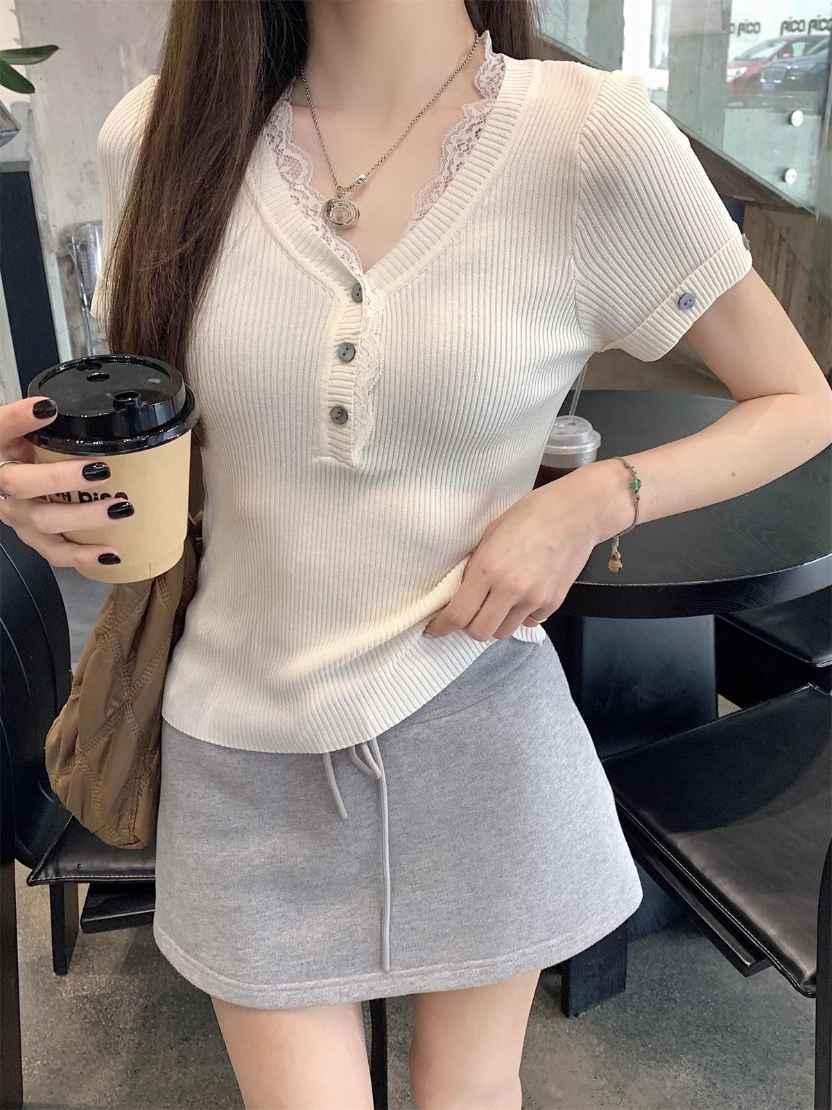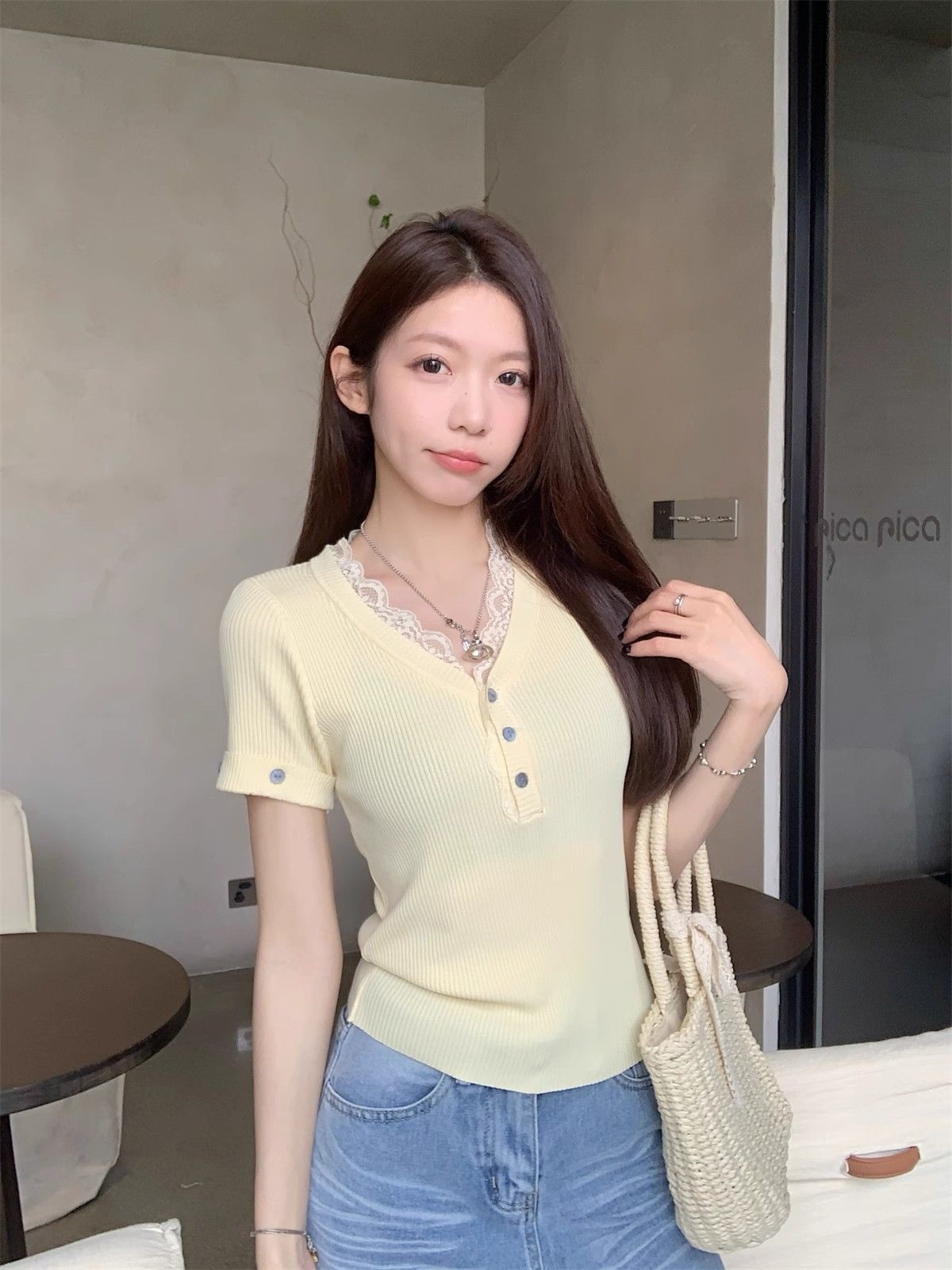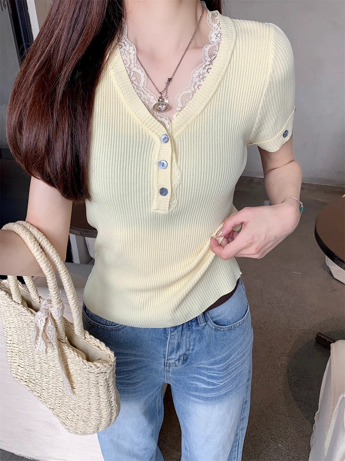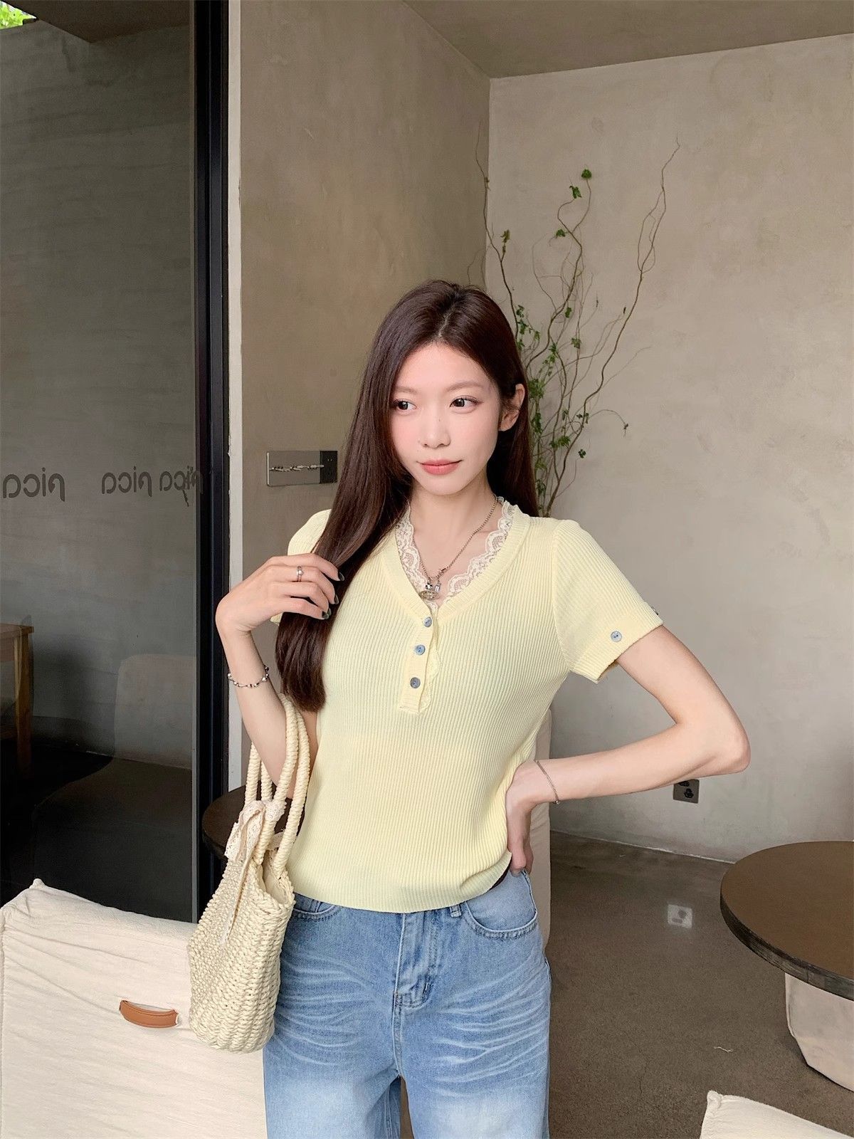 한국 스타일 V-넥 레이스 엣지 반소매 티셔츠 여성 여름 2025 새로운 버튼 디자인 순수 욕망 니트 셔츠 캐주얼 탑스토어 가기