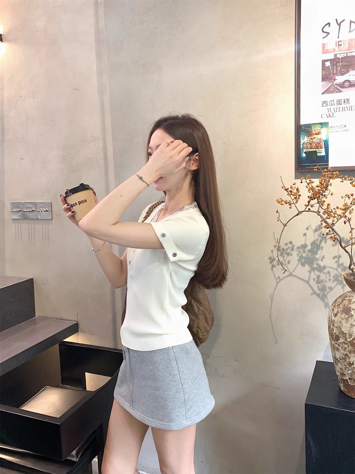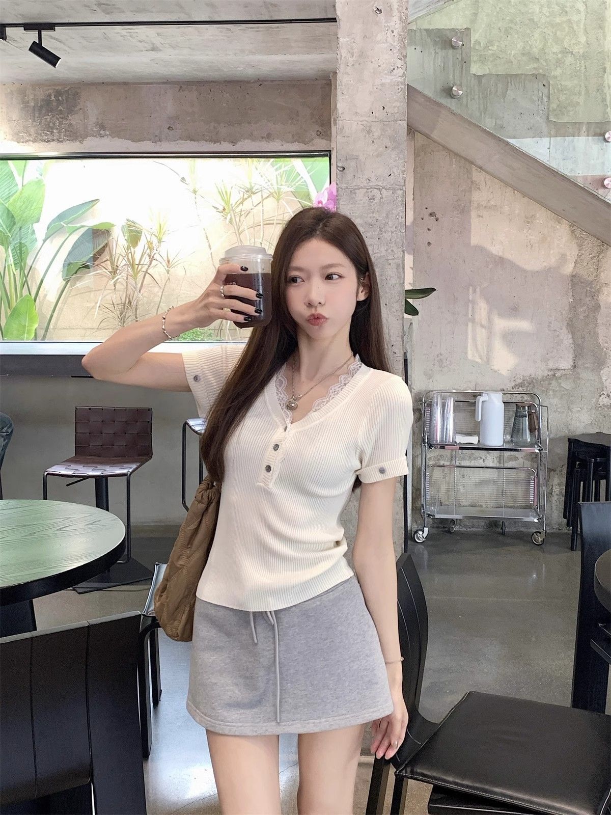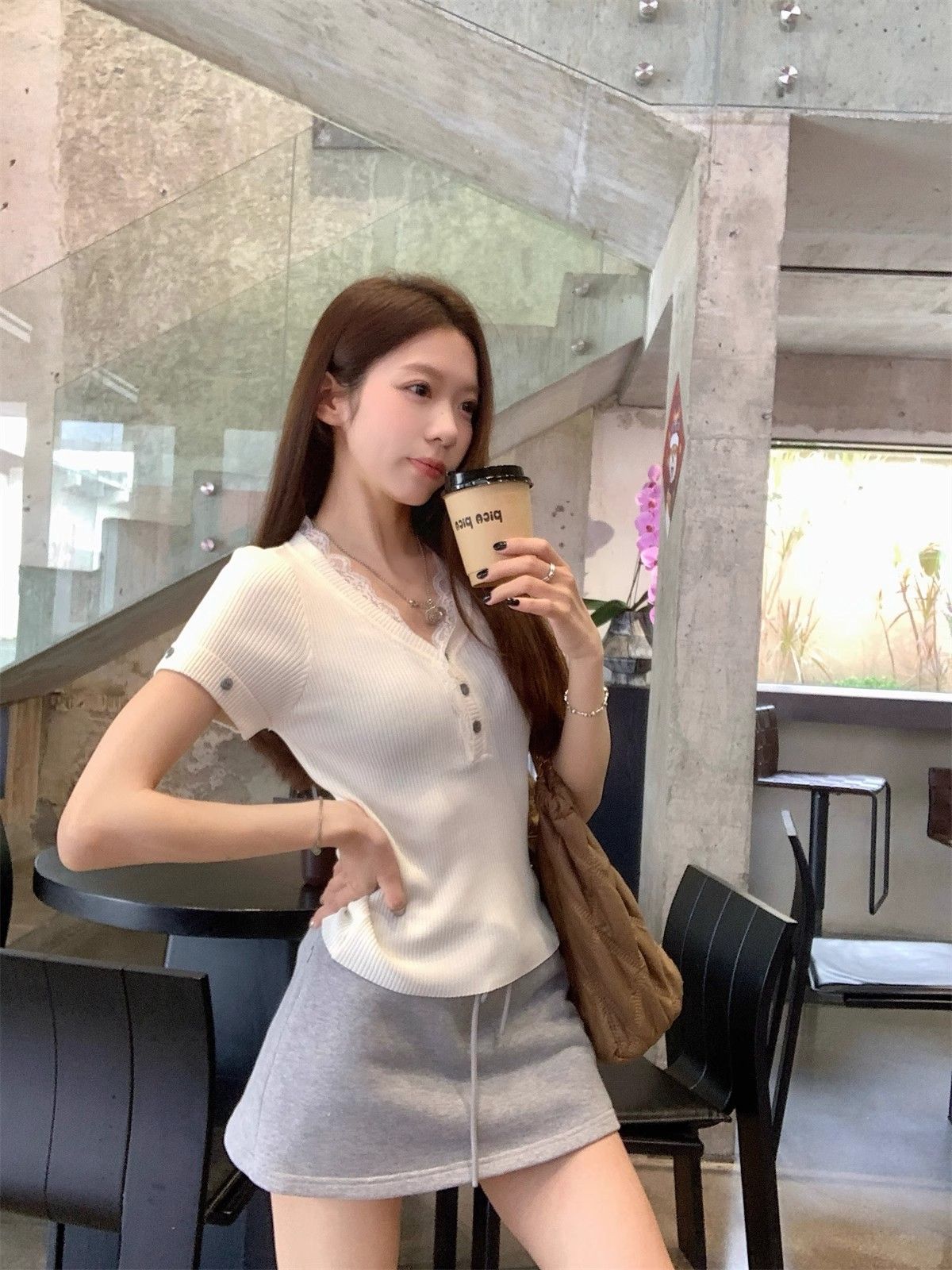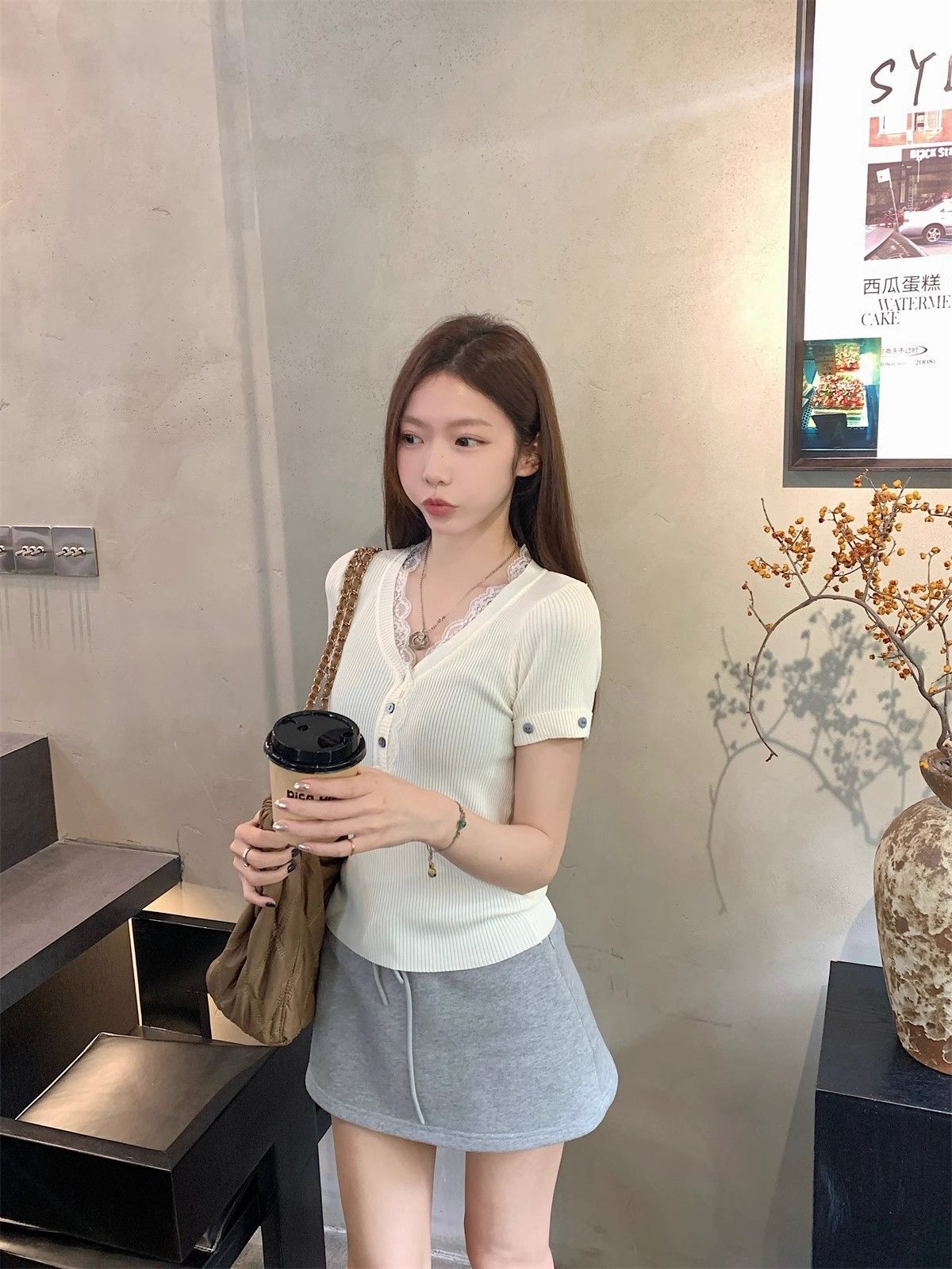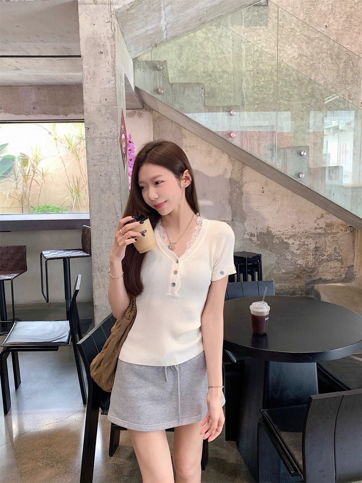 한국 스타일 V-넥 레이스 엣지 반소매 티셔츠 여성 여름 2025 새로운 버튼 디자인 순수 욕망 니트 셔츠 캐주얼 탑스토어 가기