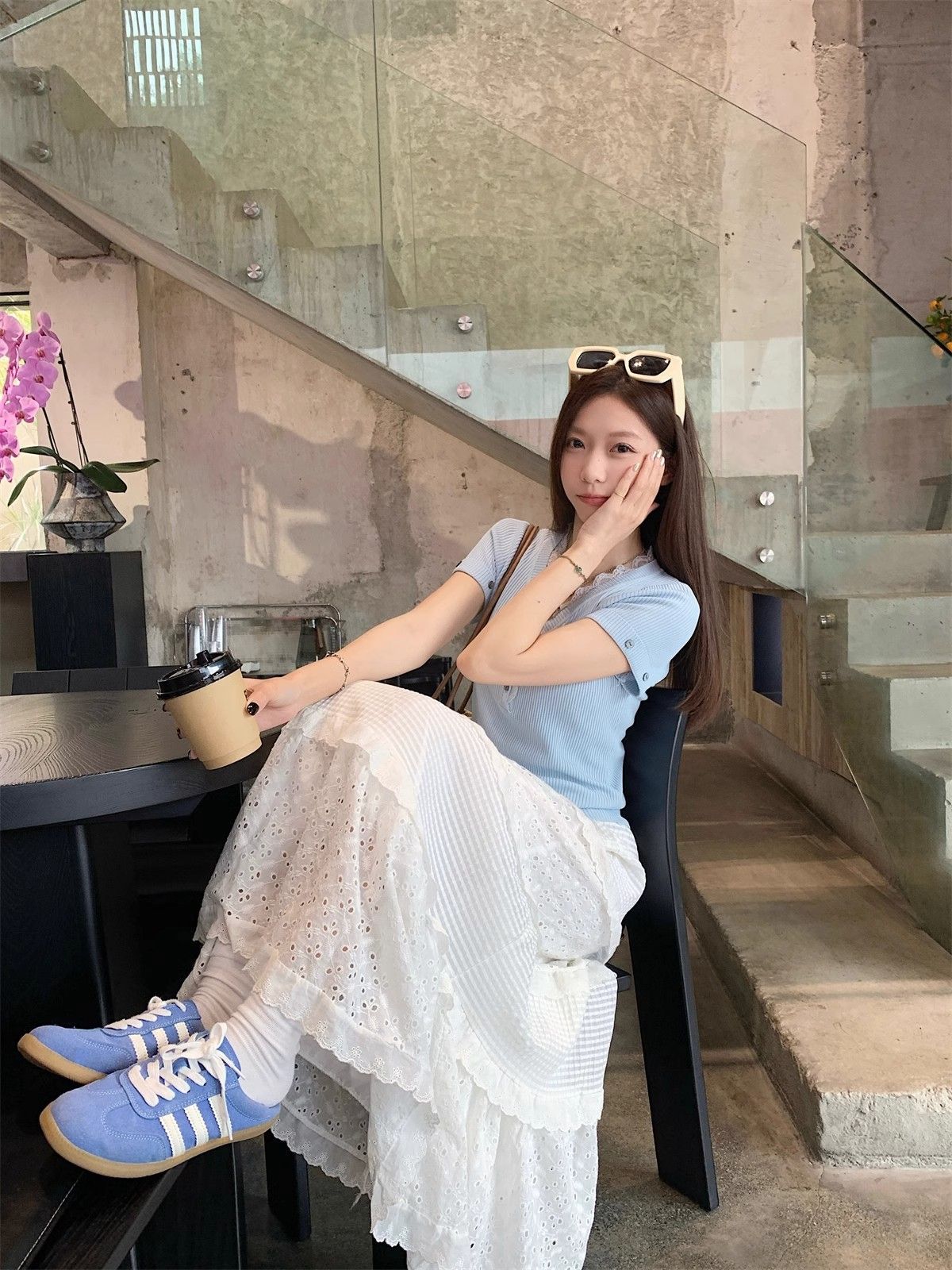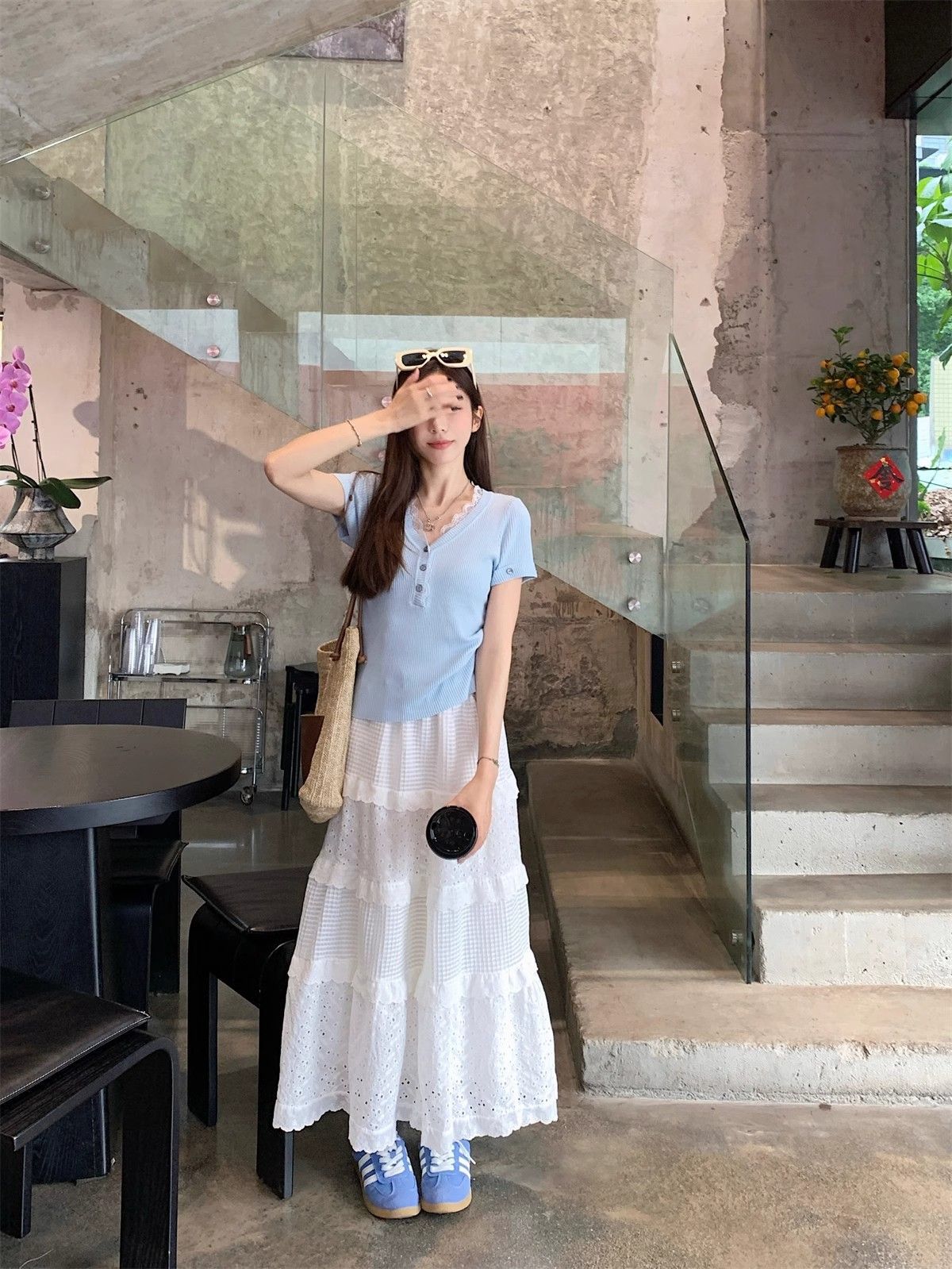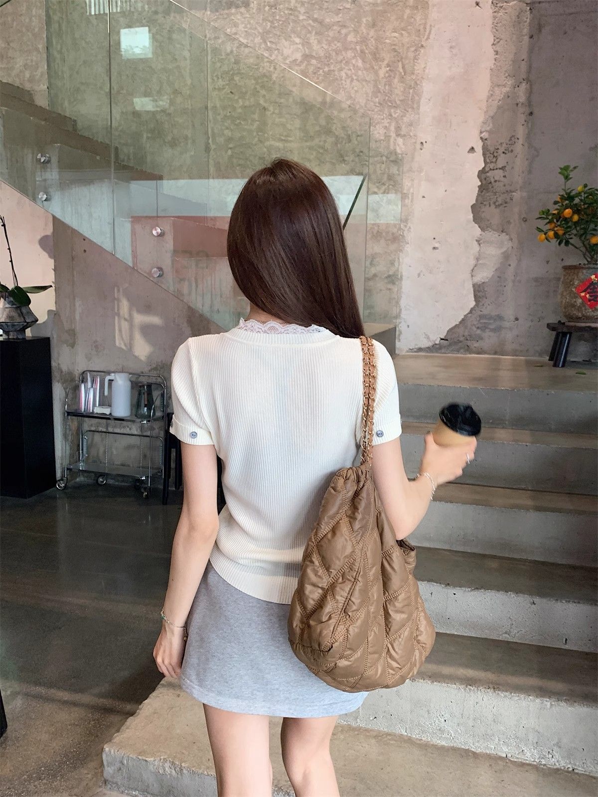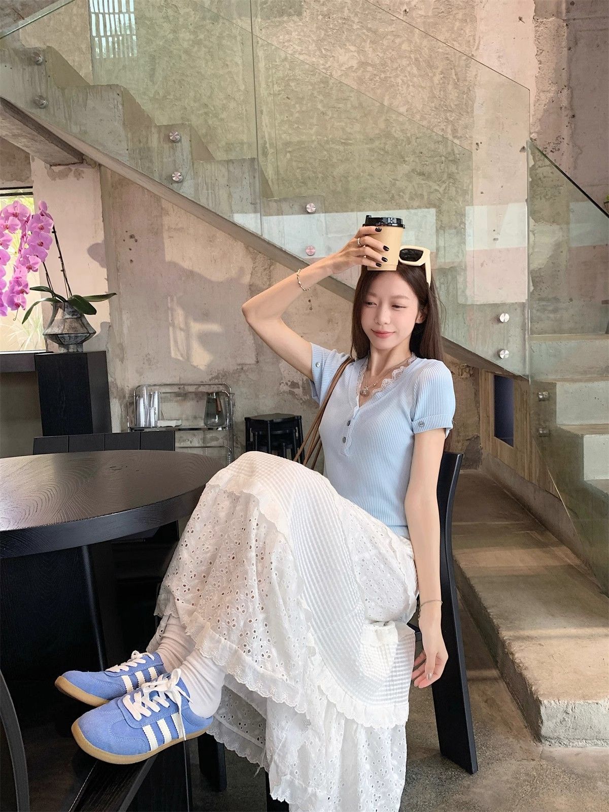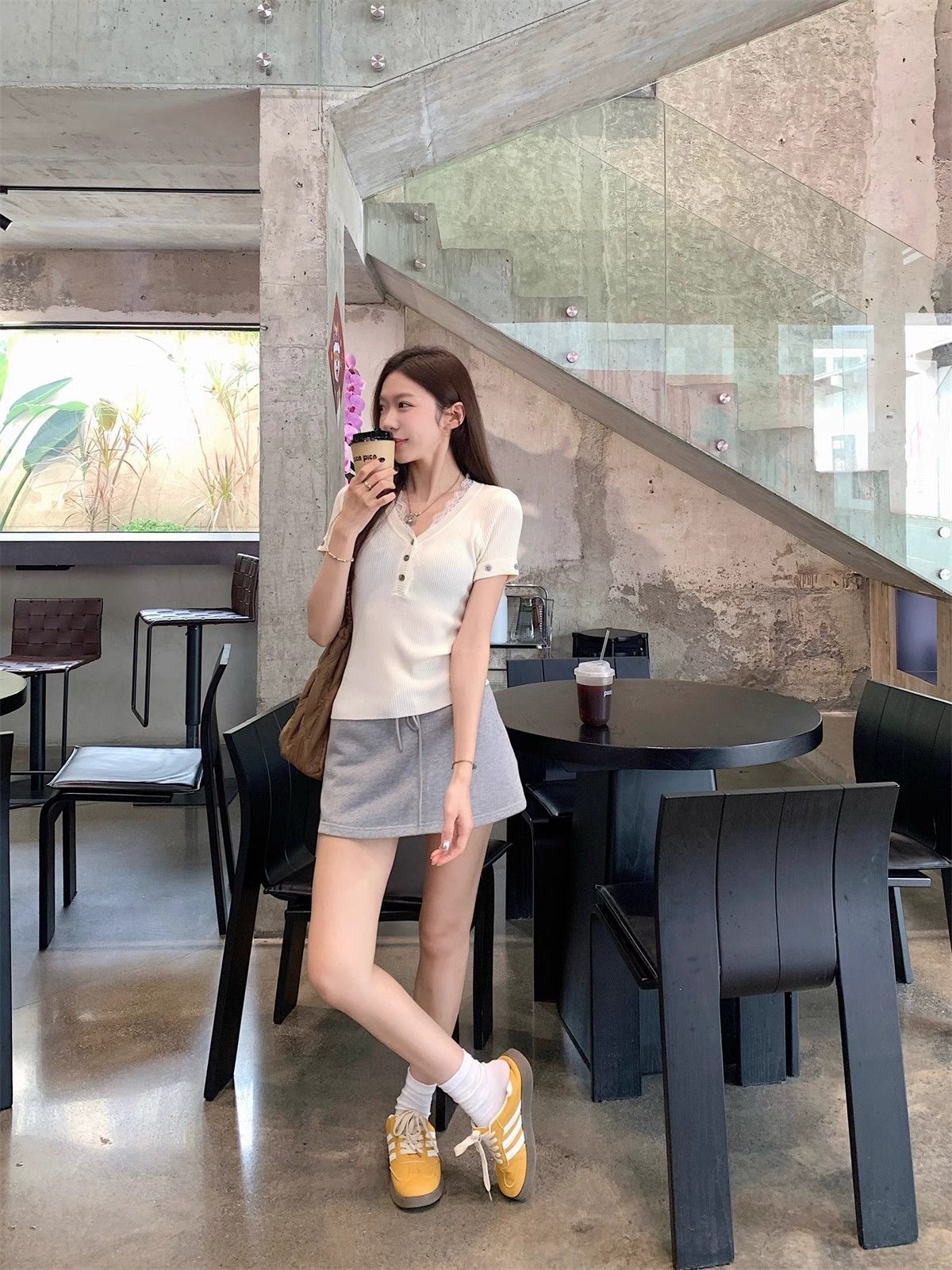 한국 스타일 V-넥 레이스 엣지 반소매 티셔츠 여성 여름 2025 새로운 버튼 디자인 순수 욕망 니트 셔츠 캐주얼 탑스토어 가기
