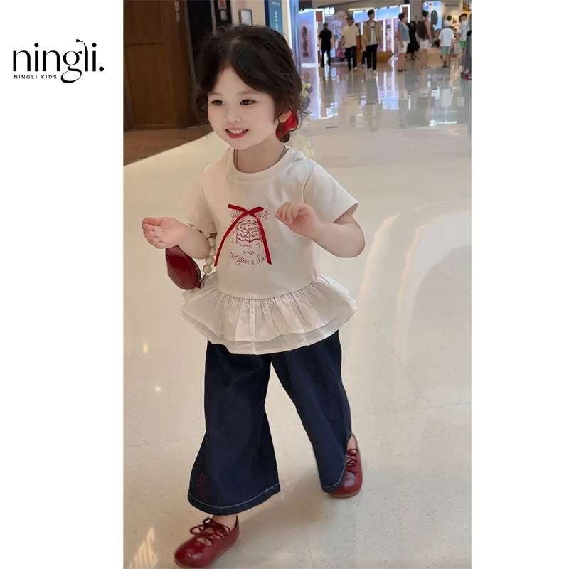 블랙 스완! 라임 소녀의 한국 스타일 세트 2025 여름 새로운 러플 조끼 아기 소녀의 마이크로 팬츠스토어 가기
