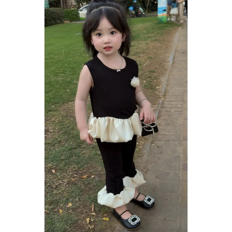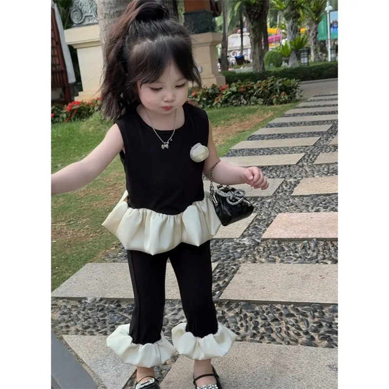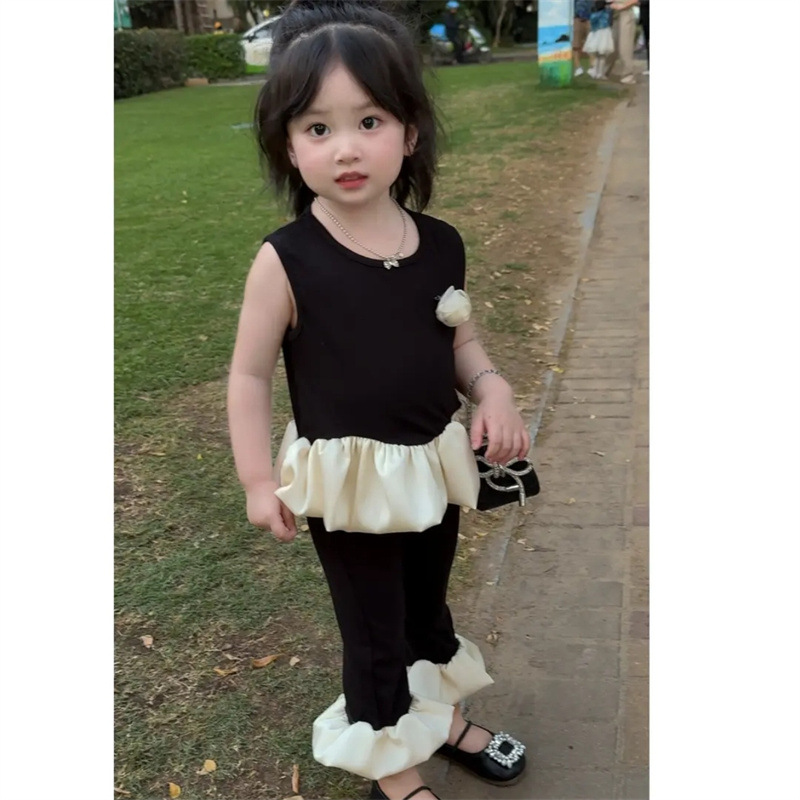 블랙 스완! 라임 소녀의 한국 스타일 세트 2025 여름 새로운 러플 조끼 아기 소녀의 마이크로 팬츠