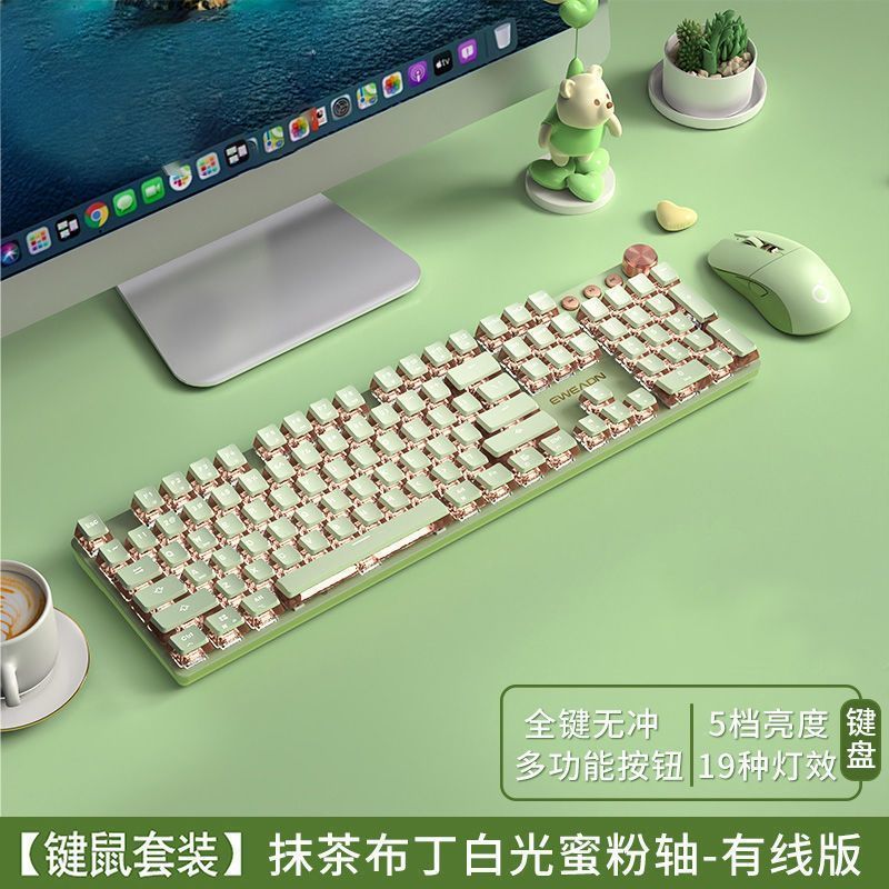 • 파우더 샤프트 [가벼운 느낌 - 편안한 마작 소리] - [키보드 및 마우스 세트] 말차 푸딩 - 백색광 유선 스타일 - 104 키