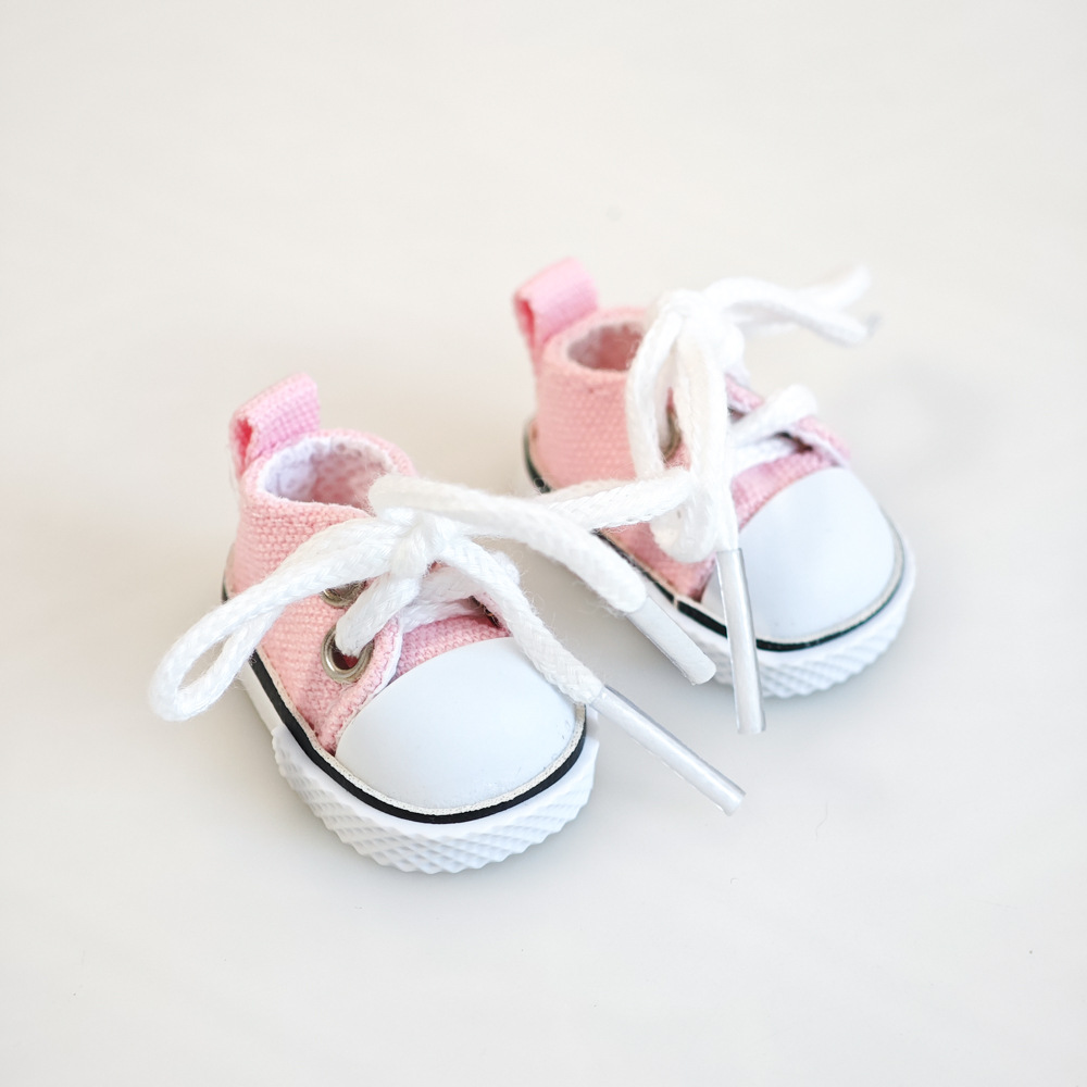 • 핑크 트라이앵글 멜빵바지 + 핑크 트라이앵글 모자 + 투명 프레임 그라데이션 퍼플 안경 + 핑크 캔버스 슈즈