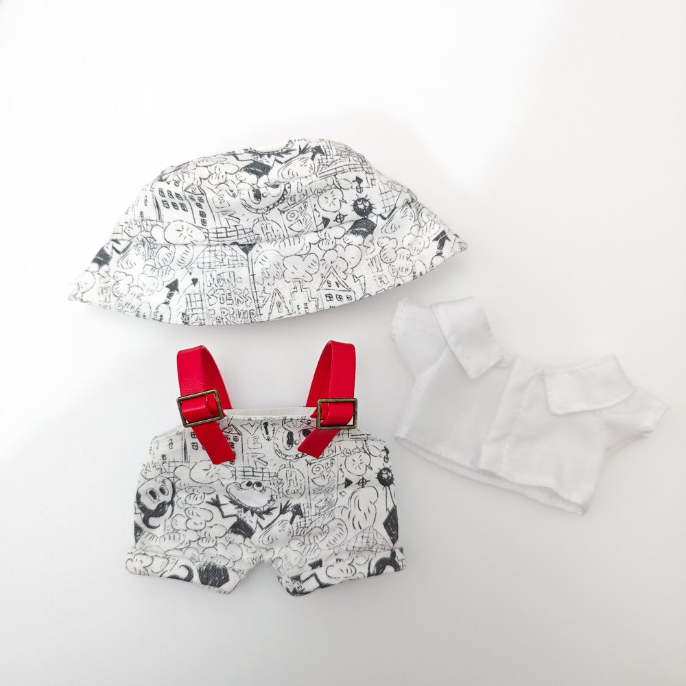 • 그래피티 3종세트 (버킷햇에 작은 꽃이 달려있습니다 + 멜빵바지 + 레드 캔버스 슈즈)