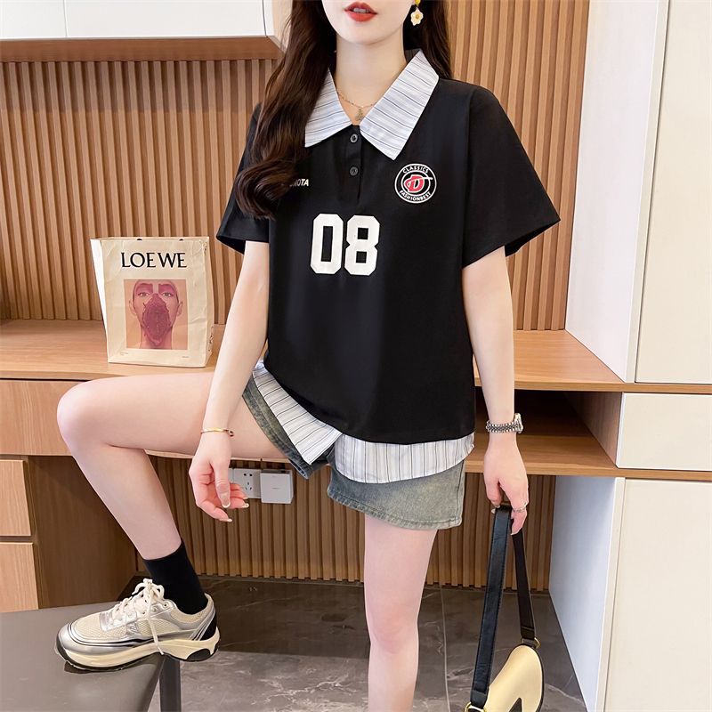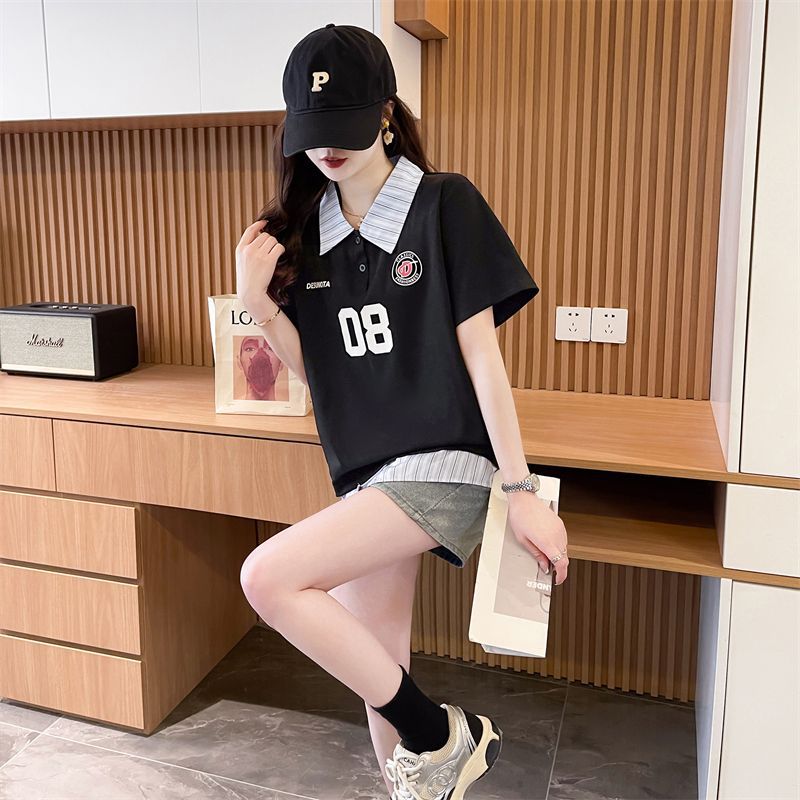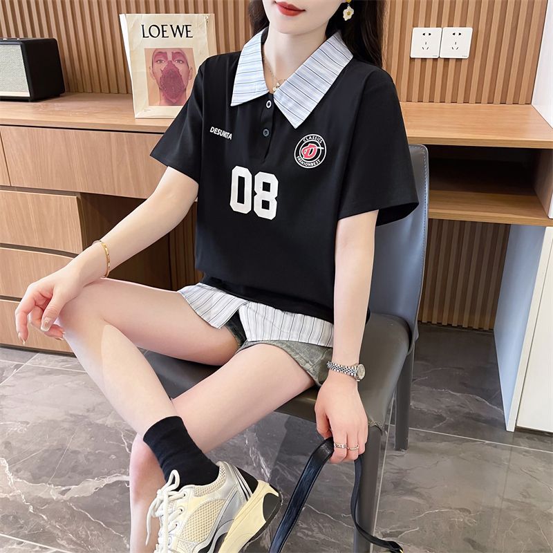 어깨 반팔 티셔츠 여성 여름 2025 새로운 한국 스타일 느슨한 디자인 센스 틈새 가짜 투피스 셔츠 칼라 탑