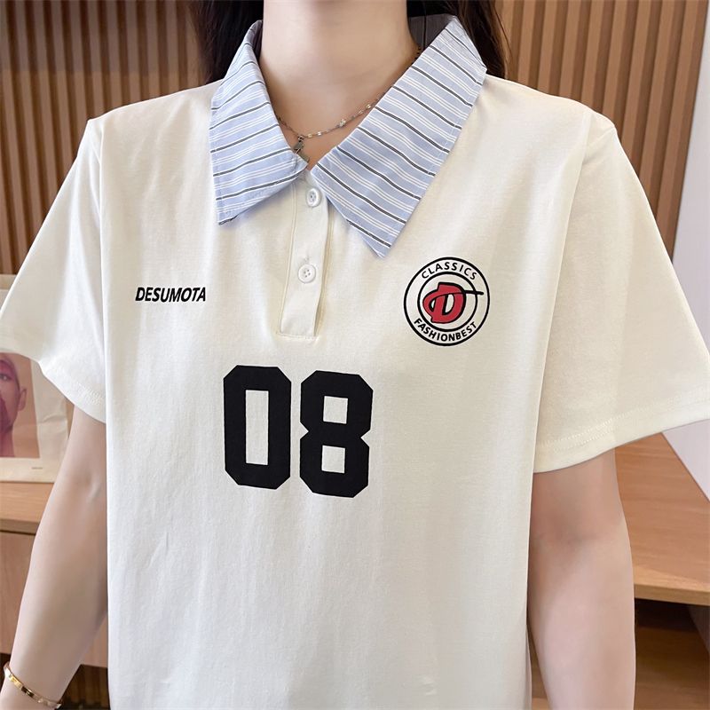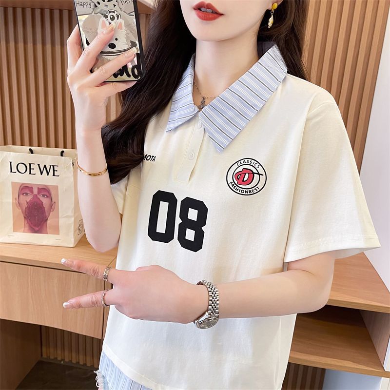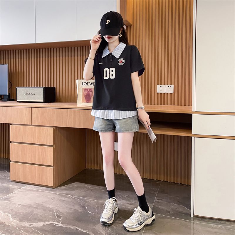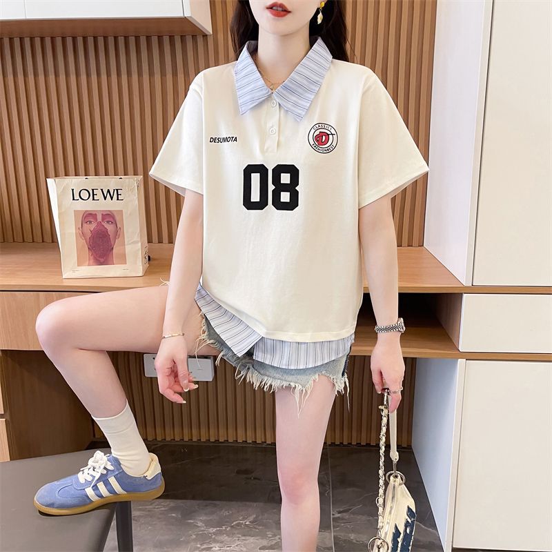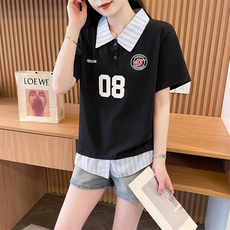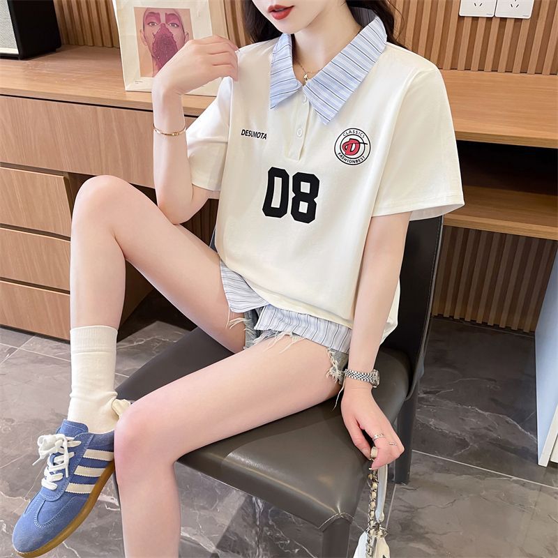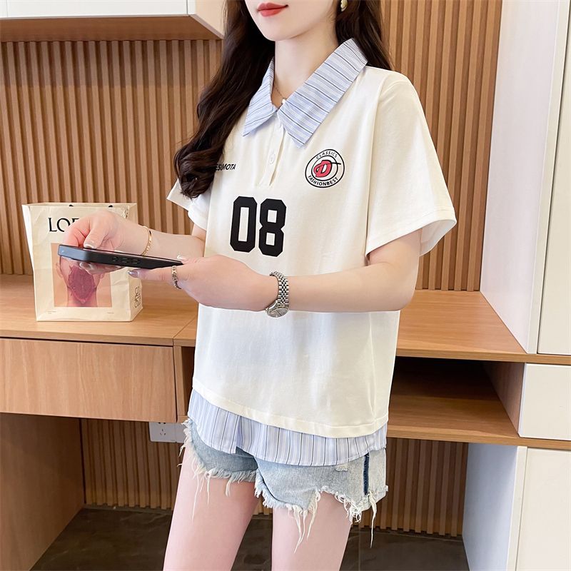 어깨 반팔 티셔츠 여성 여름 2025 새로운 한국 스타일 느슨한 디자인 센스 틈새 가짜 투피스 셔츠 칼라 탑스토어 가기